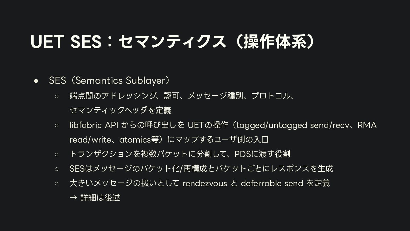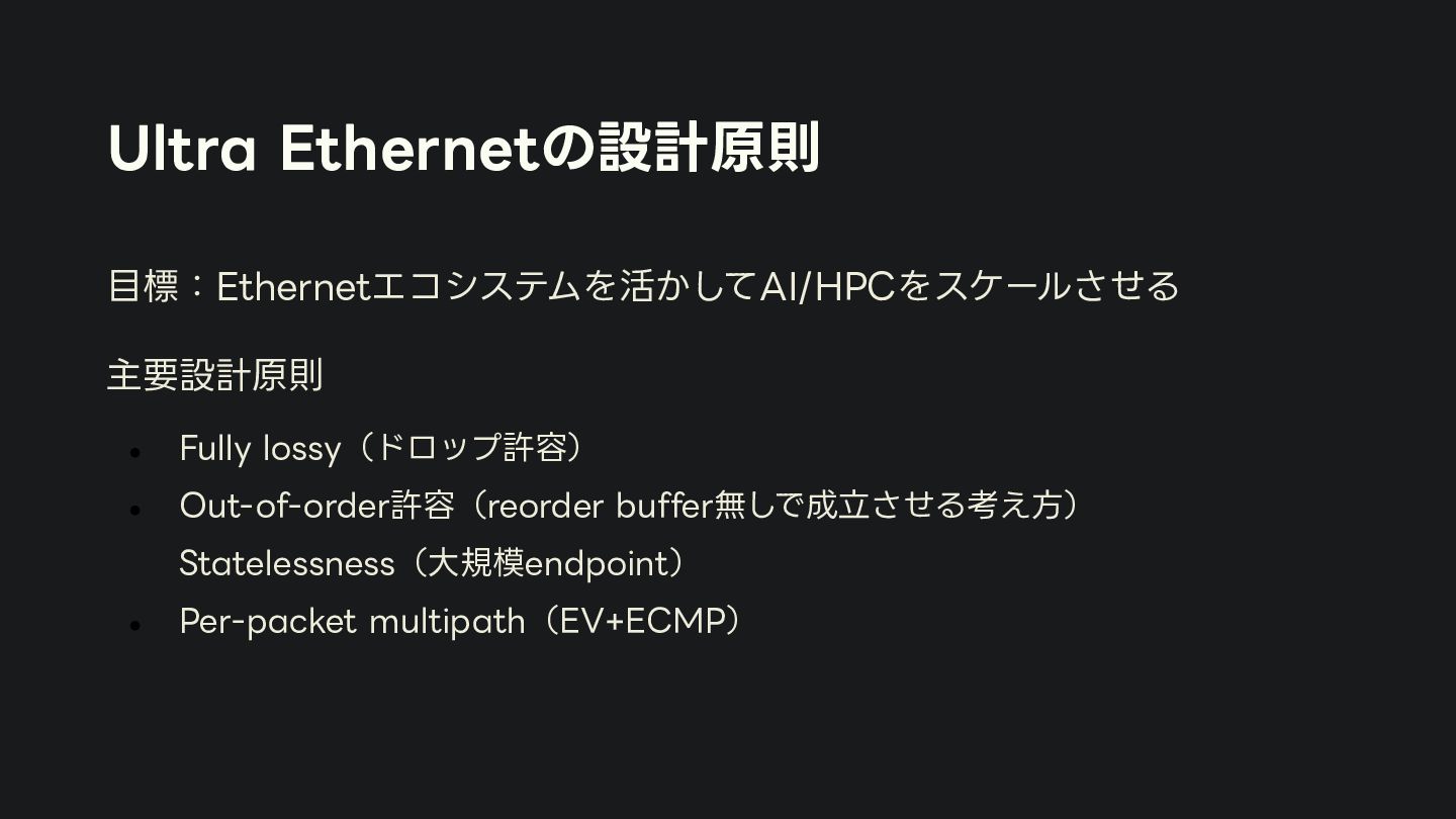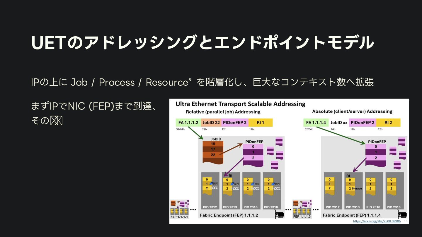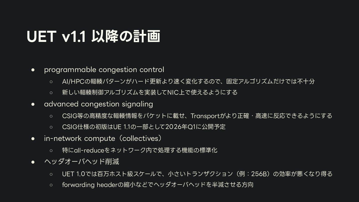 • AI Base:*CCL, UDのサポート • AI Full:学習と推論アプリケーション • HPC:広範なHPCアプリケーション OFA 2025 Webinar Series Webinar #1 - Libfabric: Getting Started with Ultra Ethernet https://www.youtube.com/watch?v=cgiGbny5vdo