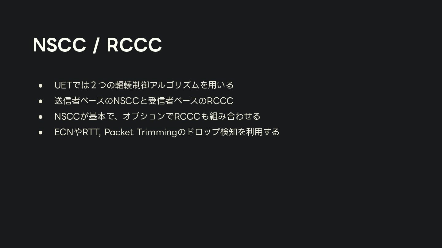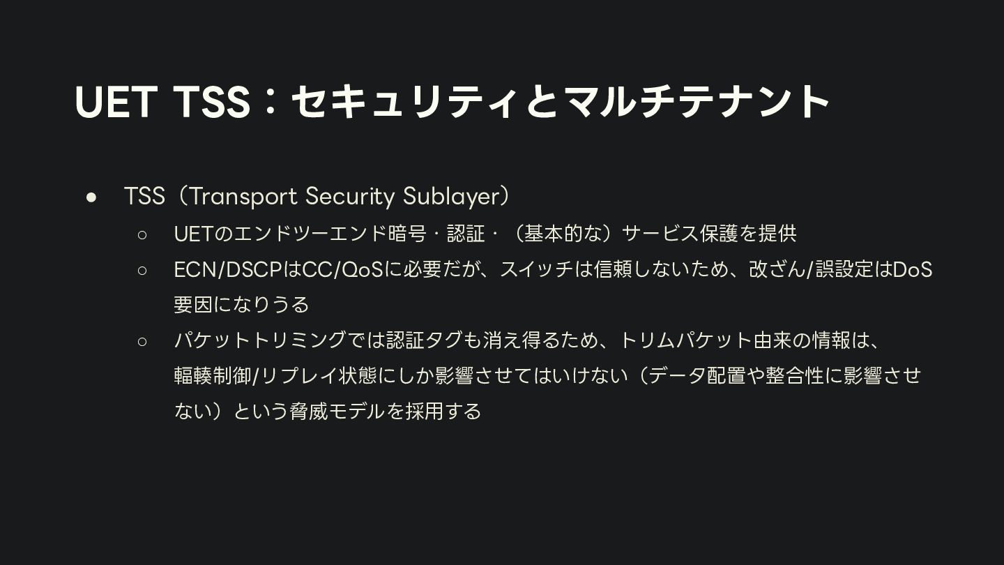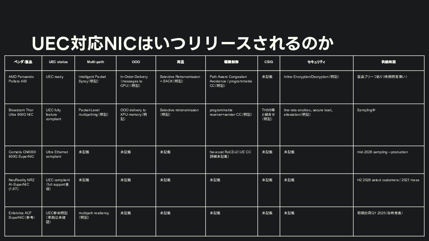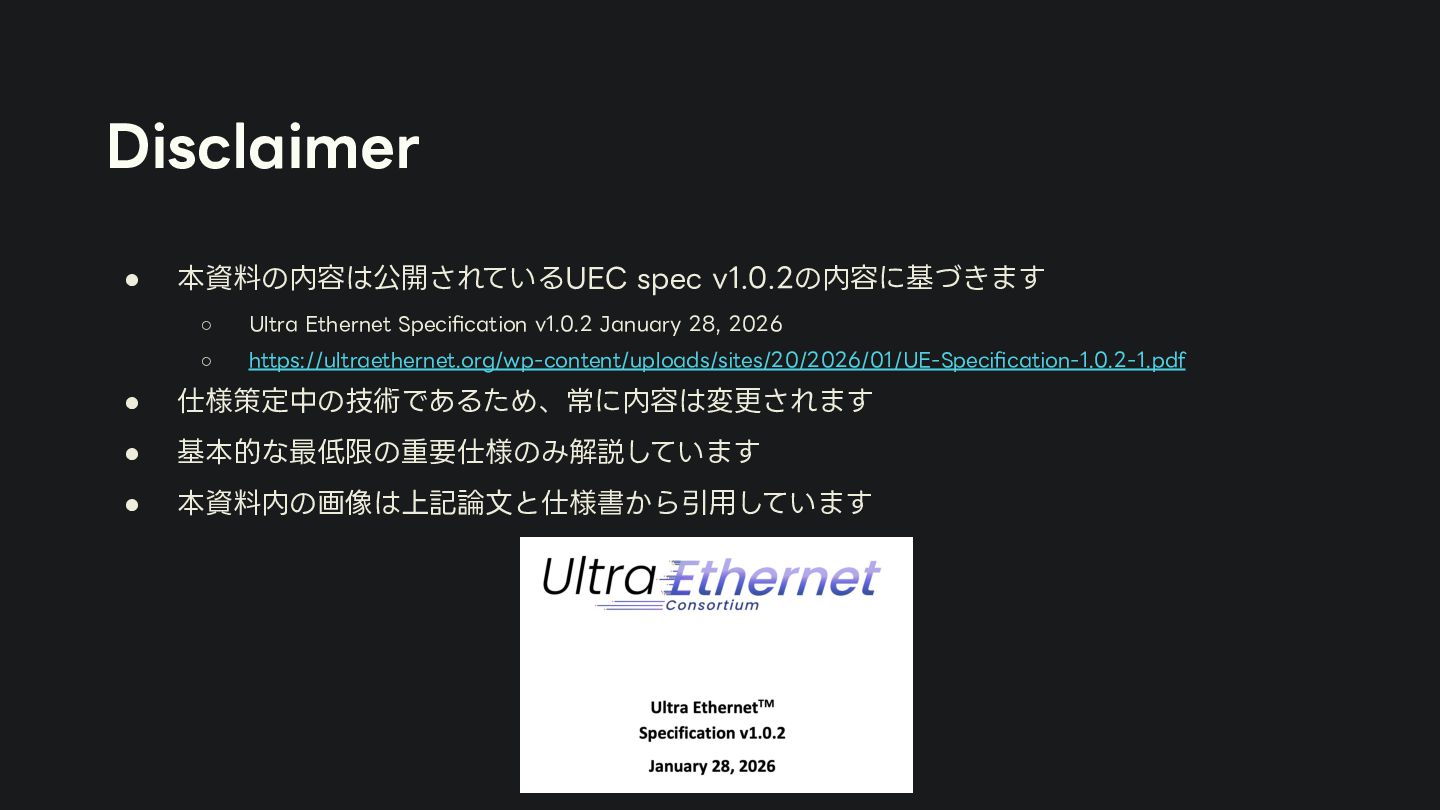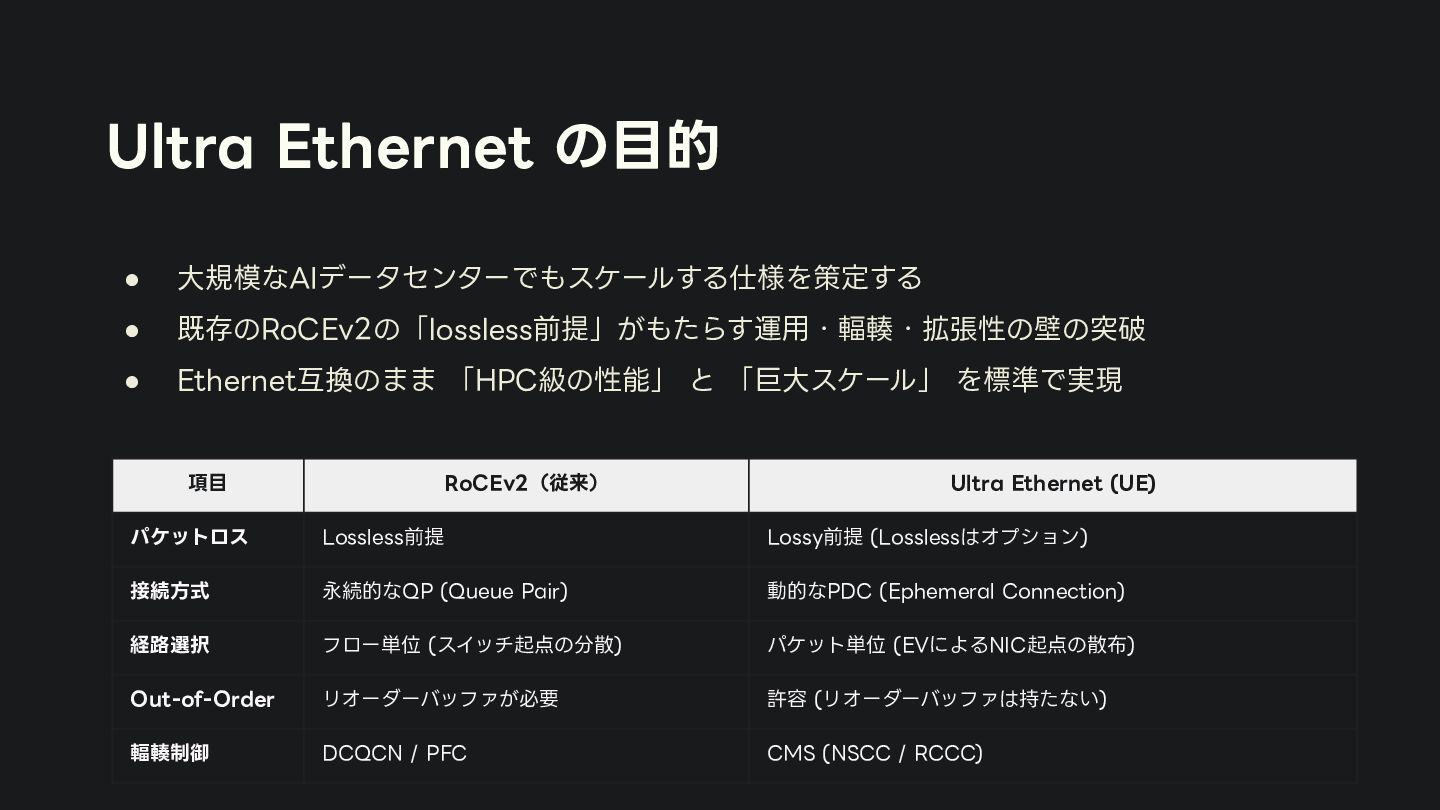 • AI Base:*CCL, UDのサポート • AI Full:学習と推論アプリケーション • HPC:広範なHPCアプリケーション OFA 2025 Webinar Series Webinar #1 - Libfabric: Getting Started with Ultra Ethernet https://www.youtube.com/watch?v=cgiGbny5vdo