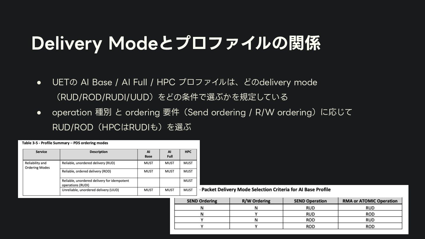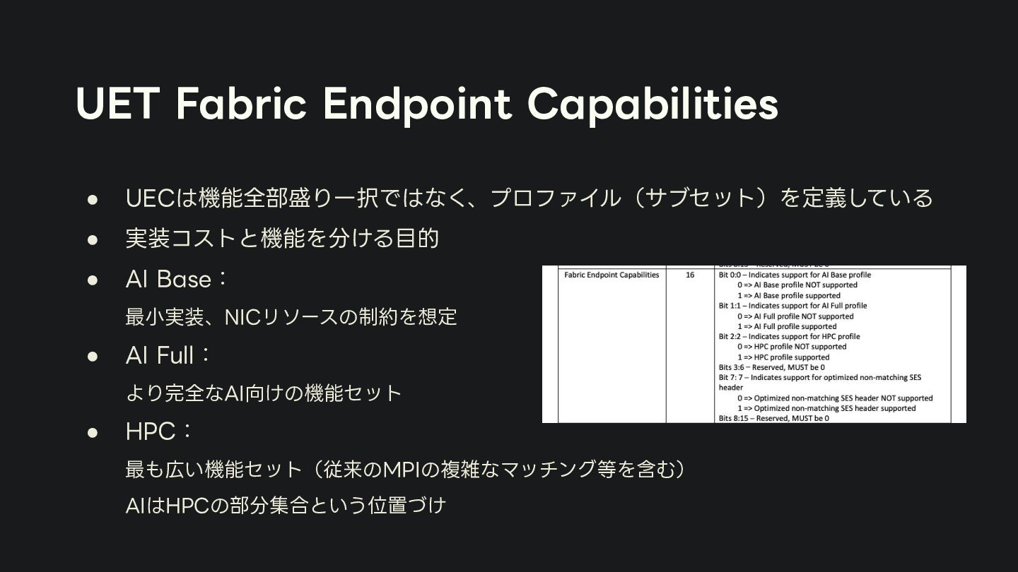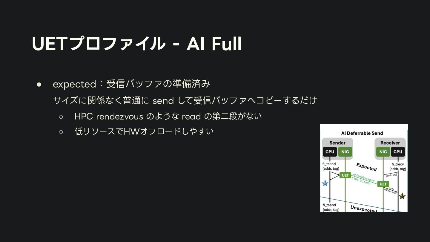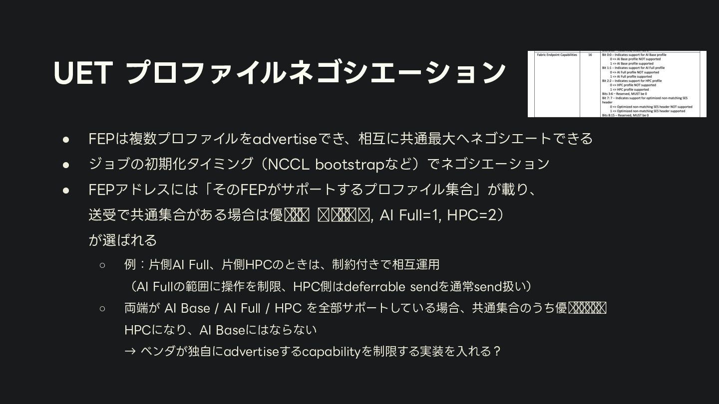Base=0, AI Full=1, HPC=2) が選ばれる ◦ 例:⽚側AI Full、⽚側HPCのときは、制約付きで相互運⽤ (AI Fullの範囲に操作を制限、HPC側はdeferrable sendを通常send扱い) ◦ 両端が AI Base / AI Full / HPC を全部サポートしている場合、共通集合のうち優先度が⼀番⾼い HPCになり、AI Baseにはならない → ベンダが独⾃にadvertiseするcapabilityを制限する実装を⼊れる?