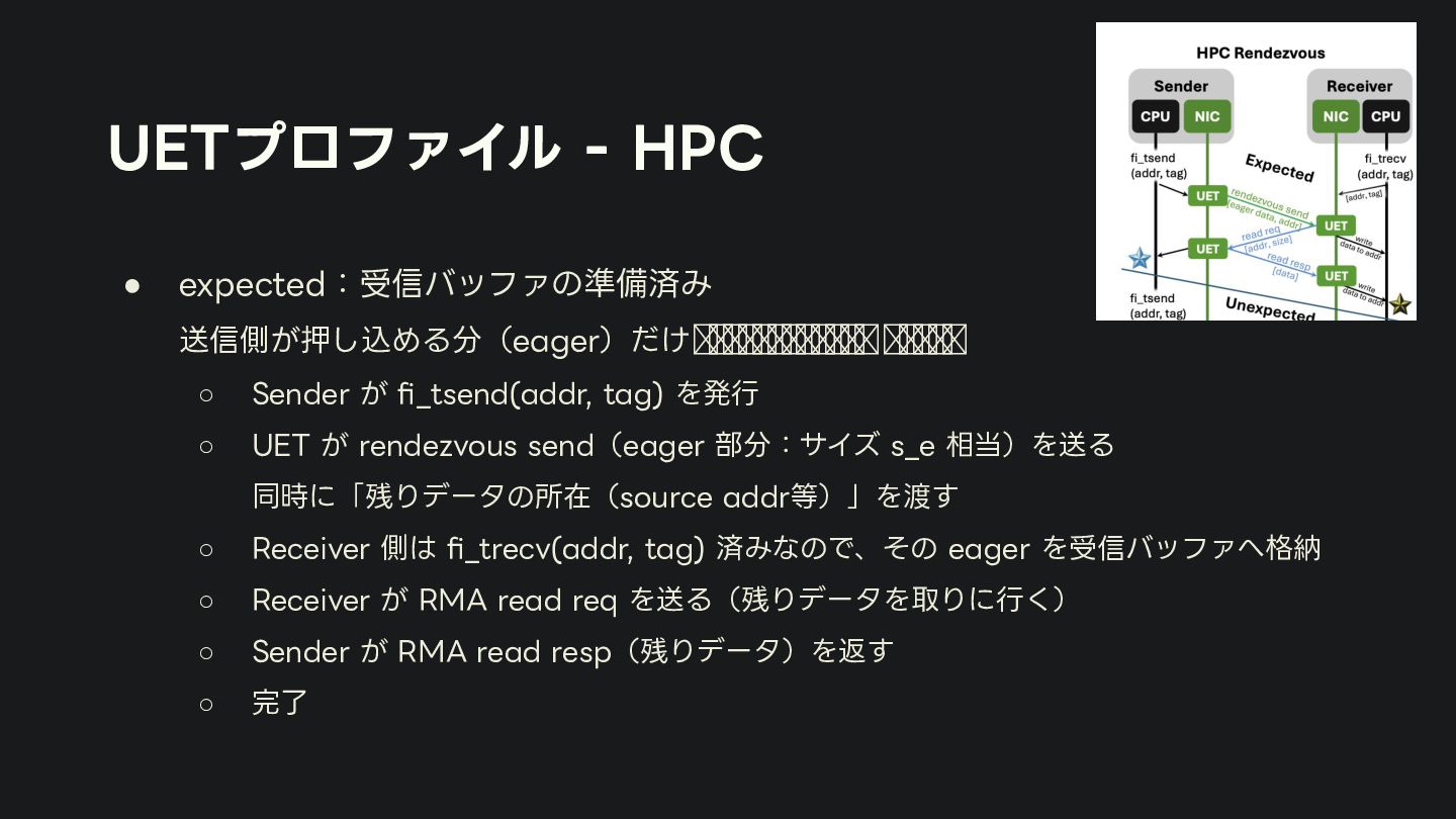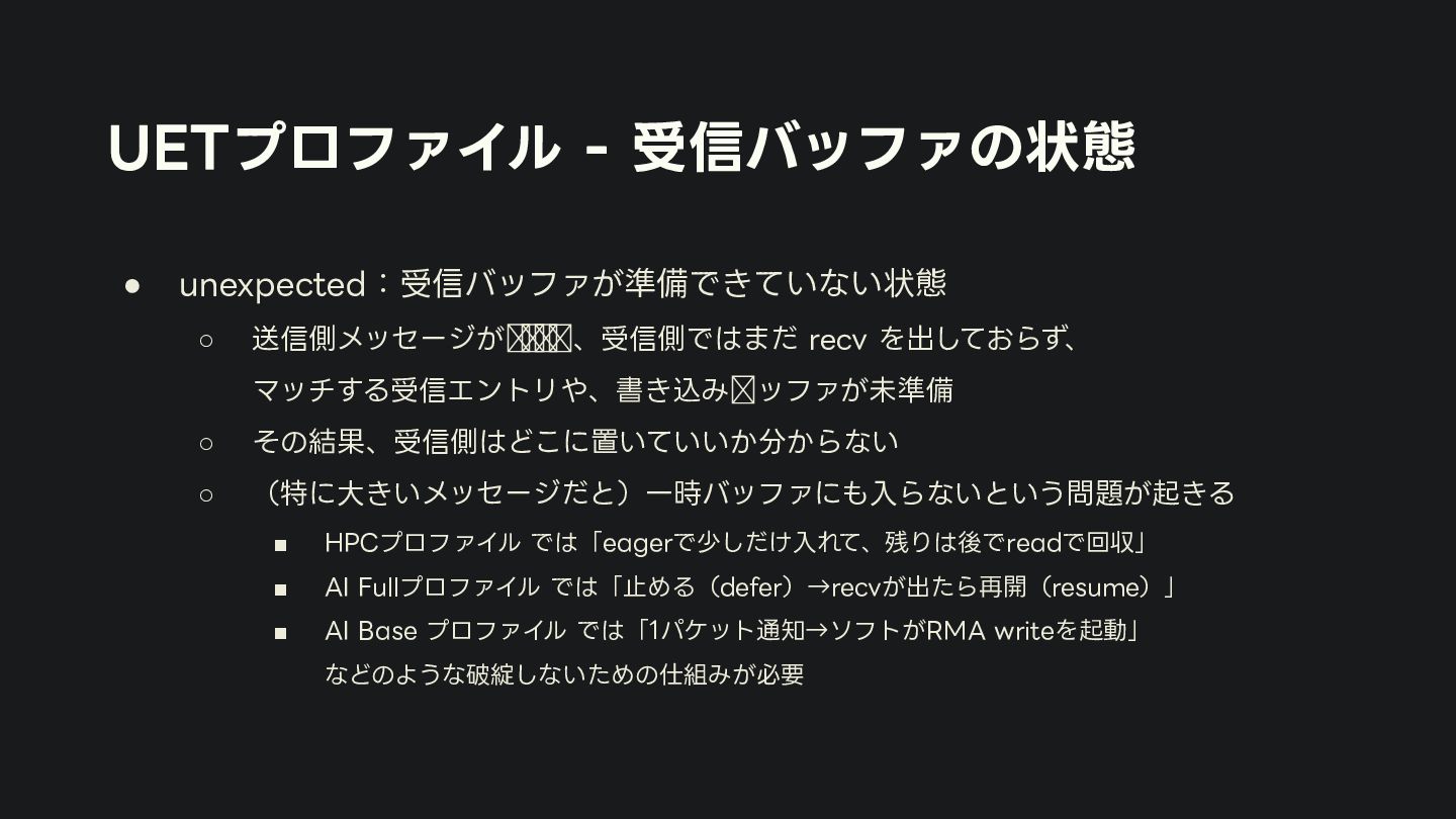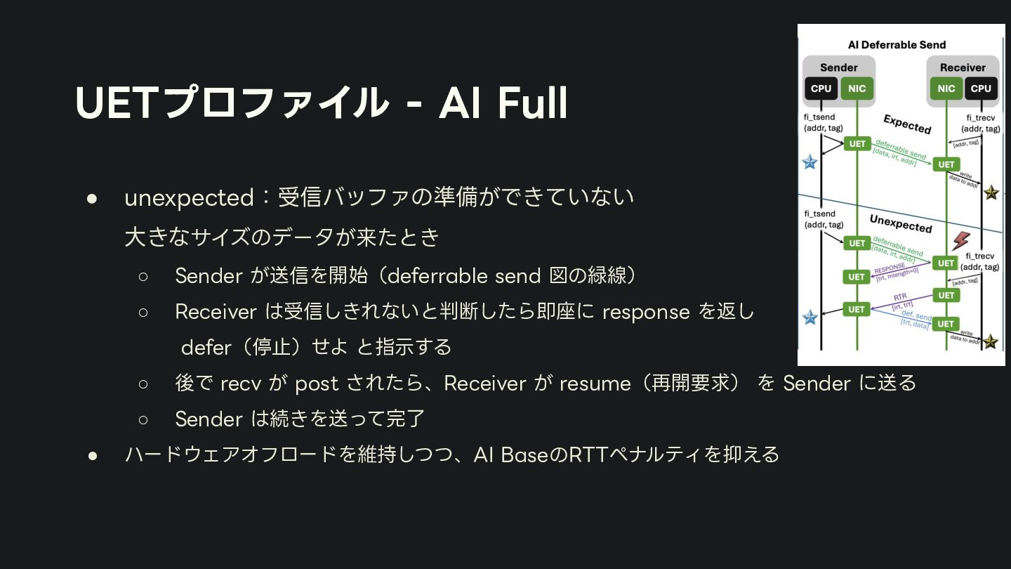 Base=0, AI Full=1, HPC=2) が選ばれる ◦ 例:⽚側AI Full、⽚側HPCのときは、制約付きで相互運⽤ (AI Fullの範囲に操作を制限、HPC側はdeferrable sendを通常send扱い) ◦ 両端が AI Base / AI Full / HPC を全部サポートしている場合、共通集合のうち優先度が⼀番⾼い HPCになり、AI Baseにはならない → ベンダが独⾃にadvertiseするcapabilityを制限する実装を⼊れる?