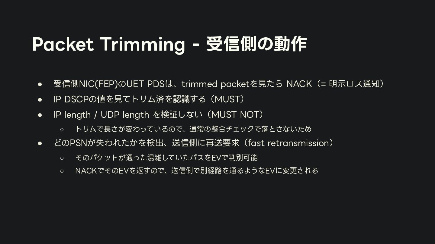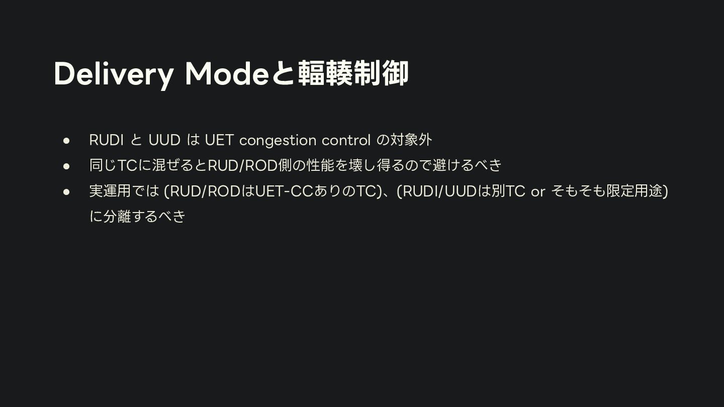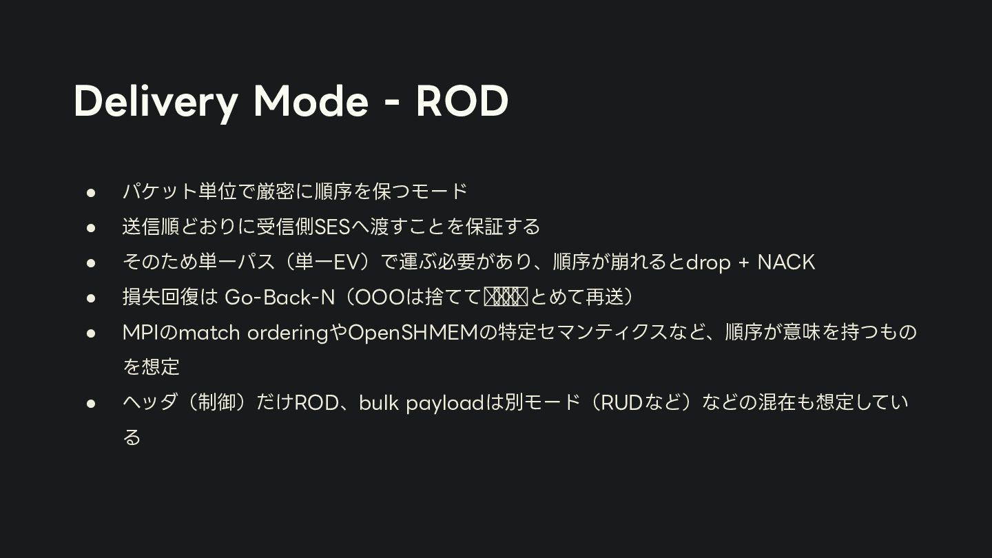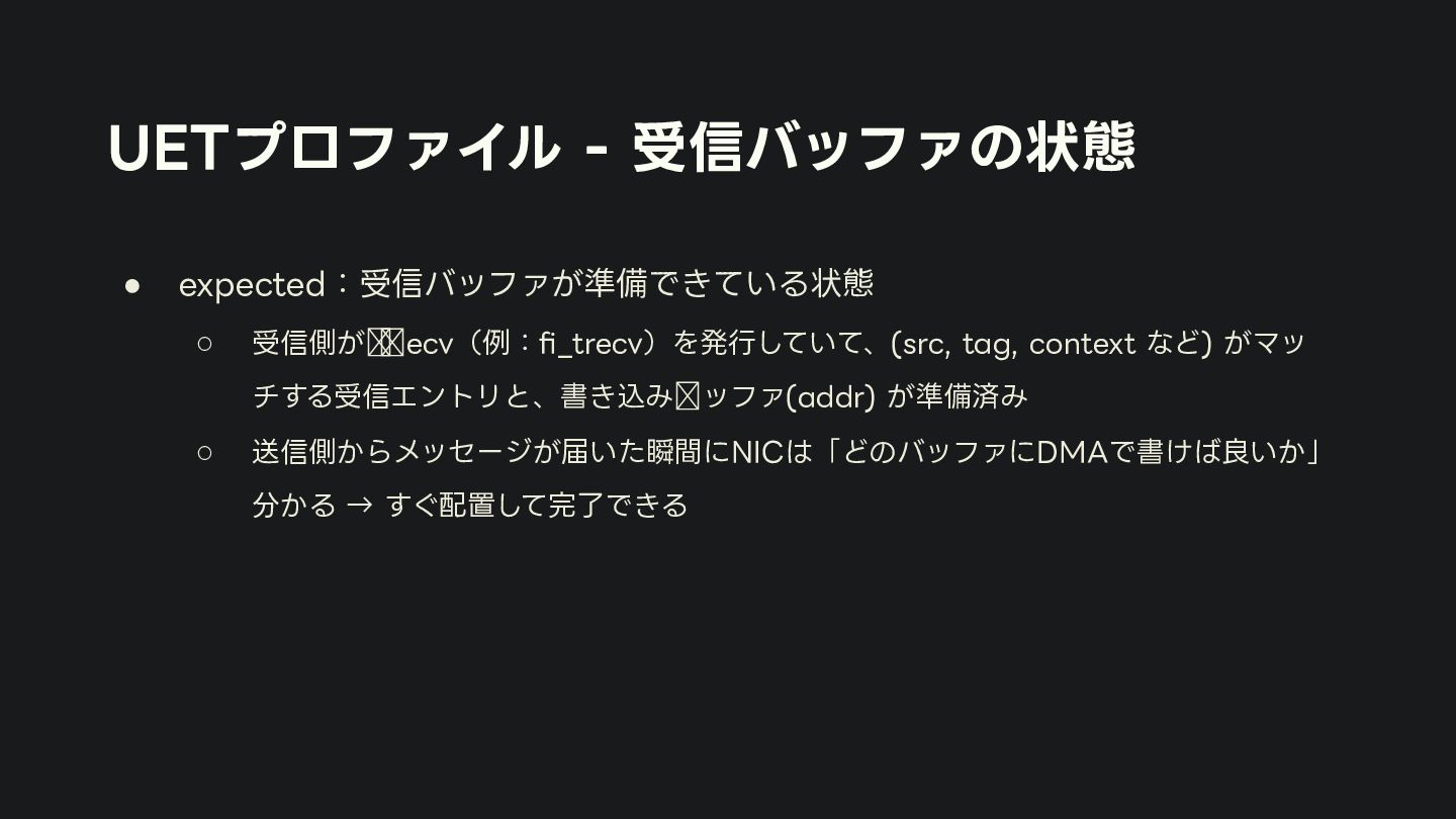 Base=0, AI Full=1, HPC=2) が選ばれる ◦ 例:⽚側AI Full、⽚側HPCのときは、制約付きで相互運⽤ (AI Fullの範囲に操作を制限、HPC側はdeferrable sendを通常send扱い) ◦ 両端が AI Base / AI Full / HPC を全部サポートしている場合、共通集合のうち優先度が⼀番⾼い HPCになり、AI Baseにはならない → ベンダが独⾃にadvertiseするcapabilityを制限する実装を⼊れる?