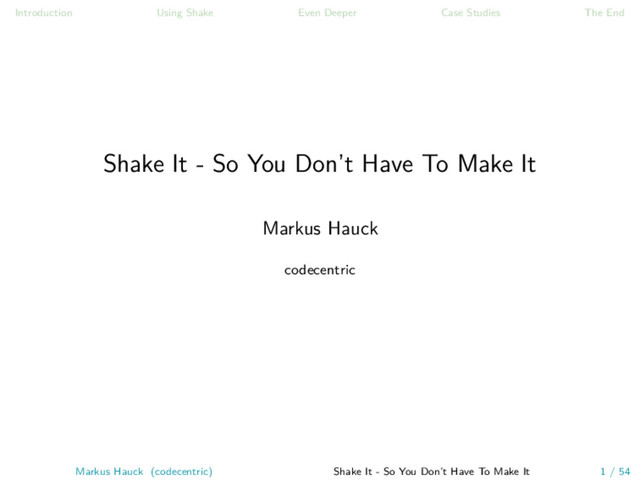 Studies • presentations using reveal.js or LaTeX • images are created somehow (graphviz, download) • haskell code is checked via hlint • write in markdown, convert via pandoc • build both beamer and reveal.js presentation • developing RAWs for photography Markus Hauck (codecentric) Shake It - So You Don’t Have To Make It 43 / 54