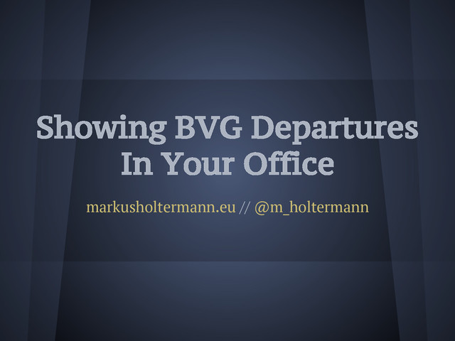 In [2]: resp = ActualDepartureQueryApi("Ernst-Reuter-Platz").call() In [3]: resp.departures Out[3]: [('Ernst-Reuter-Platz', [Start: Ernst-Reuter-Platz, End: S+U Zoologischer Garten, when: 10:13, now: 10:09, line: Bus M45, Start: Ernst-Reuter-Platz, End: S+U Zoologischer Garten, when: 10:16, now: 10:09, line: Bus 245, Start: Ernst-Reuter-Platz, End: S+U Zoologischer Garten, when: 10:20, now: 10:09, line: Bus M45, Start: Ernst-Reuter-Platz, End: S Nordbahnhof via Hbf, when: 10:10, now: 10:09, line: Bus 245, Start: Ernst-Reuter-Platz, End: S Nordbahnhof via Hbf, when: 10:12, now: 10:09, line: Bus 245, Start: Ernst-Reuter-Platz, End: Flughafen Tegel, when: 10:13, now: 10:09, line: Bus X9])] Markus Holtermann // PyCon.DE 2013 // CC-BY-SA 5