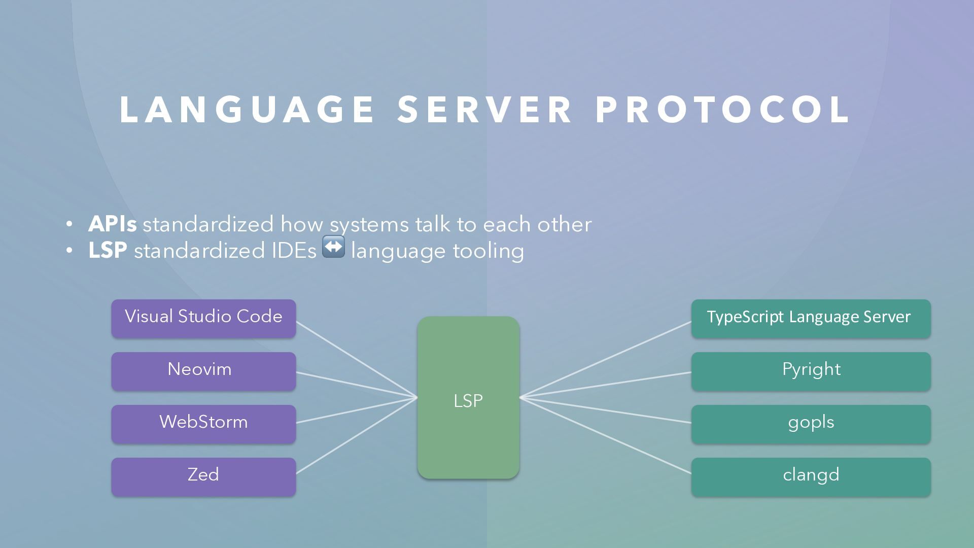 LSP standardized IDEs ↔ language tooling L A N G U A G E S E R V E R P R O T O C O L LSP Visual Studio Code Neovim WebStorm Zed TypeScript Language Server Pyright gopls clangd