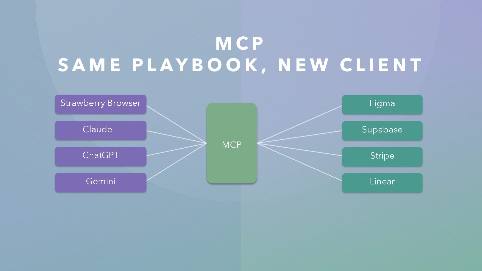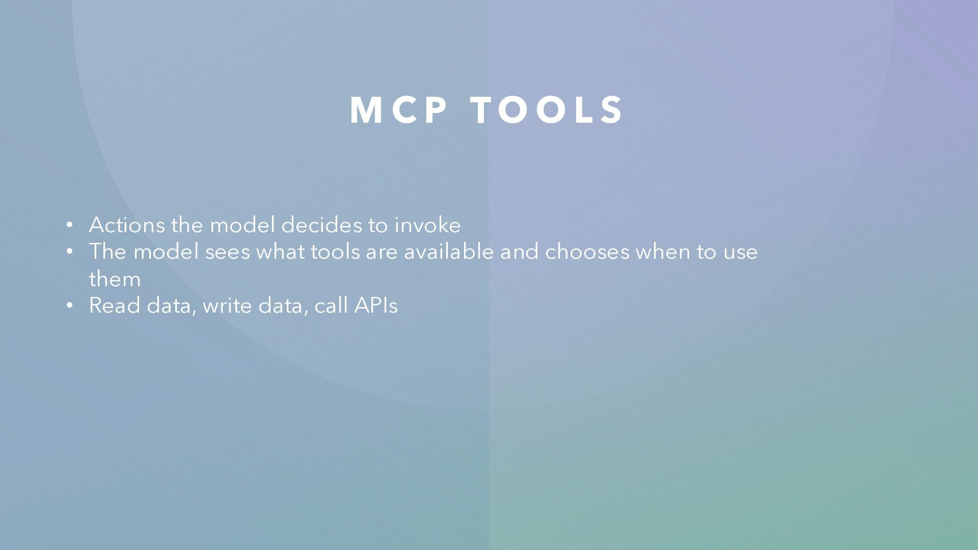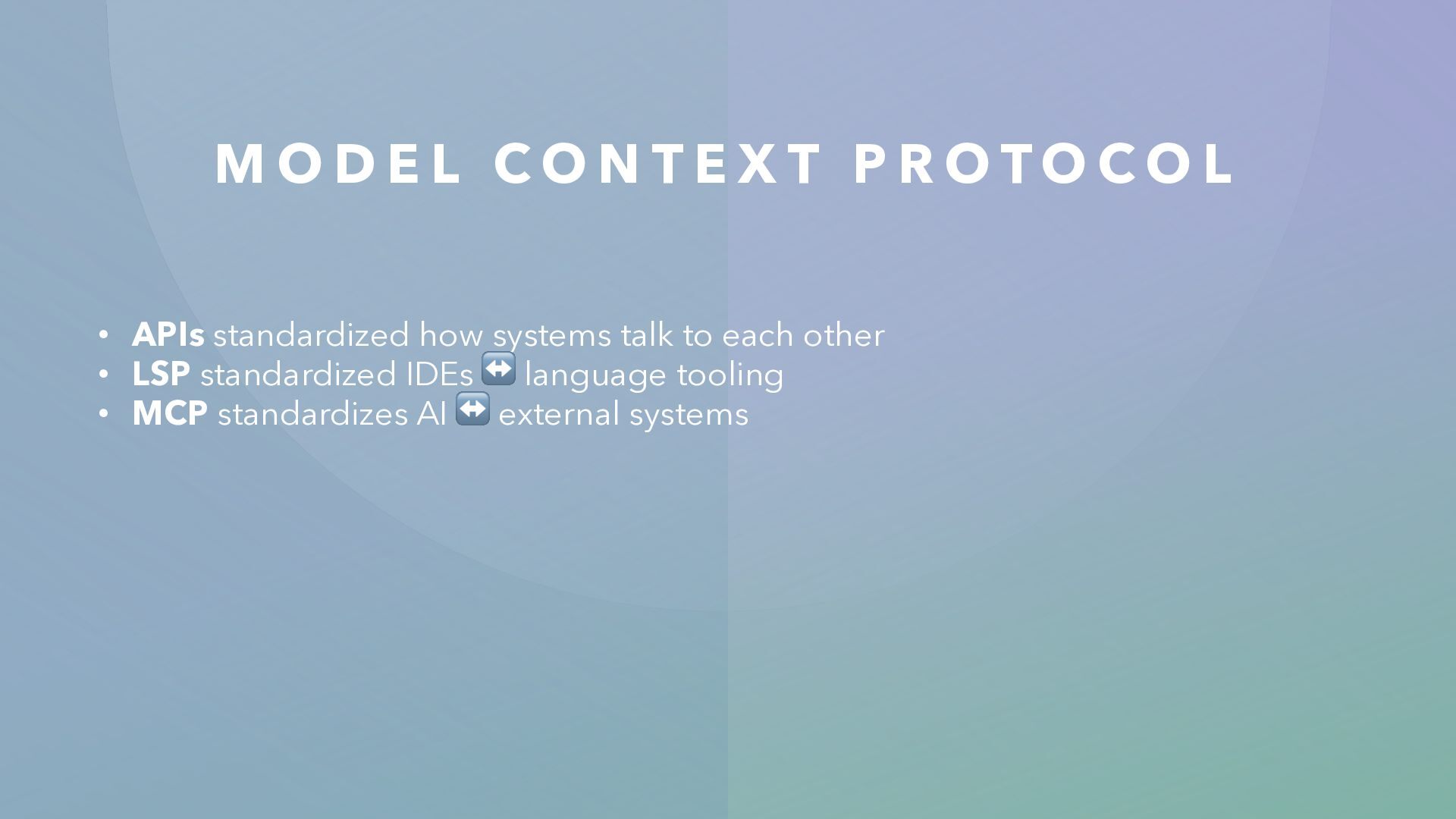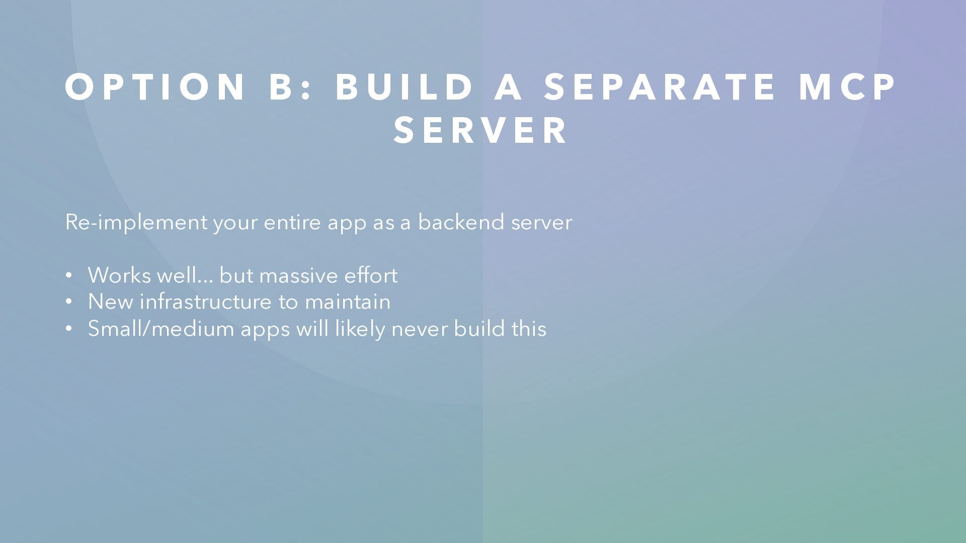 I L D A S E PA R AT E M C P S E R V E R Re-implement your entire app as a backend server • Works well... but massive effort • New infrastructure to maintain • Small/medium apps will likely never build this