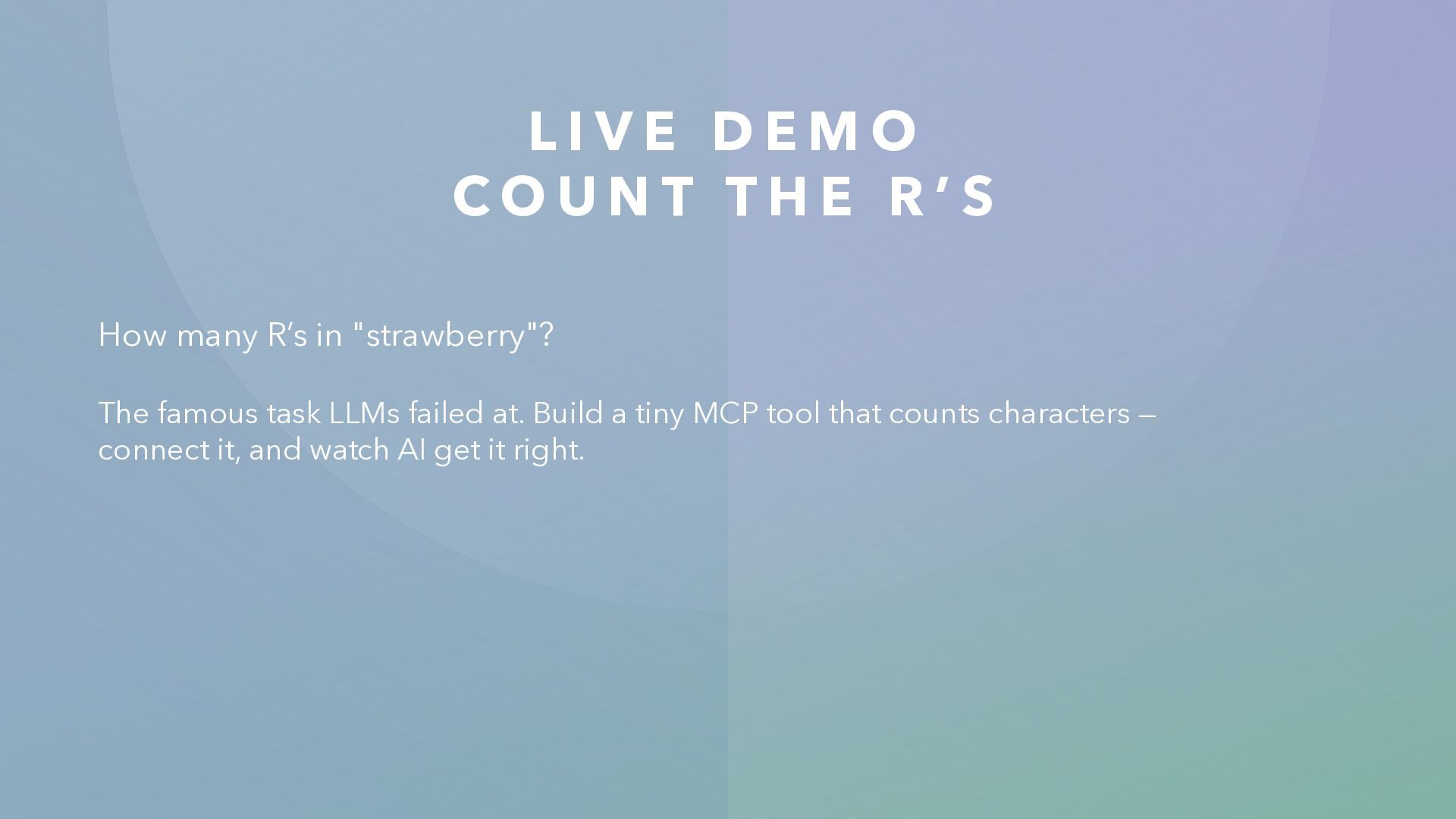 U N T T H E R ’ S How many R’s in "strawberry"? The famous task LLMs failed at. Build a tiny MCP tool that counts characters — connect it, and watch AI get it right.