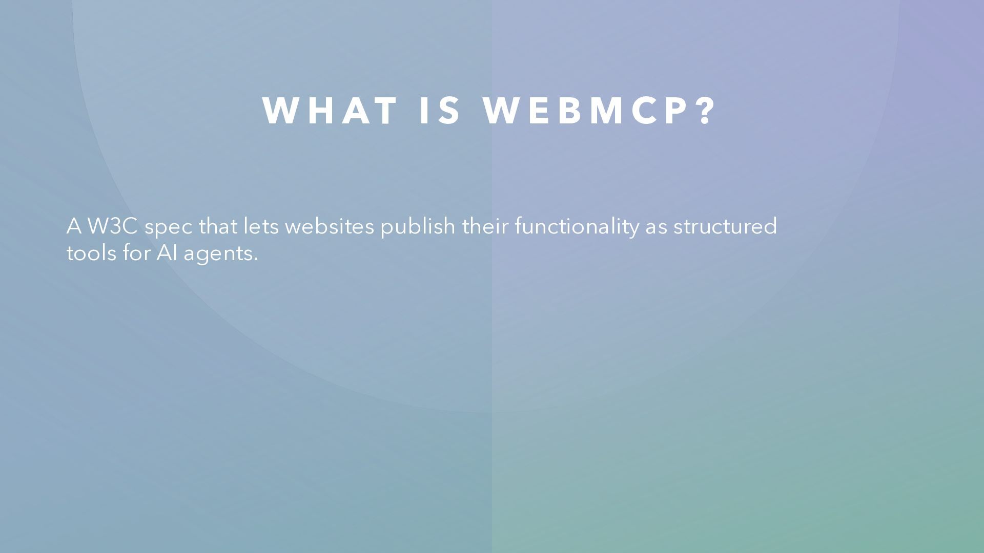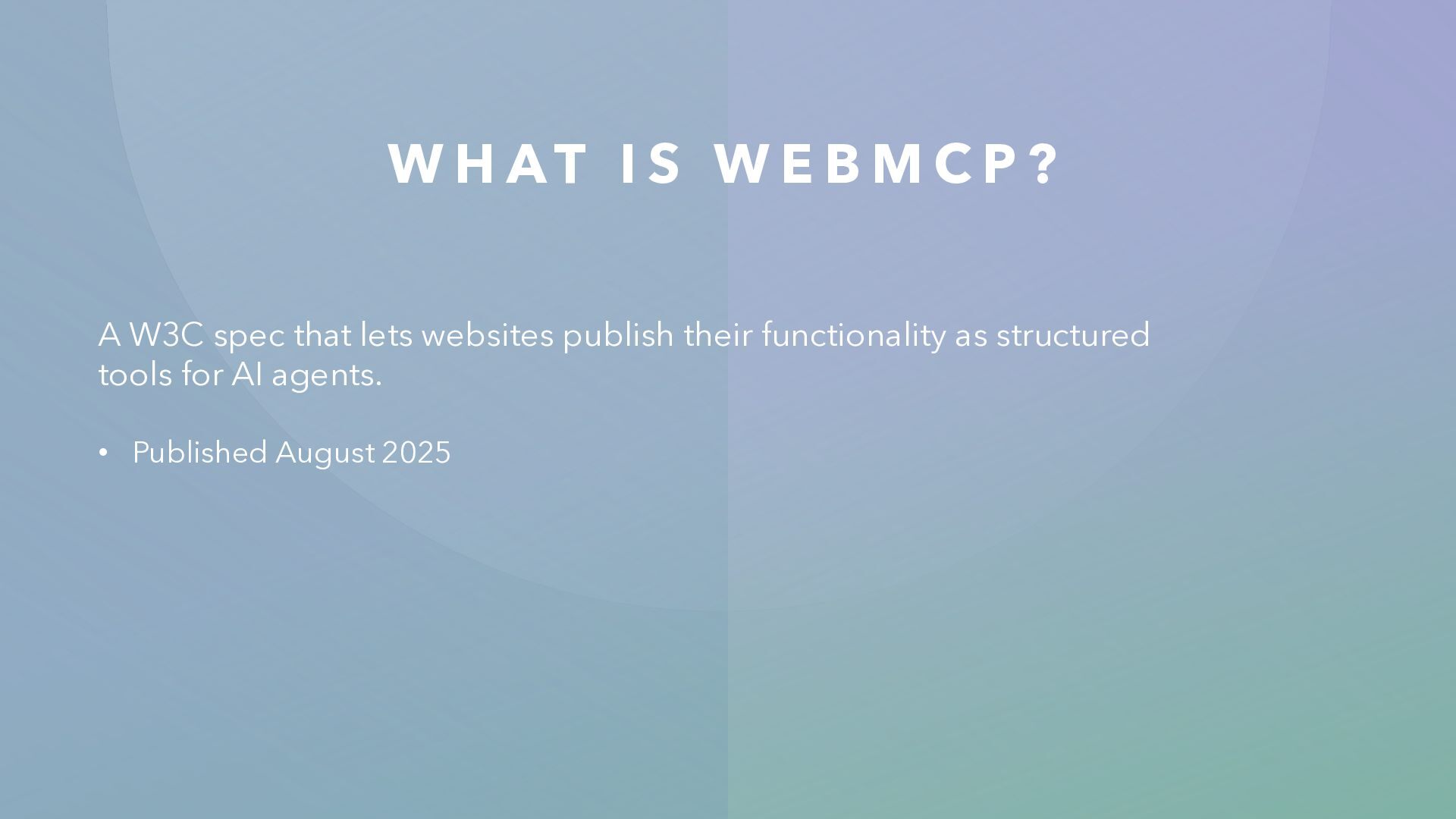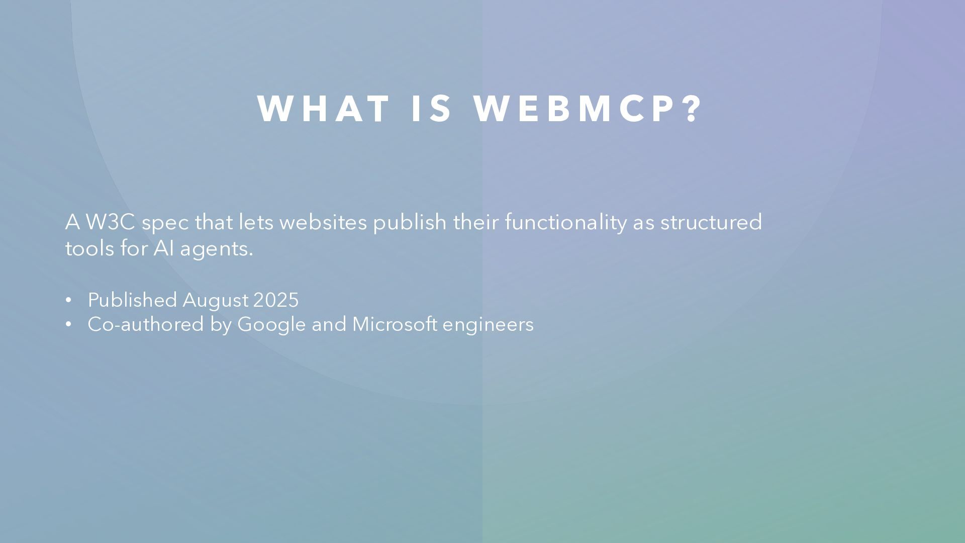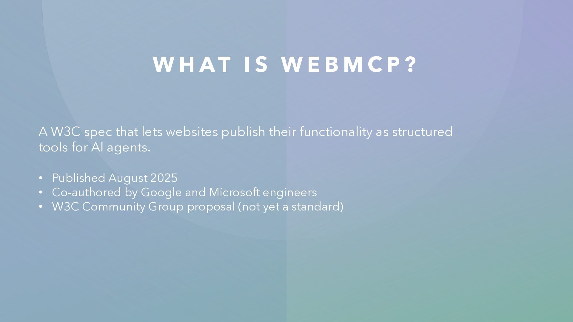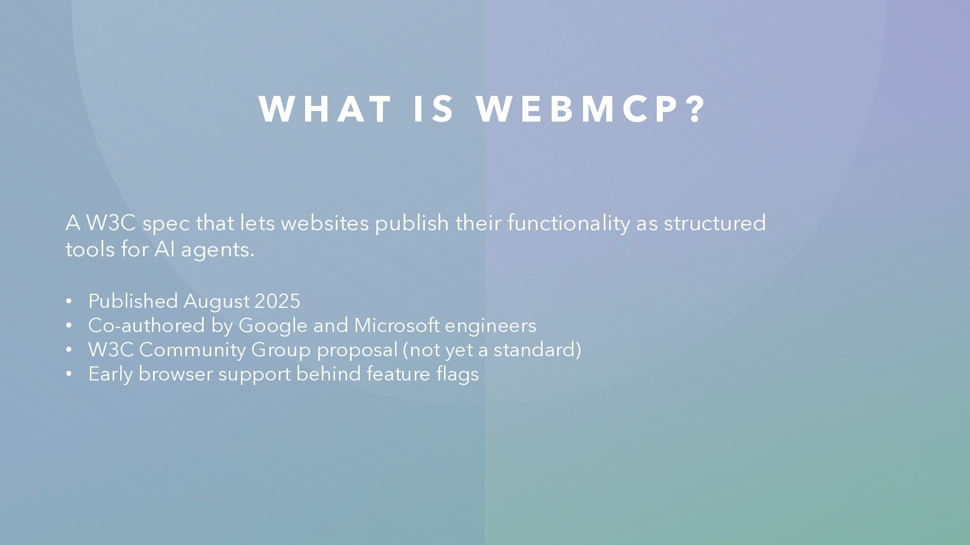 P ? A W3C spec that lets websites publish their functionality as structured tools for AI agents. • Published August 2025 • Co-authored by Google and Microsoft engineers • W3C Community Group proposal (not yet a standard) • Early browser support behind feature flags