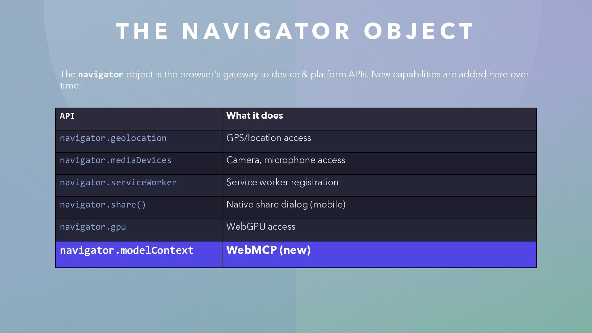 R O B J E C T The navigator object is the browser's gateway to device & platform APIs. New capabilities are added here over time: API What it does navigator.geolocation GPS/location access navigator.mediaDevices Camera, microphone access navigator.serviceWorker Service worker registration navigator.share() Native share dialog (mobile) navigator.gpu WebGPU access navigator.modelContext WebMCP (new)