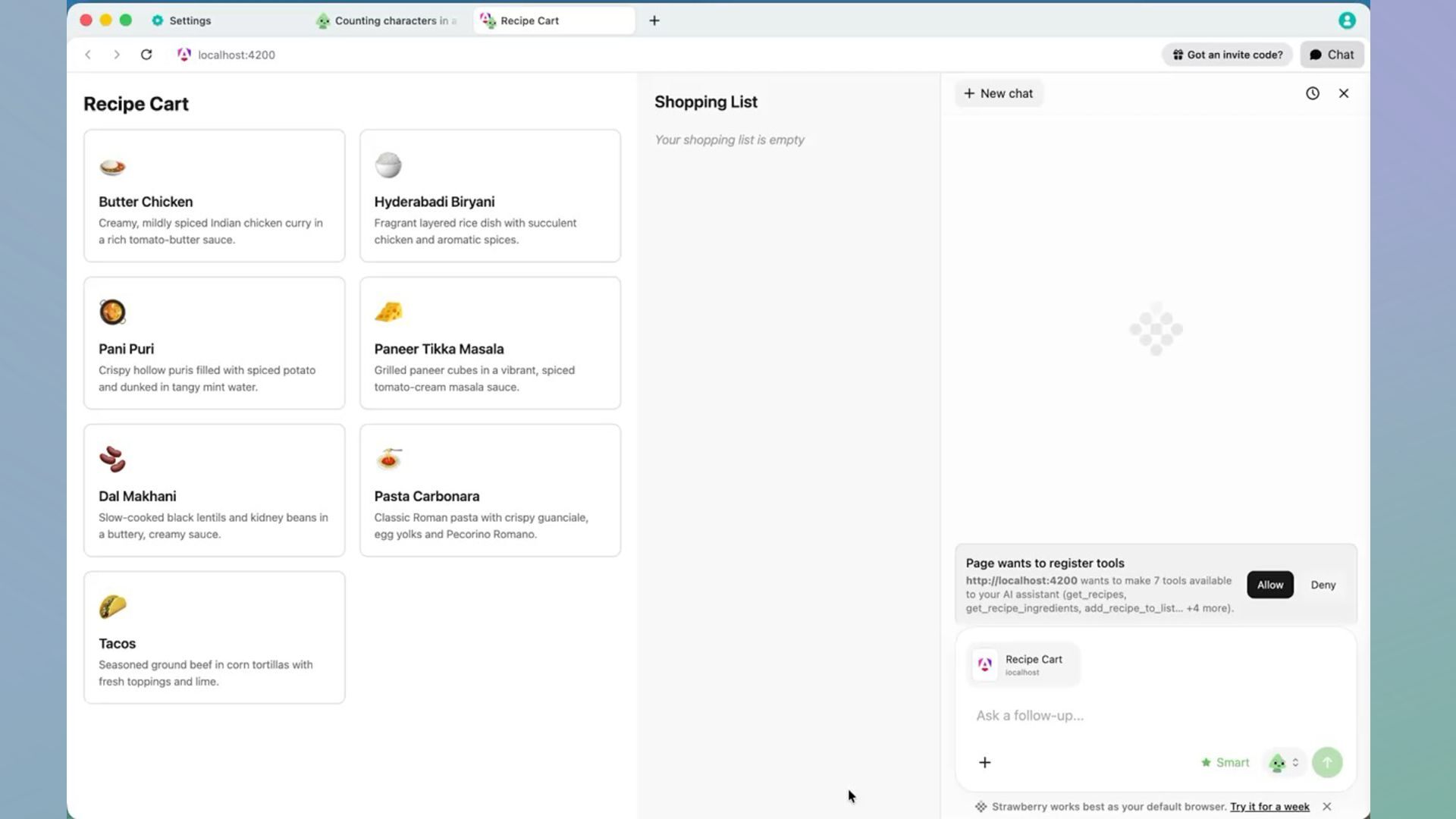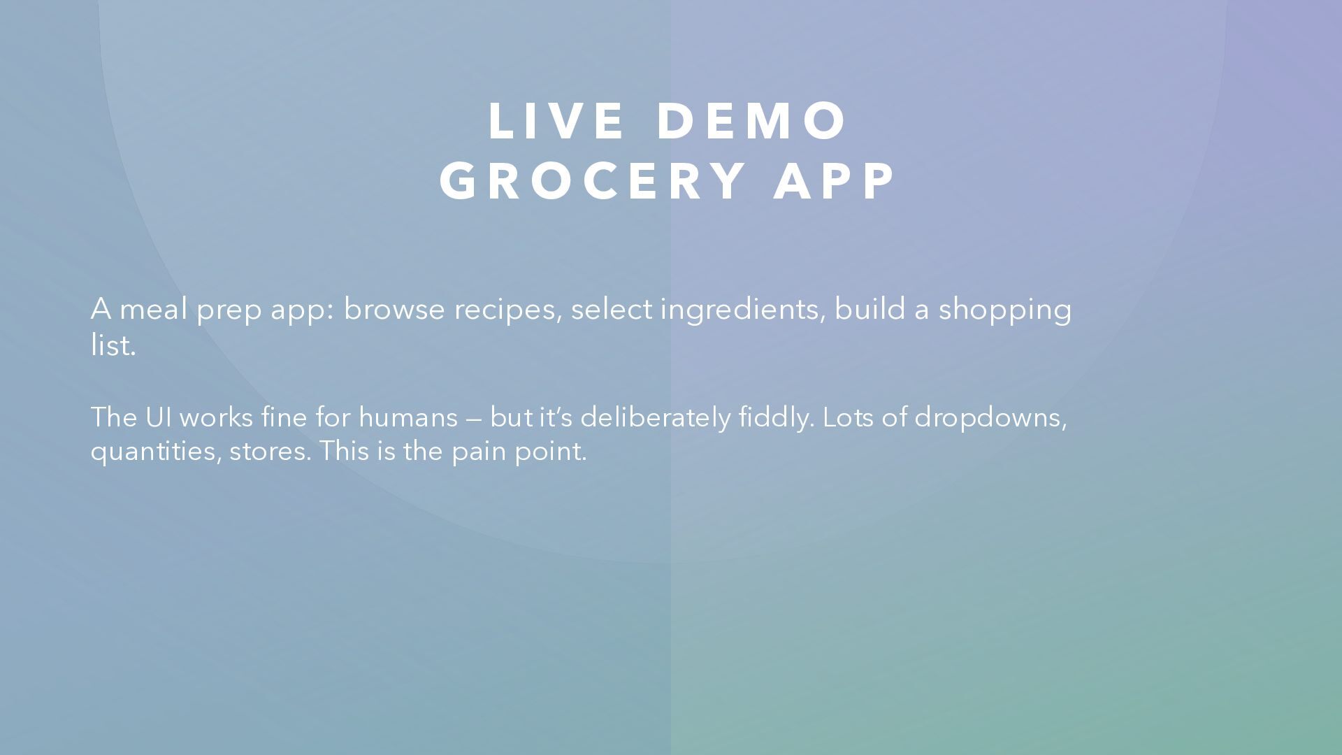 O C E R Y A P P A meal prep app: browse recipes, select ingredients, build a shopping list. The UI works fine for humans — but it’s deliberately fiddly. Lots of dropdowns, quantities, stores. This is the pain point.