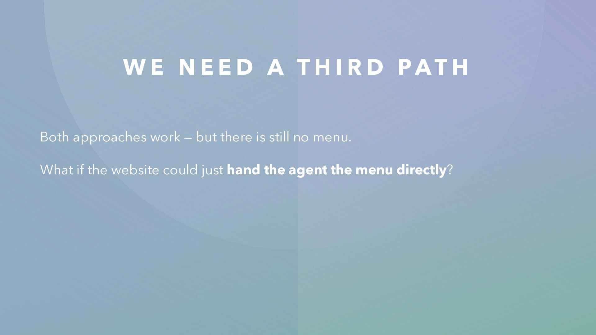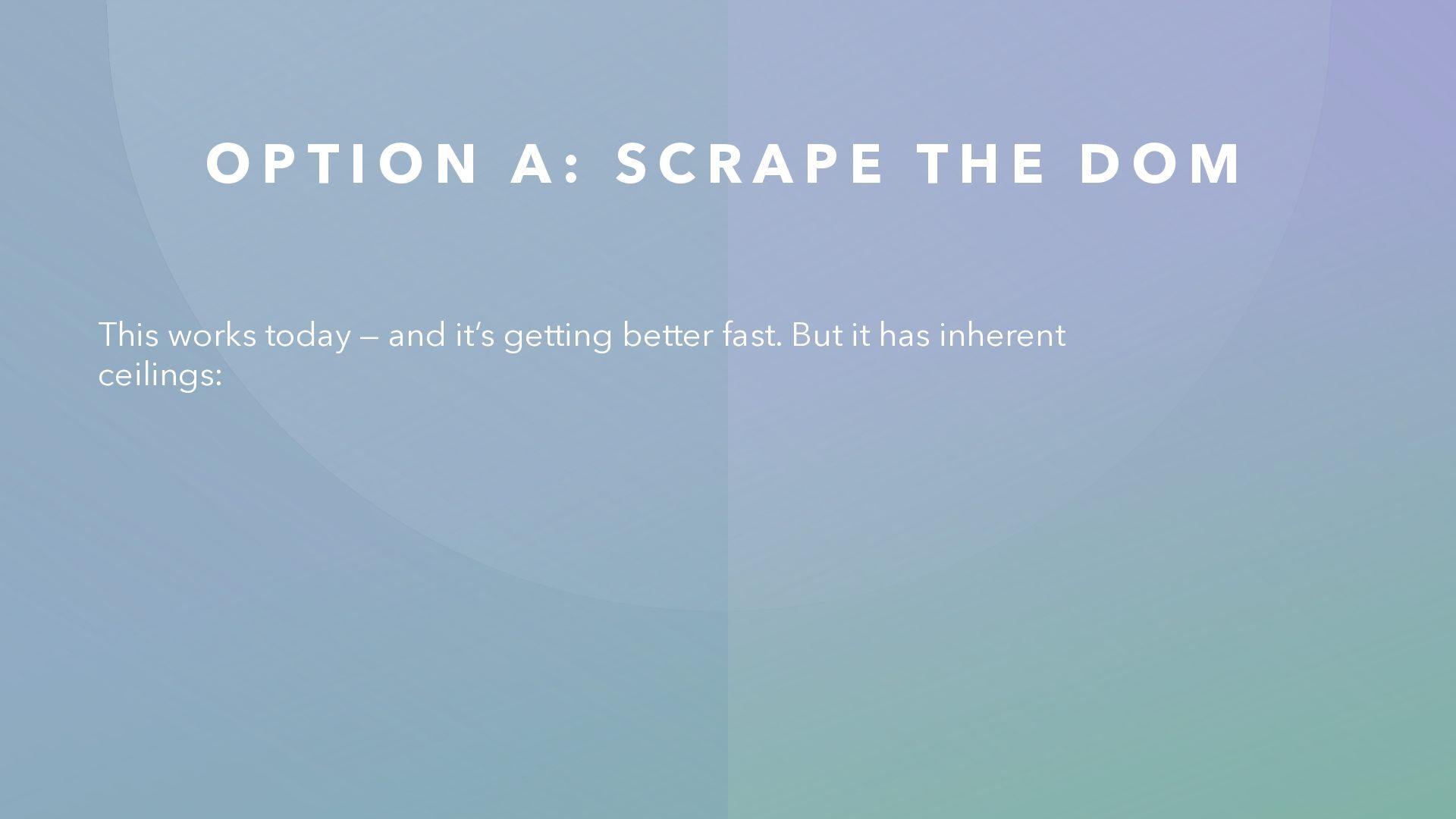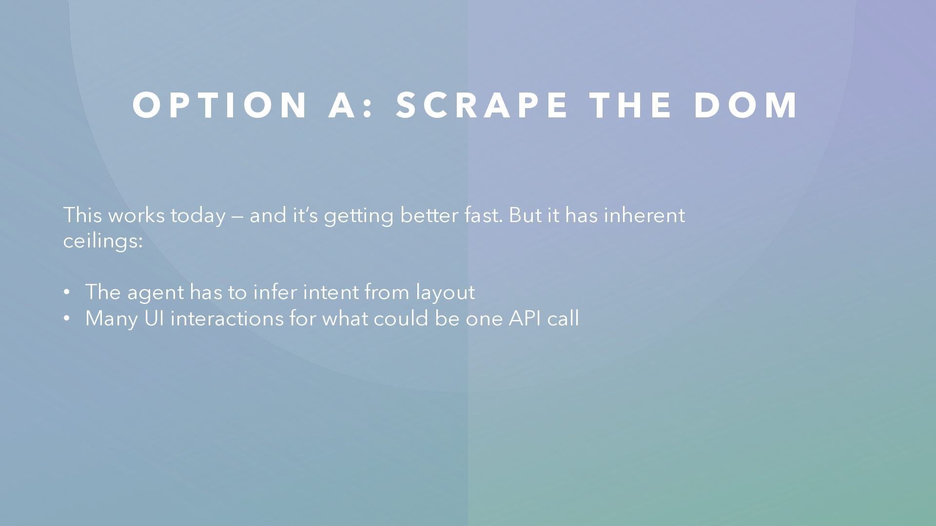 R A P E T H E D O M This works today — and it’s getting better fast. But it has inherent ceilings: • The agent has to infer intent from layout • Many UI interactions for what could be one API call