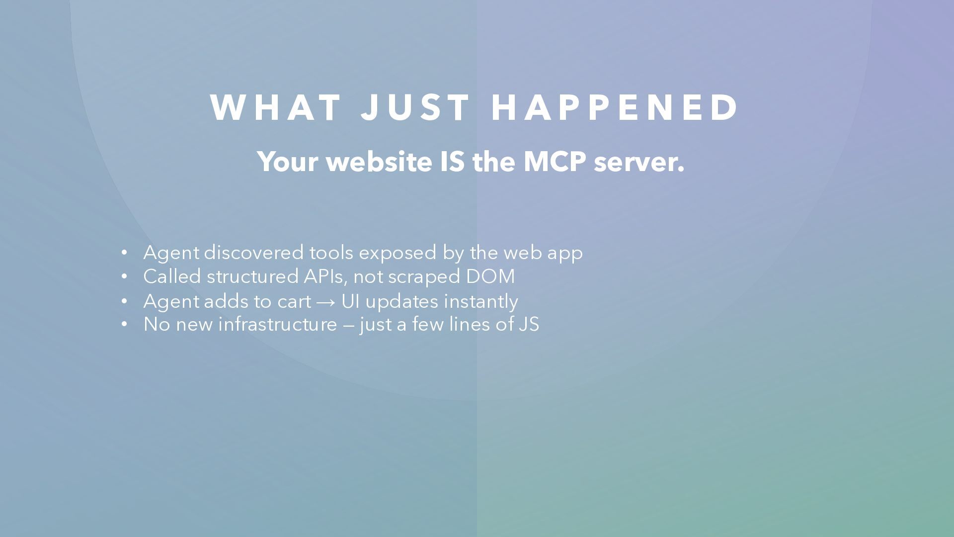 P E N E D Your website IS the MCP server. • Agent discovered tools exposed by the web app • Called structured APIs, not scraped DOM • Agent adds to cart → UI updates instantly • No new infrastructure — just a few lines of JS