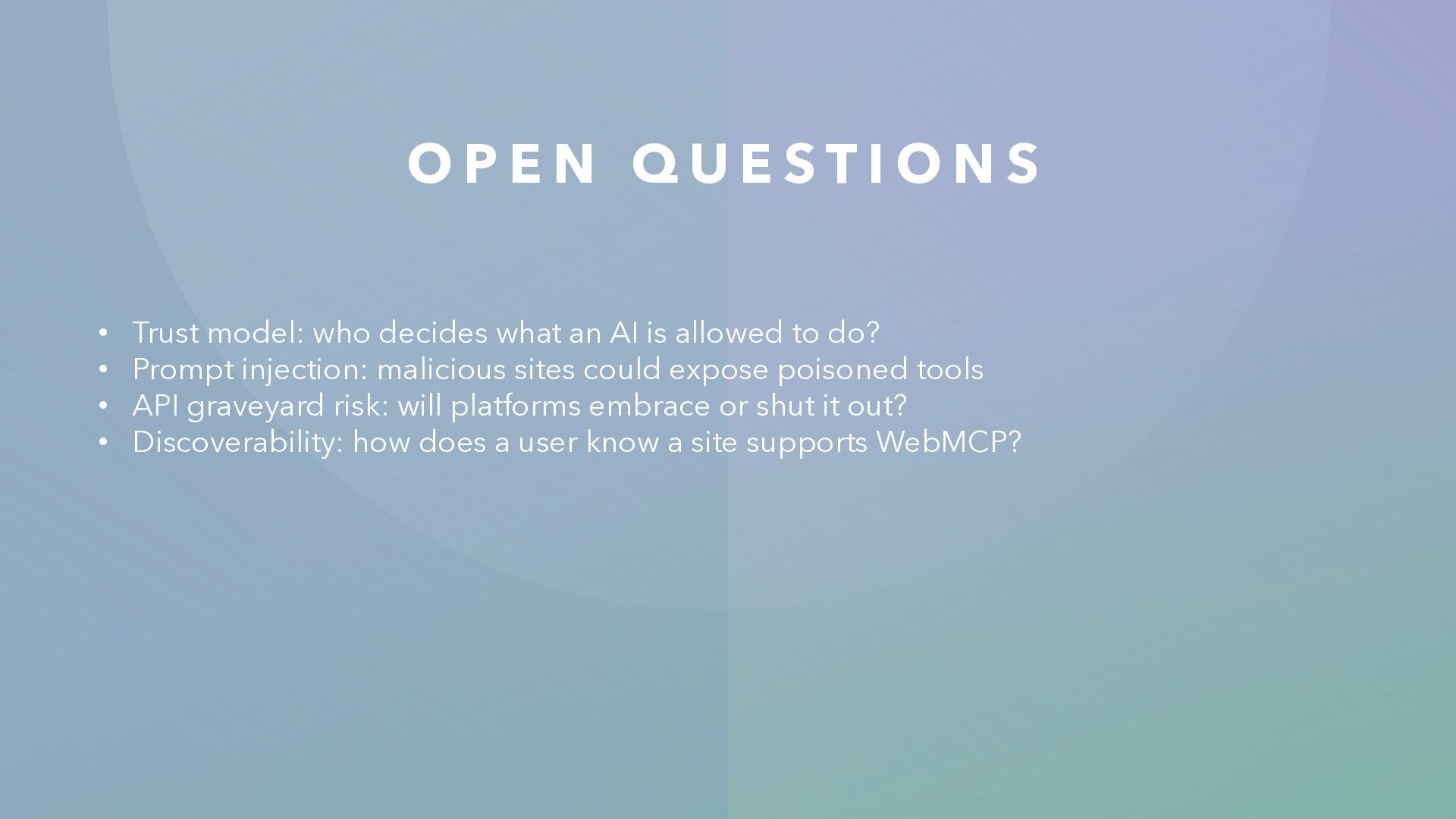 O N S • Trust model: who decides what an AI is allowed to do? • Prompt injection: malicious sites could expose poisoned tools • API graveyard risk: will platforms embrace or shut it out? • Discoverability: how does a user know a site supports WebMCP?