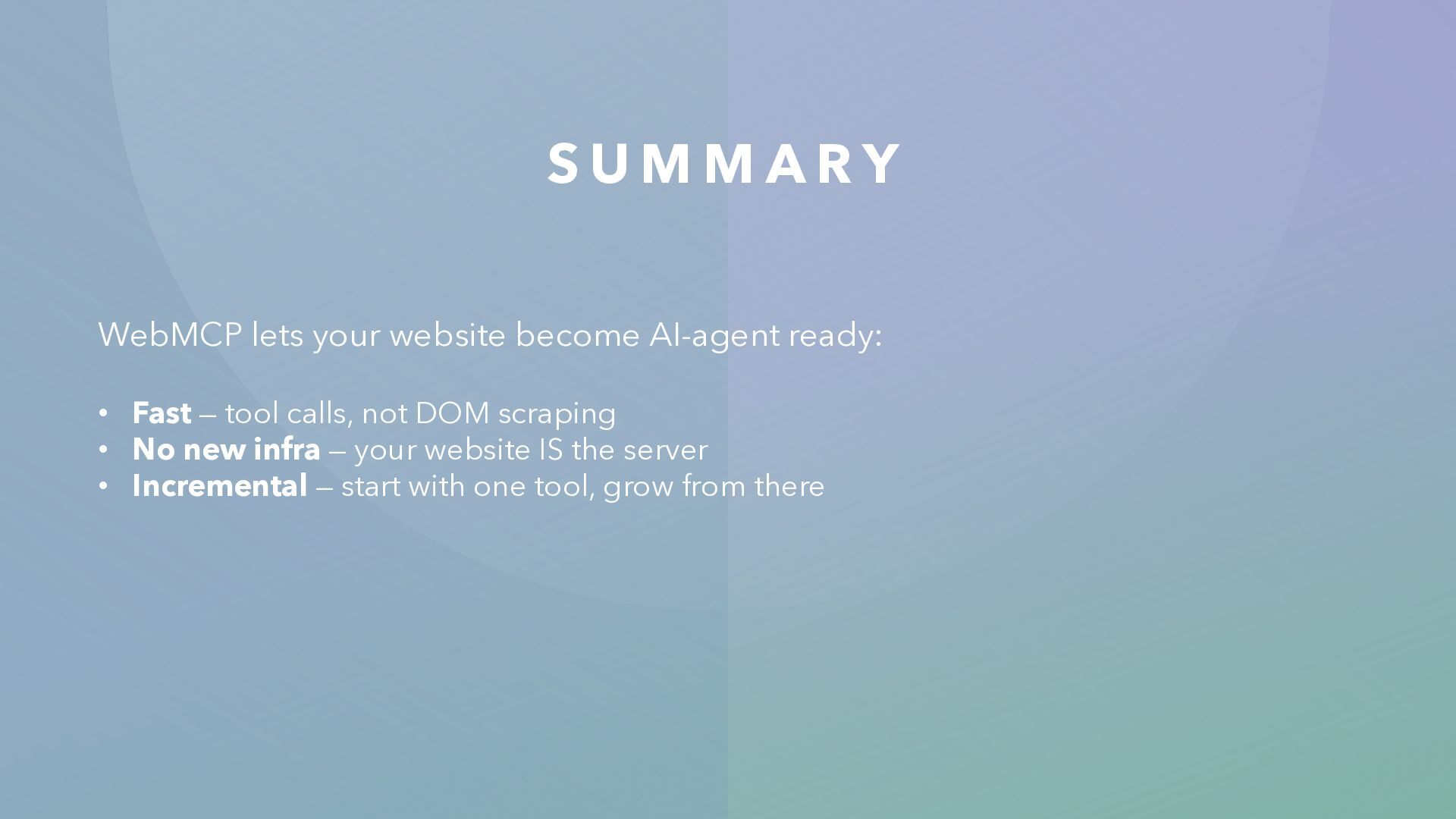 website become AI-agent ready: • Fast — tool calls, not DOM scraping • No new infra — your website IS the server • Incremental — start with one tool, grow from there