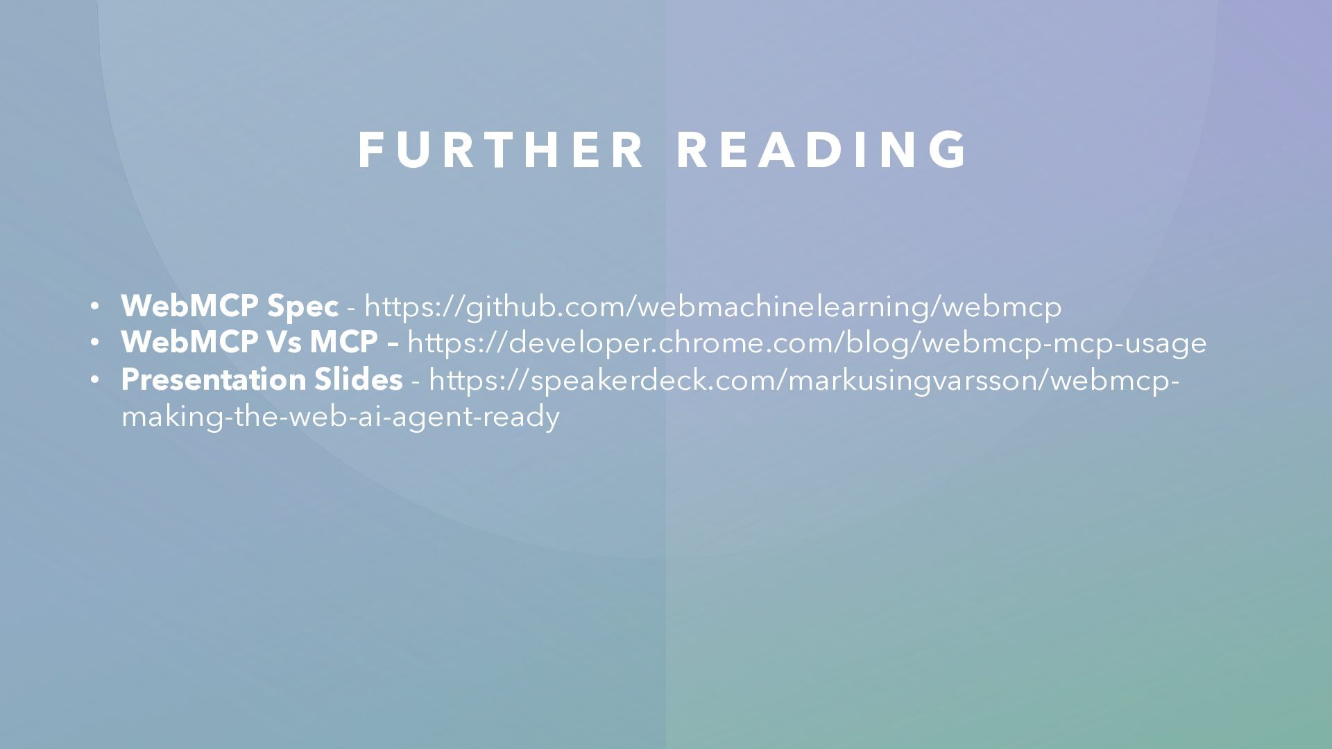 D I N G • WebMCP Spec - https://github.com/webmachinelearning/webmcp • WebMCP Vs MCP – https://developer.chrome.com/blog/webmcp-mcp-usage • Presentation Slides - https://speakerdeck.com/markusingvarsson/webmcp- making-the-web-ai-agent-ready