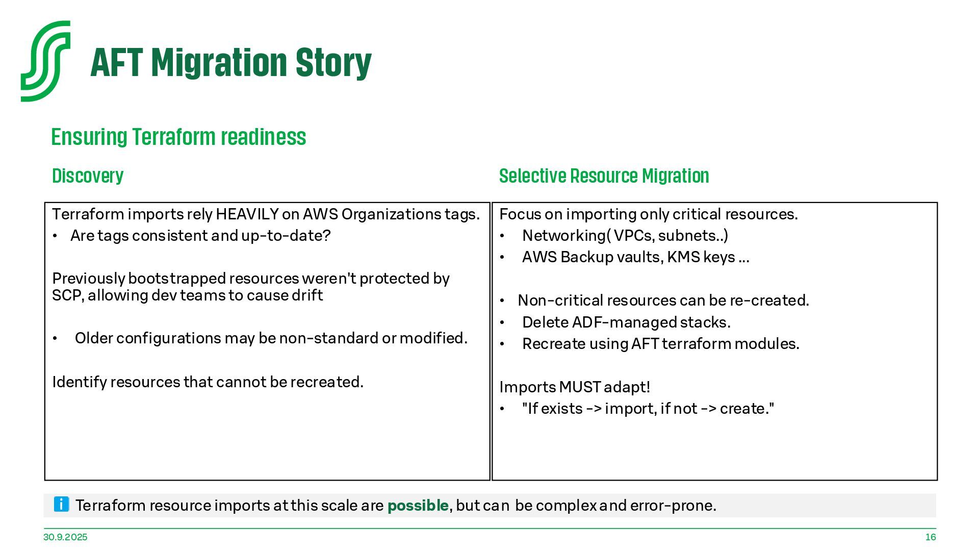 Session will cover the journey of importing existing accounts from CloudFormation into Terraform, lessons learned along the way, and how AFT helps to improve consistency, automation, and long-term maintainability. You'll walk away with practical insights into AFT, migration patterns, and pitfalls to avoid.