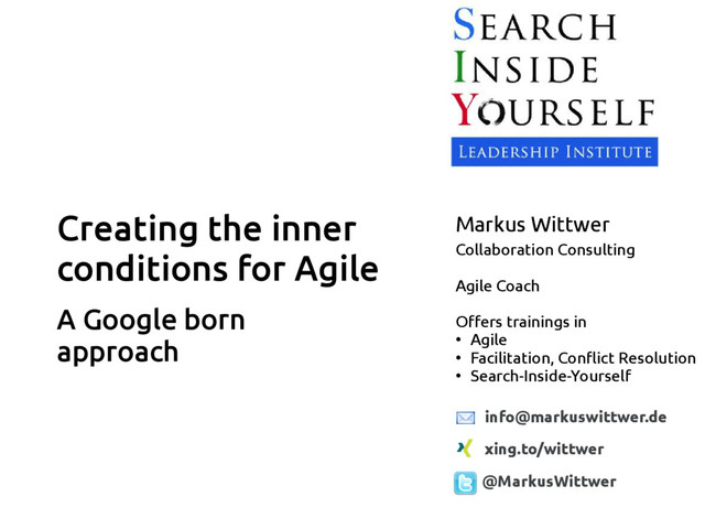 I'm going to present elements of the Search Inside Yourself seminar - a two day science-based approach to develop mindfulness and emotional intelligence especially for knowledge workers in complex, agile environments.