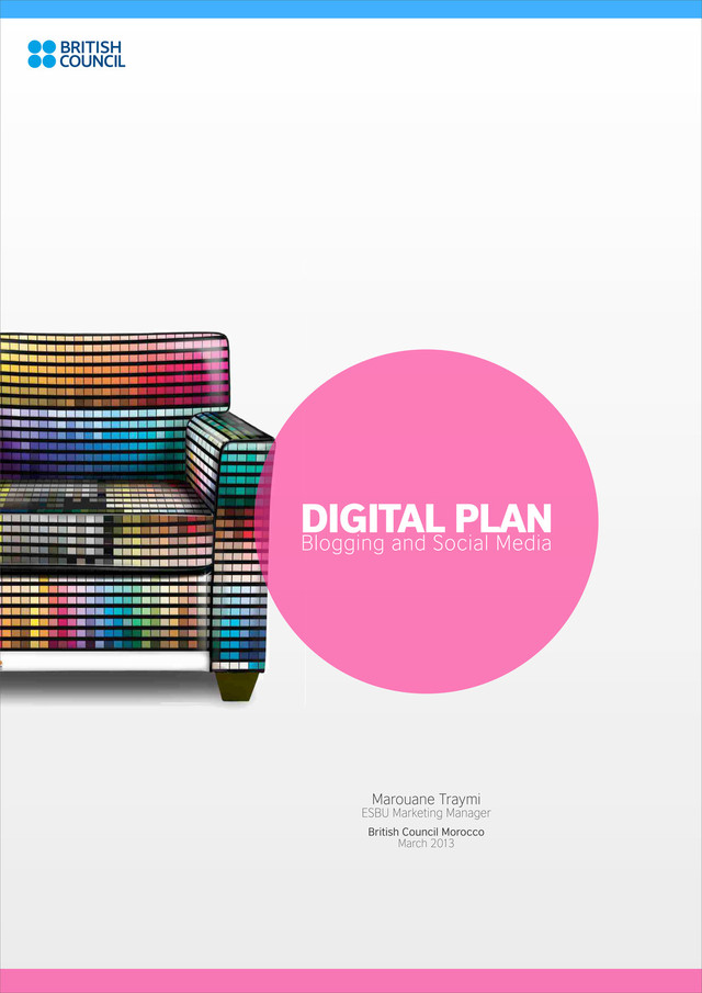 Imane, Martin, Daniel, Lynda and Robert. Guest writers : Joseph Ouechen, LCasseta, Nabil Sebti, Federate people around the team Communicate on the fact that this is not only a blogging project, but we want to create through this initiative a English speaking online media platform in Morocco, that is branded, known, and that speaks for the British Council in Morocco. That is the reason why, we want people who share this vision, and who, in the long term can take these digital responsibilities seriously into their job description. Federate Branded team: Team picture, A badge to wear around the office, sticker in their office badge Organize hang outs: Monthly dinners…etc Schedule weekly meetings, in a cosy place, café, garden, roof etc… Motivate There are many ways to build a team around a common project, make its member feel concerned and fit in to one body. The digital team of writers and bloggers needs to be regularly motivated to achieve the common goal, which is a shiny but yet lasting presence online. Getting journalists benefits: gold pass to festivals, invitation to happenings, Media recognition…etc. Being considered in the office for the job they’re doing, Promotion of the blog done by the team itself, Try to negotiate deals for the digital team, Organize events and happenings for the team, Negotiate access and gold tickets to cultural events for the team to cover these events, Build visuals around the team: a team photo, friendly emails… Feature one member of the team each month in the blog Provide the members with professional looking framed photos. Risk management: - Dress a waiting list to participate in the blog, to give the team an exclusive aspect, and do have back-up plan for new feeds, - Working harder in creating Impact stories for the Monitoring and Evaluation, and to eventually feed the blog in case of a lack of entries, - To always be informed about happenings (Cultural, sports..etc.) to share with the D Team and to feed the blog, Digital Team DIGITAL PLAN Blogging and Social Media