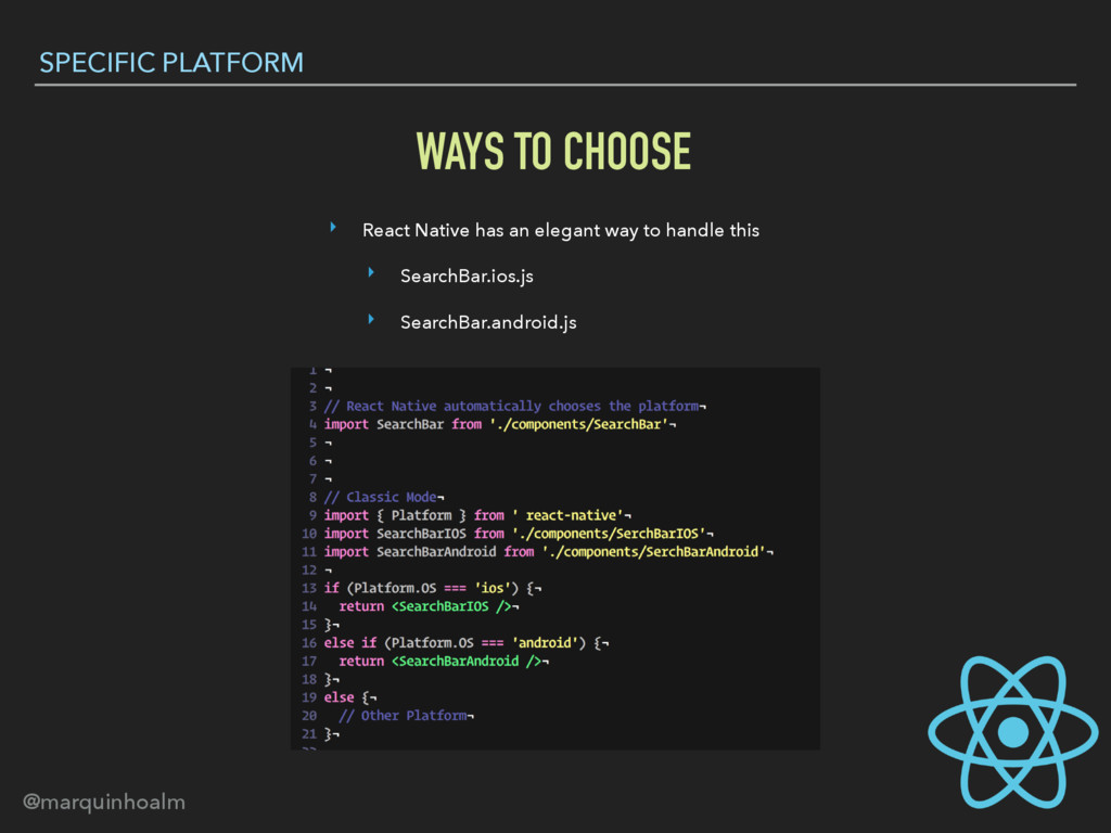 this ‣ SearchBar.ios.js ‣ SearchBar.android.js WAYS TO CHOOSE SPECIFIC PLATFORM