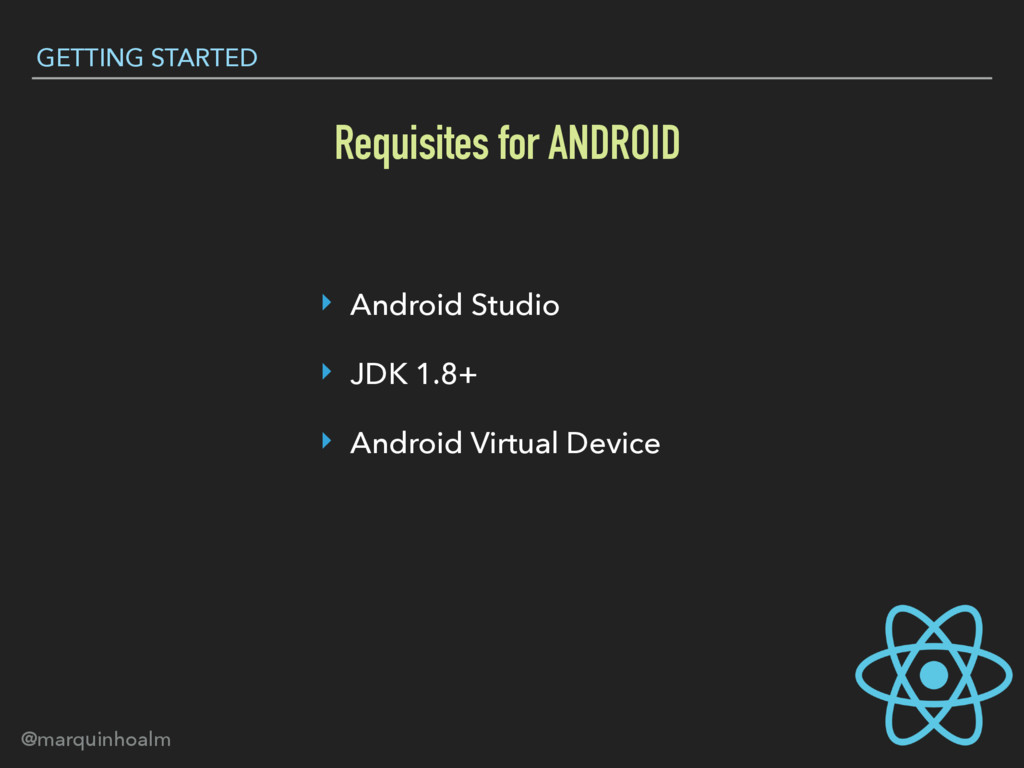 ‣ $ npm install -g react-native-cli Common Requisites GETTING STARTED
