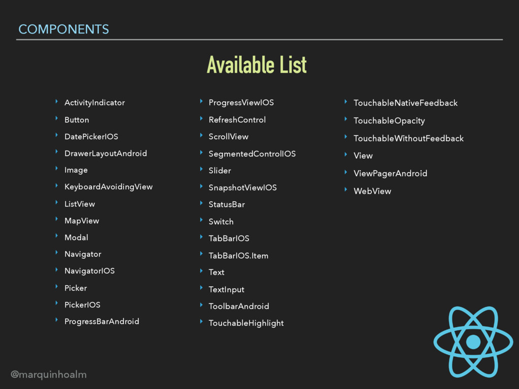 Image ‣ KeyboardAvoidingView ‣ ListView ‣ MapView ‣ Modal ‣ Navigator ‣ NavigatorIOS ‣ Picker ‣ PickerIOS ‣ ProgressBarAndroid Available List COMPONENTS ‣ ProgressViewIOS ‣ RefreshControl ‣ ScrollView ‣ SegmentedControlIOS ‣ Slider ‣ SnapshotViewIOS ‣ StatusBar ‣ Switch ‣ TabBarIOS ‣ TabBarIOS.Item ‣ Text ‣ TextInput ‣ ToolbarAndroid ‣ TouchableHighlight ‣ TouchableNativeFeedback ‣ TouchableOpacity ‣ TouchableWithoutFeedback ‣ View ‣ ViewPagerAndroid ‣ WebView