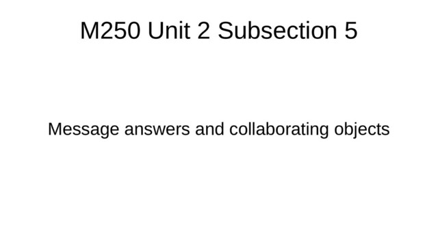 receiver. That’s their purpose. We use them to ‘get’ a value. Examples: getColour(), getPosition(), getHeight() Setter message Are used to change the state of the receiver. We use them to ‘set’ one or more attribute values of the receiver. We set these values to the argument(s) of the message, so setter messages always involve arguments. Examples: setColour(OUColour.GREEN), setPosition(2), setHeight(3)