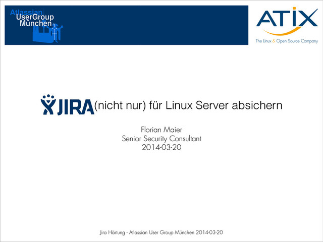 2001 • Langjährige Nutzung der Atlassian Tools (v.a. intern) • Nationale und internationale Atlassian Projekte seit 05/2013 • Einsatz insbesondere im Rahmen von Standard Operating Environment (SOE) Projekten • Hauptsitz in Unterschleißheim bei München ATIX AG Jira Härtung - Atlassian User Group München 2014-03-20
