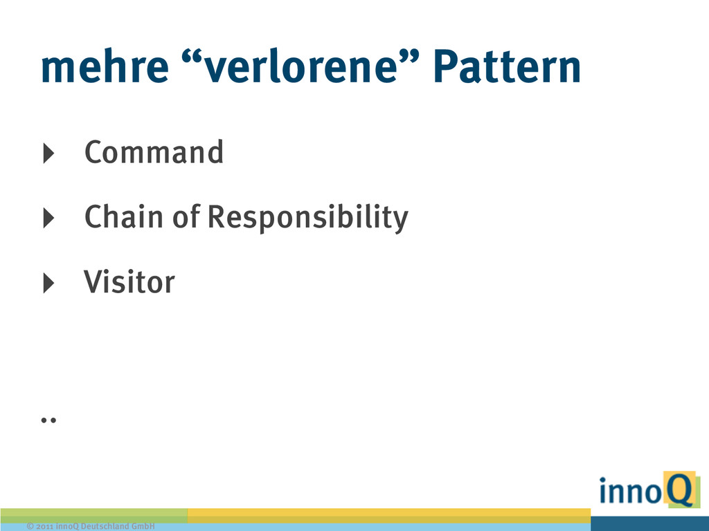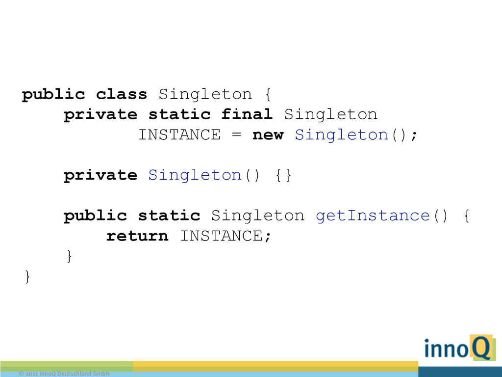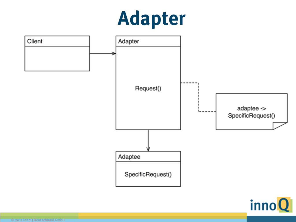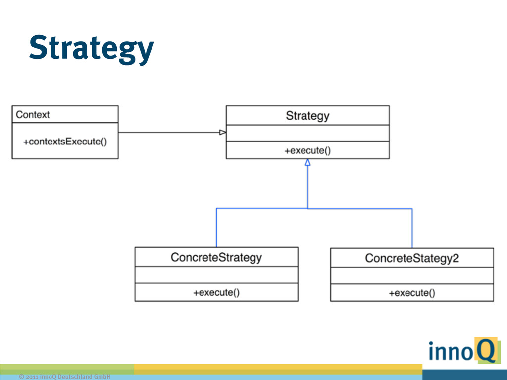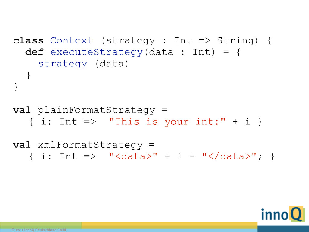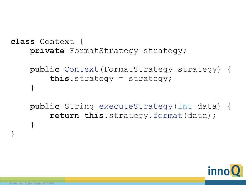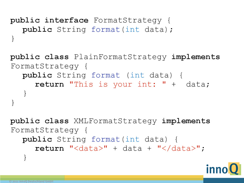 String format(int data); } ! public class PlainFormatStrategy implements FormatStrategy { public String format (int data) { return "This is your int: " + data; } } ! public class XMLFormatStrategy implements FormatStrategy { public String format(int data) { return "<data>" + data + "</data>"; }