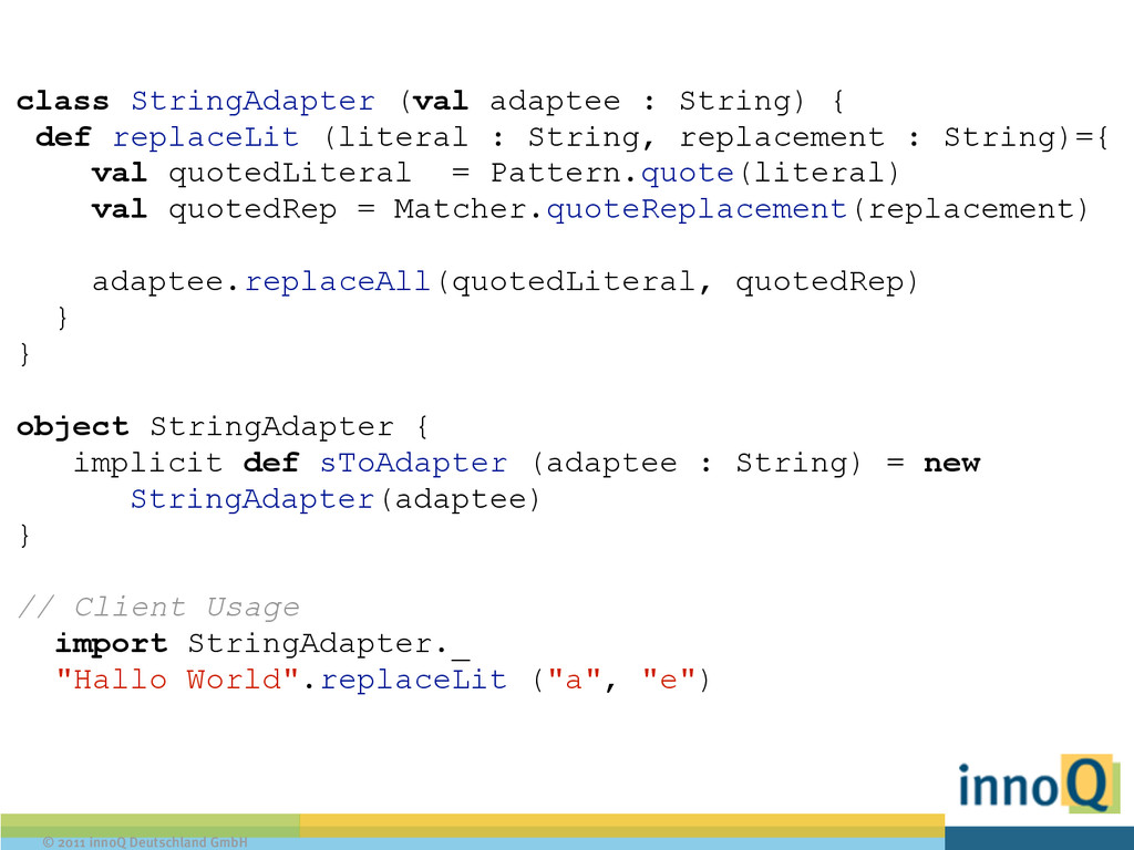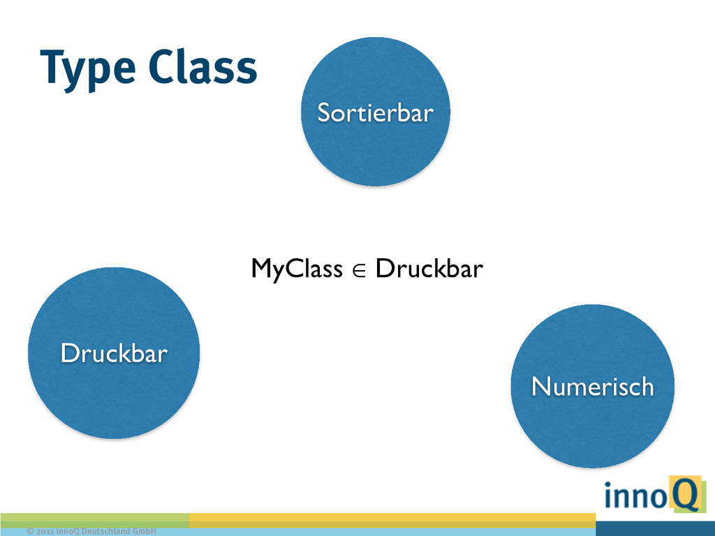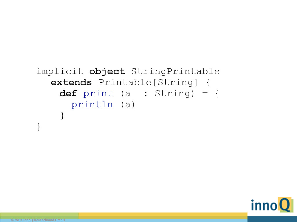 A verlangt, das printable ist def printIt [A : Printable] (a : A) { val printable = implicitly[Printable[A]] printable.print(a) } ! // Benutzung: printIt("Hello World") !