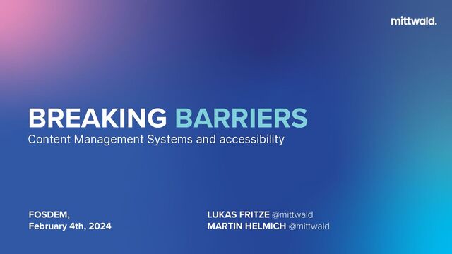 This presentation aims to shed light on the on the different kinds of barriers a user might encounter in a modern web application (especially in the context of the "usual suspects" of content management systems like Wordpress or TYPO3), and also show that there are some barriers that all users may encounter, regardless of their physical or mental ability. Instead, some barriers may arise from the technology available to a user (who possibly only has access to a low-end device, works with a spotty network connection or does not have access to a required input device), the education of a user, their language comprehension and many other factors. We will explore key accessibility principles to allow users to overcome these barriers and share real-world practical examples to illustrate the impact of accessible design on user experience and inclusivity.