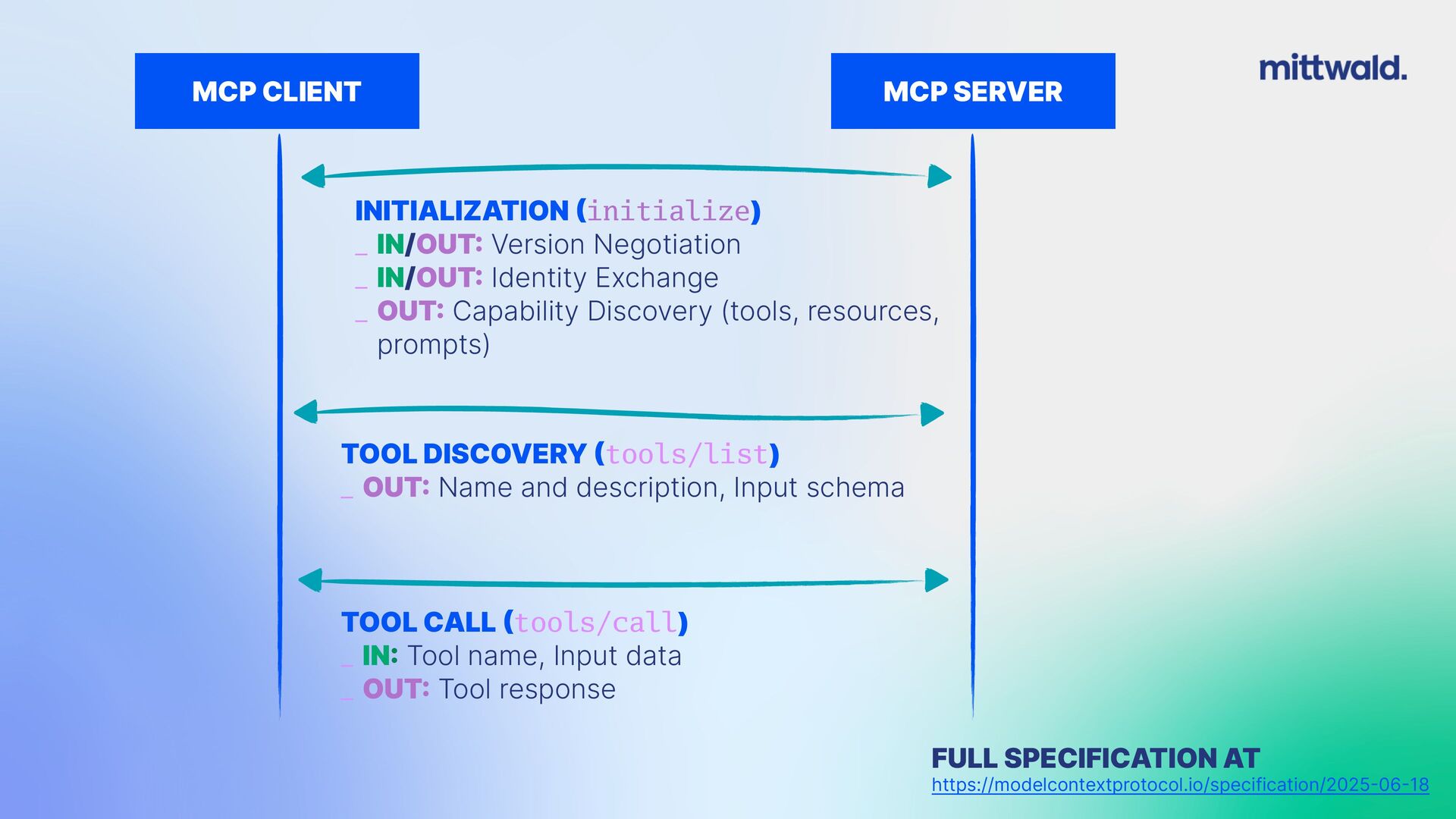 Version Negotiation _ IN/OUT : Identity Exchange _ OUT : Capability Discovery (tools, resources, prompts) TOOL DISCOVERY ( tools/list) _ OUT : Name and description, Input schema TOOL CALL ( tools/call) _ IN : Tool name, Input data _ OUT : Tool response FULL SPECIFICATION AT https://modelcontextprotocol.io/specification/2025 - 06 - 18
