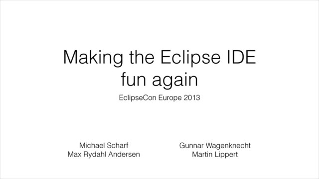 This talk throws in some proposals for making Eclipse fun again, shows some live demos of features we worked on to achieve this, and discusses many of the ideas we’ve been having. The idea is not to present ready-to-use solutions only, but also to trigger thoughts, discussions, and build the ground for more work in this direction. Eclipse should be fun again.