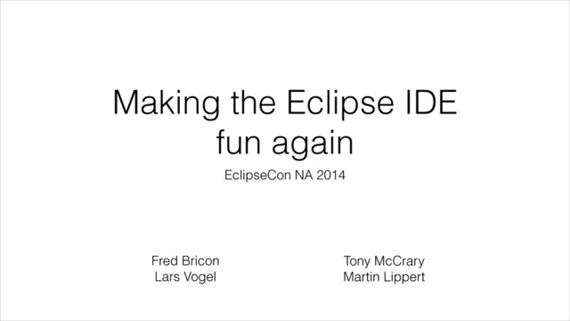 This talk started at EclipseCon Europe 2013 and threw in some proposals for making Eclipse fun again, showed some live demos of features we worked on to achieve this, and started a discussion about many of the ideas we’ve been having. This discussion should continue at EclipseCon NA 2014, showing the progress that has been made in the meantime and trigger discussion for further work. The Eclipse IDE should be fun again.