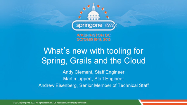 under development. • This session/overview of the new technology represents no commitment from SpringSource/VMware to deliver these features in any generally available product. • Features are subject to change, and must not be included in contracts, purchase orders, or sales agreements of any kind. • Technical feasibility and market demand will affect final delivery. • Pricing and packaging for any new technologies or features discussed or presented have not been determined Disclaimer 3