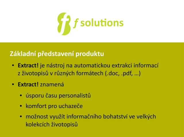 informací z životopisů v různých formátech (.doc, .pdf, …) • Extract! znamená • úsporu času personalistů • komfort pro uchazeče • možnost využít informačního bohatství ve velkých kolekcích životopisů