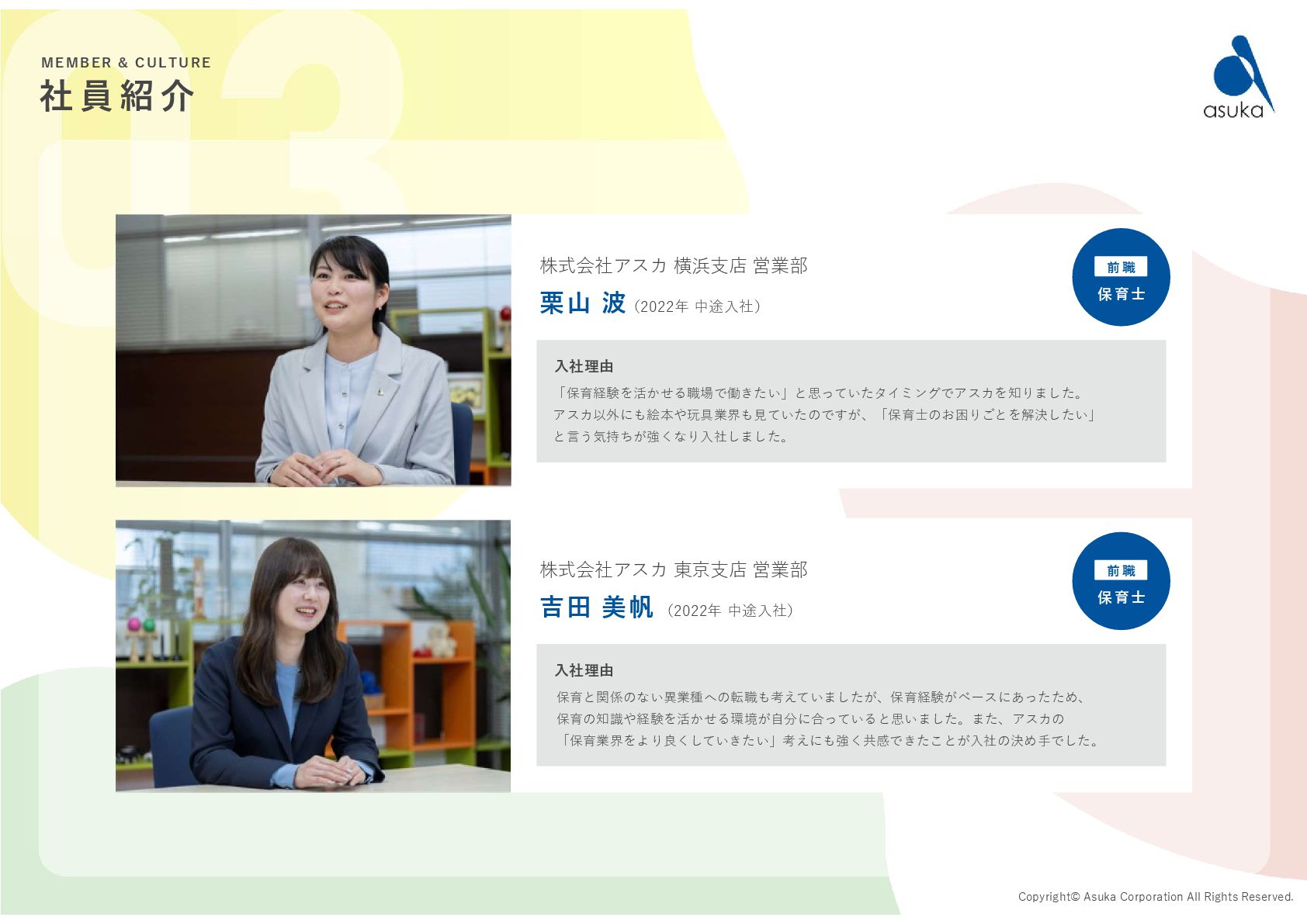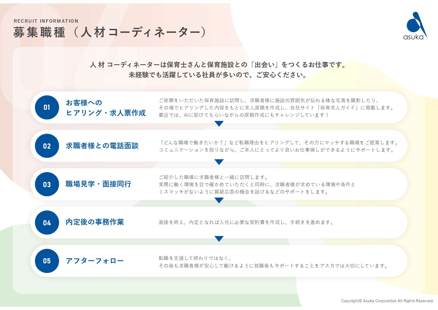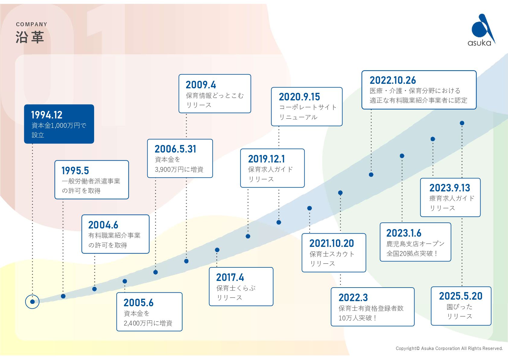 の許可を取得 2004.6 有料職業紹介事業 の許可を取得 2005.6 資本金を 2,400万円に増資 2006.5.31 資本金を 3,900万円に増資 2009.4 保育情報どっとこむ リリース 2017.4 保育士くらぶ リリース 2019.12.1 保育求人ガイド リリース 2020.9.15 コーポレートサイト リニューアル 2021.10.20 保育士スカウト リリース 2022.3 保育士有資格登録者数 10万人突破! 2022.10.26 医療・介護・保育分野における 適正な有料職業紹介事業者に認定 1994.12 資本金1,000万円で 設立 2023.9.13 療育求人ガイド リリース 2023.1.6 鹿児島支店オープン 全国20拠点突破! 2025.5.20 園ぴった リリース