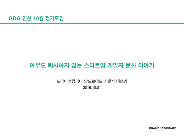2016년 10월 GDG 인천 모임에서 발표한 자료입니다. 퇴사율이 매우 낮은 드라마앤컴퍼니의 개발자 문화를 소개합니다.