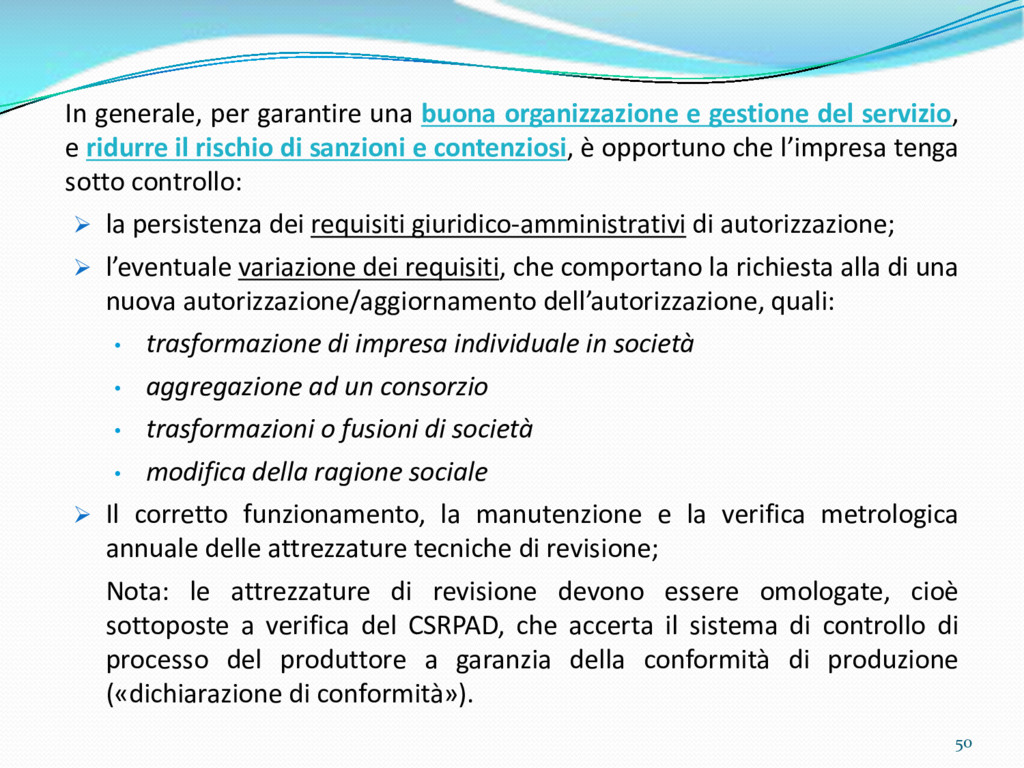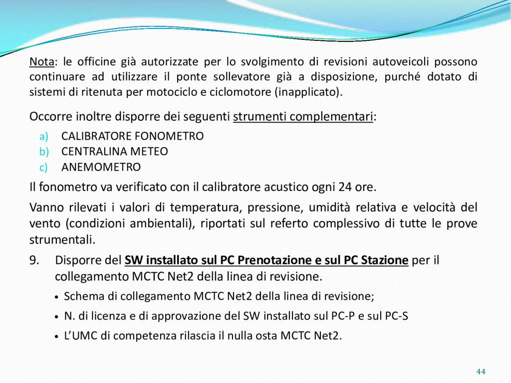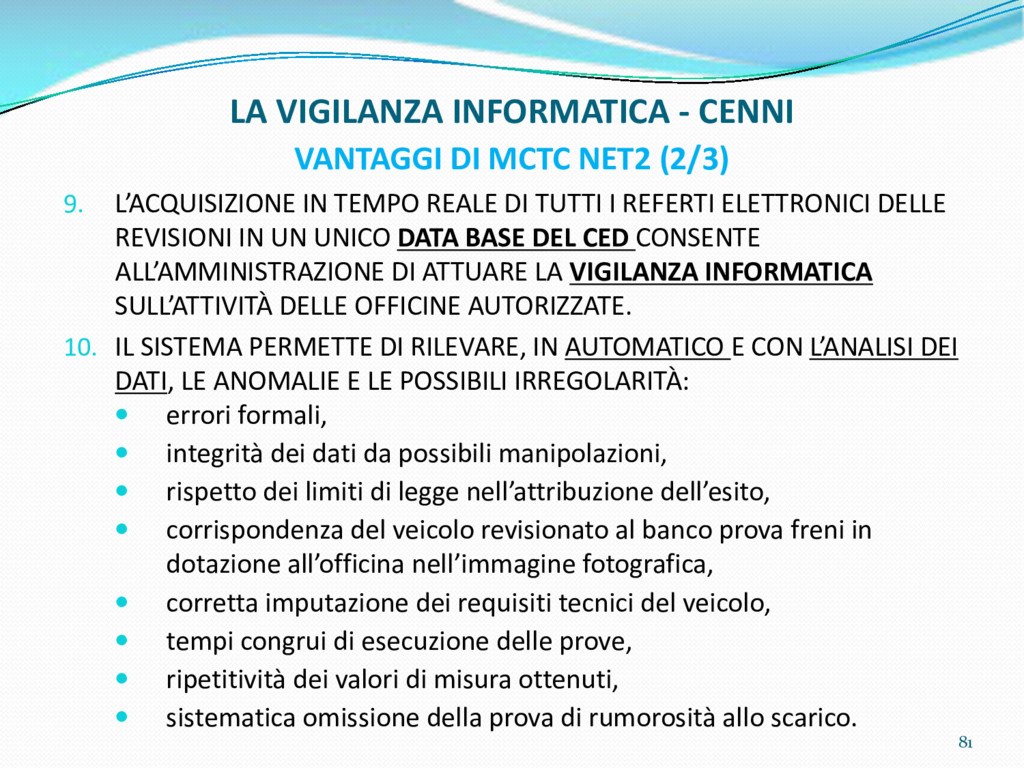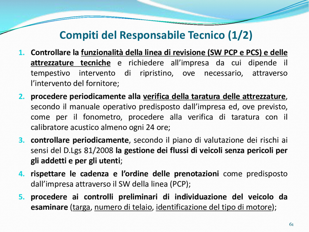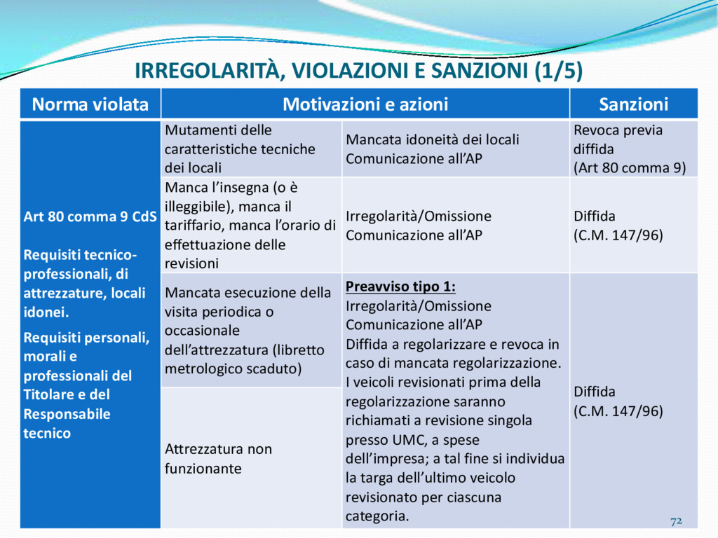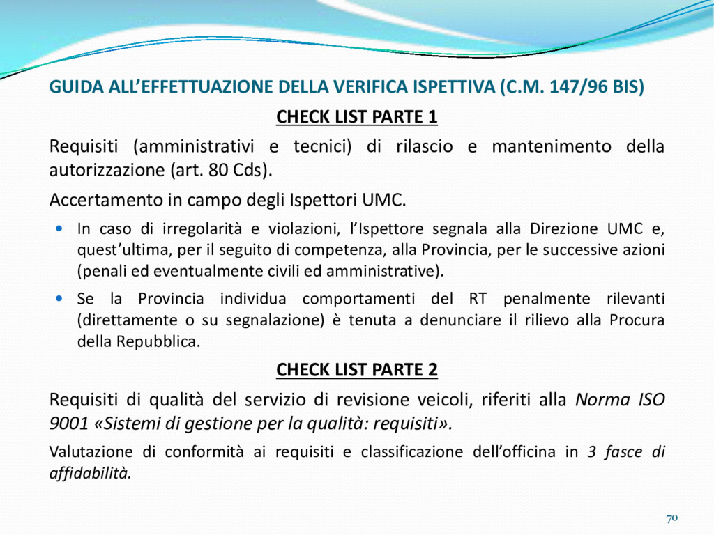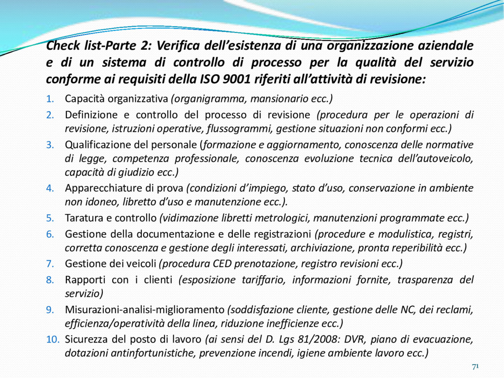 di un sistema di controllo di processo per la qualità del servizio conforme ai requisiti della ISO 9001 riferiti all’attività di revisione: 1. Capacità organizzativa (organigramma, mansionario ecc.) 2. Definizione e controllo del processo di revisione (procedura per le operazioni di revisione, istruzioni operative, flussogrammi, gestione situazioni non conformi ecc.) 3. Qualificazione del personale (formazione e aggiornamento, conoscenza delle normative di legge, competenza professionale, conoscenza evoluzione tecnica dell’autoveicolo, capacità di giudizio ecc.) 4. Apparecchiature di prova (condizioni d’impiego, stato d’uso, conservazione in ambiente non idoneo, libretto d’uso e manutenzione ecc.). 5. Taratura e controllo (vidimazione libretti metrologici, manutenzioni programmate ecc.) 6. Gestione della documentazione e delle registrazioni (procedure e modulistica, registri, corretta conoscenza e gestione degli interessati, archiviazione, pronta reperibilità ecc.) 7. Gestione dei veicoli (procedura CED prenotazione, registro revisioni ecc.) 8. Rapporti con i clienti (esposizione tariffario, informazioni fornite, trasparenza del servizio) 9. Misurazioni-analisi-miglioramento (soddisfazione cliente, gestione delle NC, dei reclami, efficienza/operatività della linea, riduzione inefficienze ecc.) 10. Sicurezza del posto di lavoro (ai sensi del D. Lgs 81/2008: DVR, piano di evacuazione, dotazioni antinfortunistiche, prevenzione incendi, igiene ambiente lavoro ecc.) 71