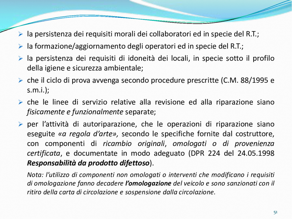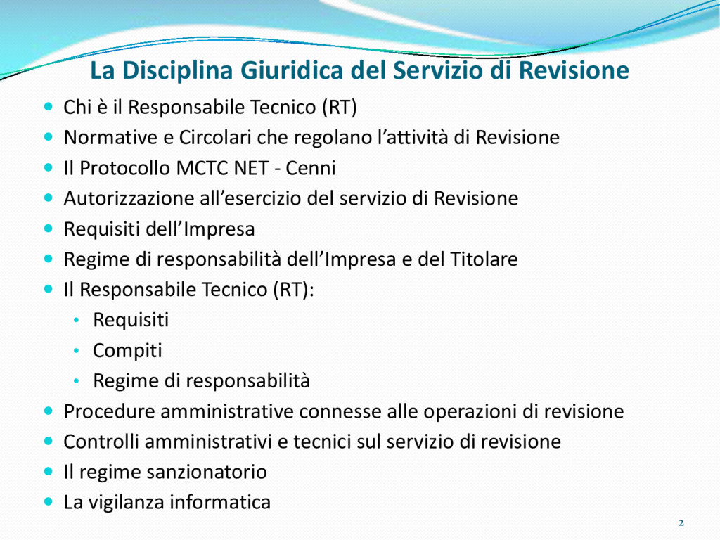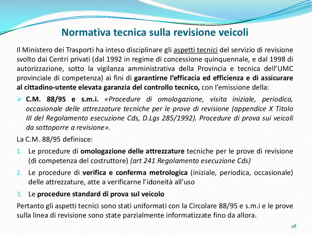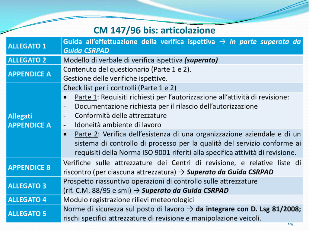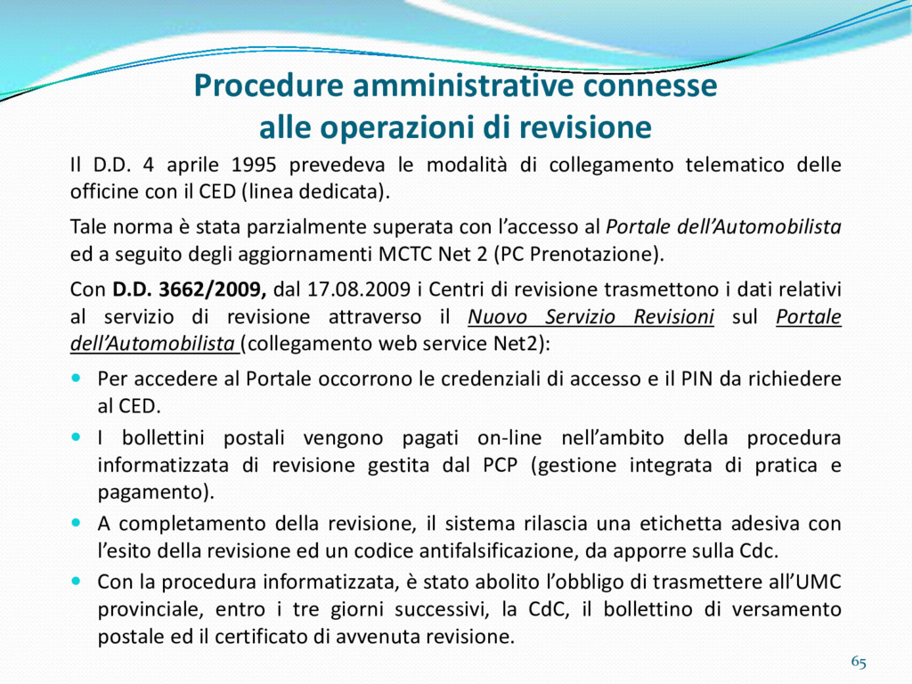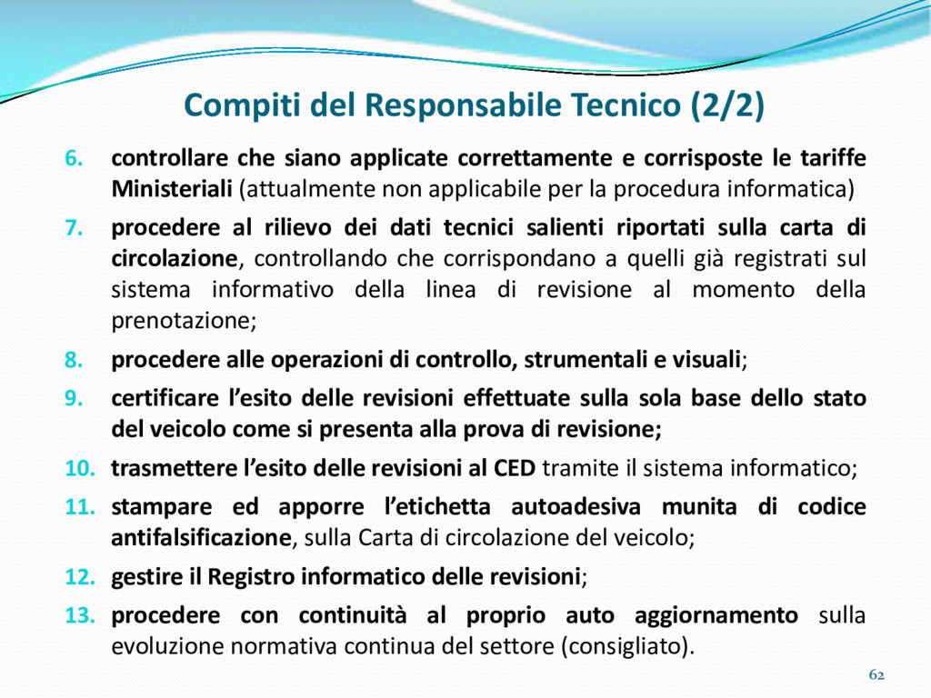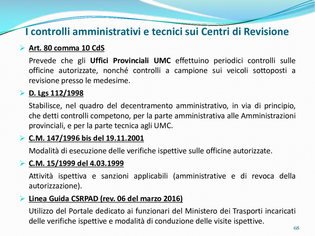 di un sistema di controllo di processo per la qualità del servizio conforme ai requisiti della ISO 9001 riferiti all’attività di revisione: 1. Capacità organizzativa (organigramma, mansionario ecc.) 2. Definizione e controllo del processo di revisione (procedura per le operazioni di revisione, istruzioni operative, flussogrammi, gestione situazioni non conformi ecc.) 3. Qualificazione del personale (formazione e aggiornamento, conoscenza delle normative di legge, competenza professionale, conoscenza evoluzione tecnica dell’autoveicolo, capacità di giudizio ecc.) 4. Apparecchiature di prova (condizioni d’impiego, stato d’uso, conservazione in ambiente non idoneo, libretto d’uso e manutenzione ecc.). 5. Taratura e controllo (vidimazione libretti metrologici, manutenzioni programmate ecc.) 6. Gestione della documentazione e delle registrazioni (procedure e modulistica, registri, corretta conoscenza e gestione degli interessati, archiviazione, pronta reperibilità ecc.) 7. Gestione dei veicoli (procedura CED prenotazione, registro revisioni ecc.) 8. Rapporti con i clienti (esposizione tariffario, informazioni fornite, trasparenza del servizio) 9. Misurazioni-analisi-miglioramento (soddisfazione cliente, gestione delle NC, dei reclami, efficienza/operatività della linea, riduzione inefficienze ecc.) 10. Sicurezza del posto di lavoro (ai sensi del D. Lgs 81/2008: DVR, piano di evacuazione, dotazioni antinfortunistiche, prevenzione incendi, igiene ambiente lavoro ecc.) 71