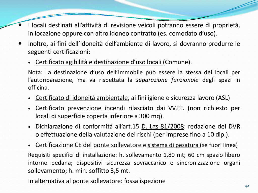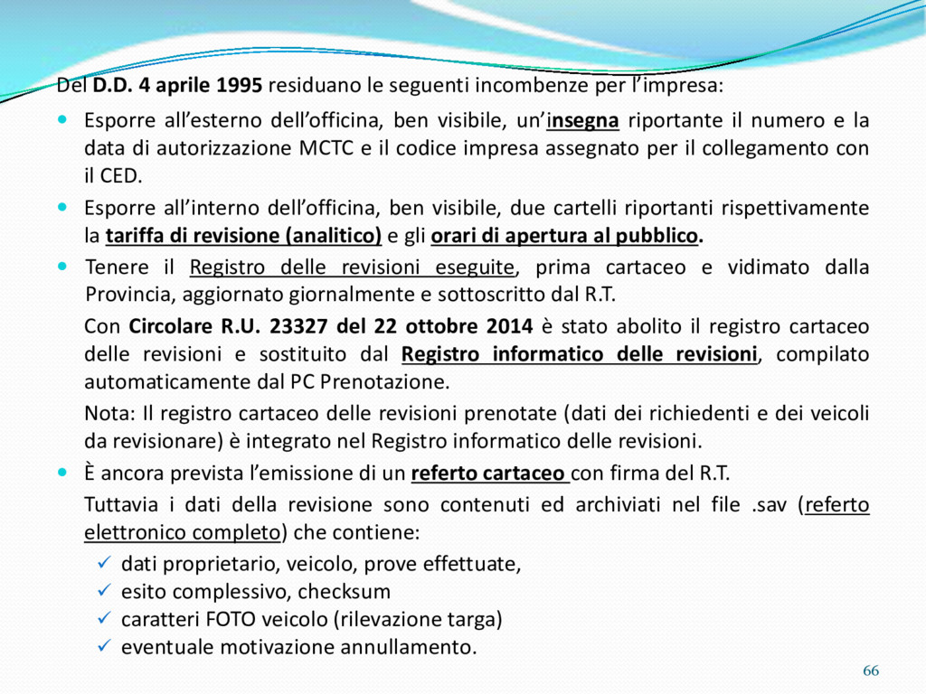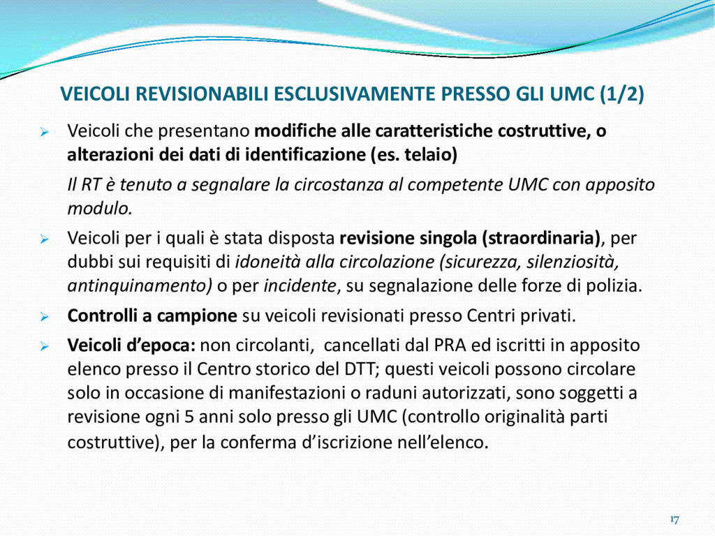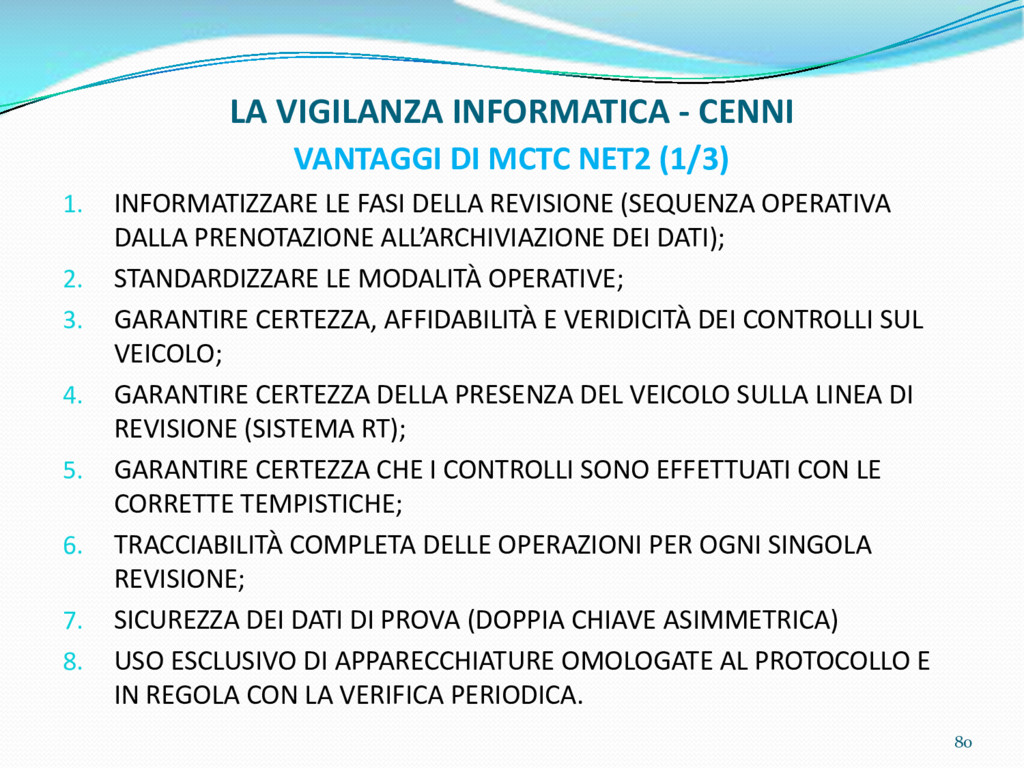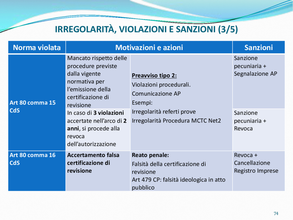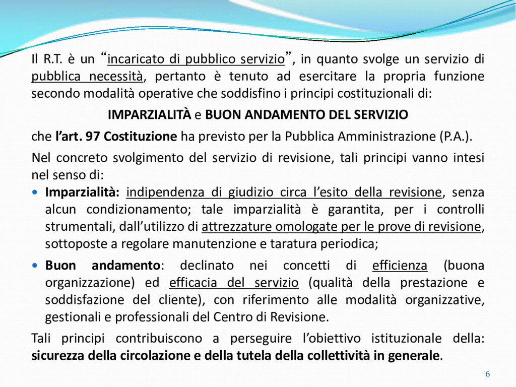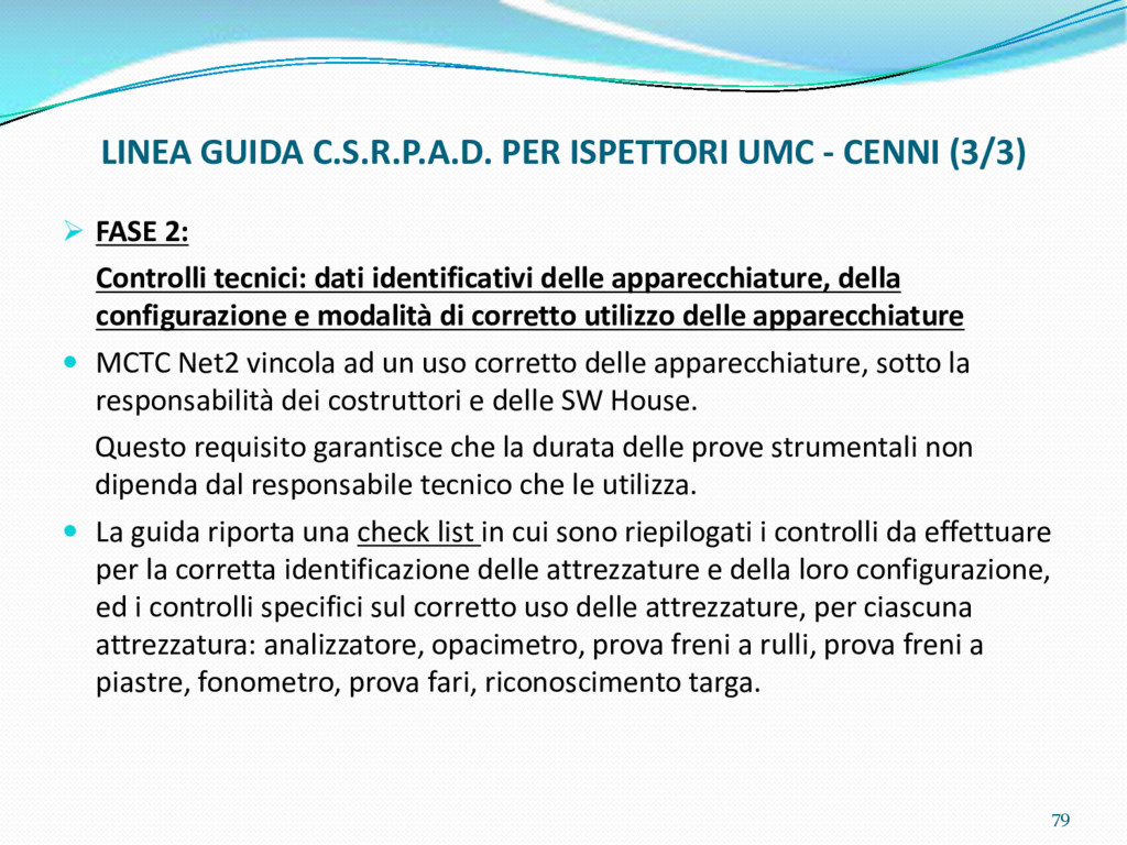 di un sistema di controllo di processo per la qualità del servizio conforme ai requisiti della ISO 9001 riferiti all’attività di revisione: 1. Capacità organizzativa (organigramma, mansionario ecc.) 2. Definizione e controllo del processo di revisione (procedura per le operazioni di revisione, istruzioni operative, flussogrammi, gestione situazioni non conformi ecc.) 3. Qualificazione del personale (formazione e aggiornamento, conoscenza delle normative di legge, competenza professionale, conoscenza evoluzione tecnica dell’autoveicolo, capacità di giudizio ecc.) 4. Apparecchiature di prova (condizioni d’impiego, stato d’uso, conservazione in ambiente non idoneo, libretto d’uso e manutenzione ecc.). 5. Taratura e controllo (vidimazione libretti metrologici, manutenzioni programmate ecc.) 6. Gestione della documentazione e delle registrazioni (procedure e modulistica, registri, corretta conoscenza e gestione degli interessati, archiviazione, pronta reperibilità ecc.) 7. Gestione dei veicoli (procedura CED prenotazione, registro revisioni ecc.) 8. Rapporti con i clienti (esposizione tariffario, informazioni fornite, trasparenza del servizio) 9. Misurazioni-analisi-miglioramento (soddisfazione cliente, gestione delle NC, dei reclami, efficienza/operatività della linea, riduzione inefficienze ecc.) 10. Sicurezza del posto di lavoro (ai sensi del D. Lgs 81/2008: DVR, piano di evacuazione, dotazioni antinfortunistiche, prevenzione incendi, igiene ambiente lavoro ecc.) 71