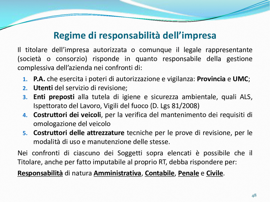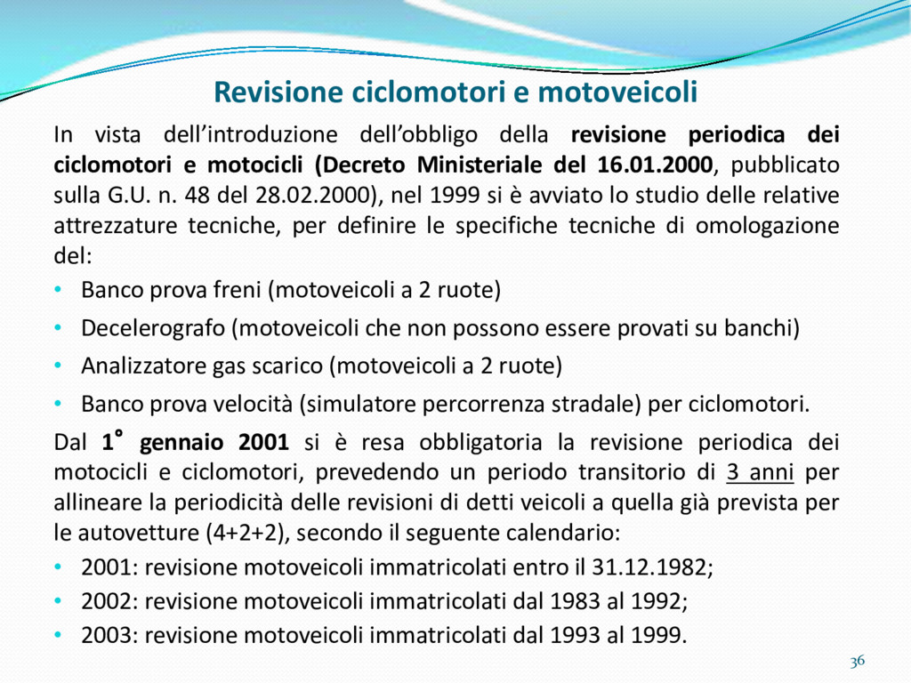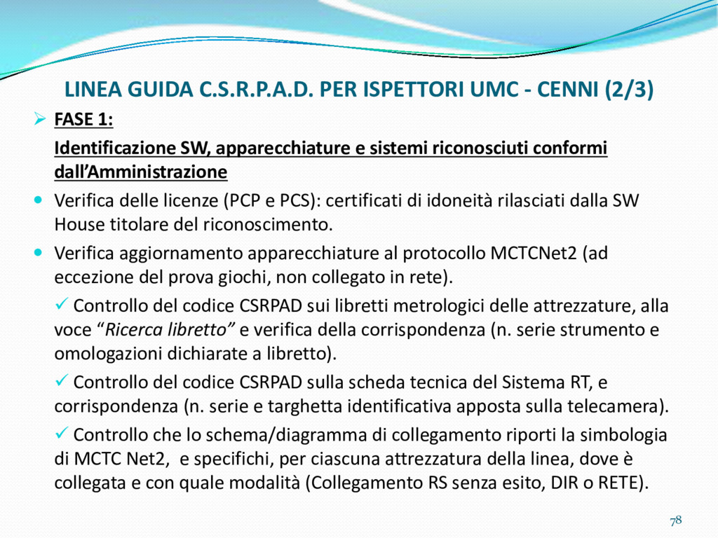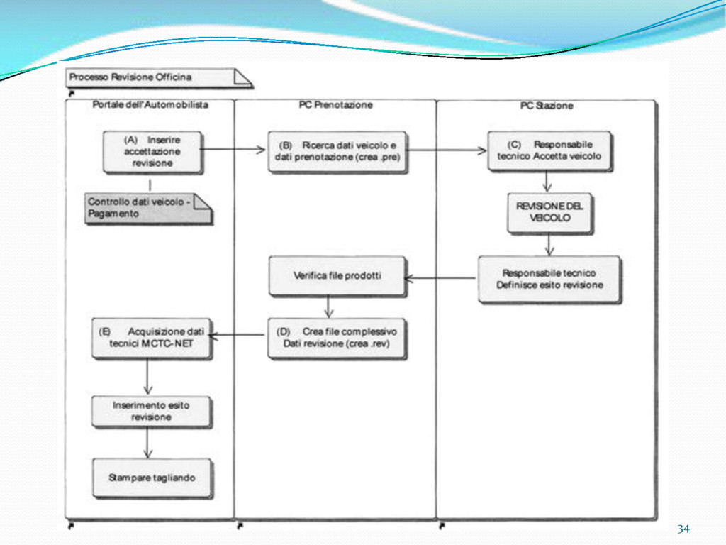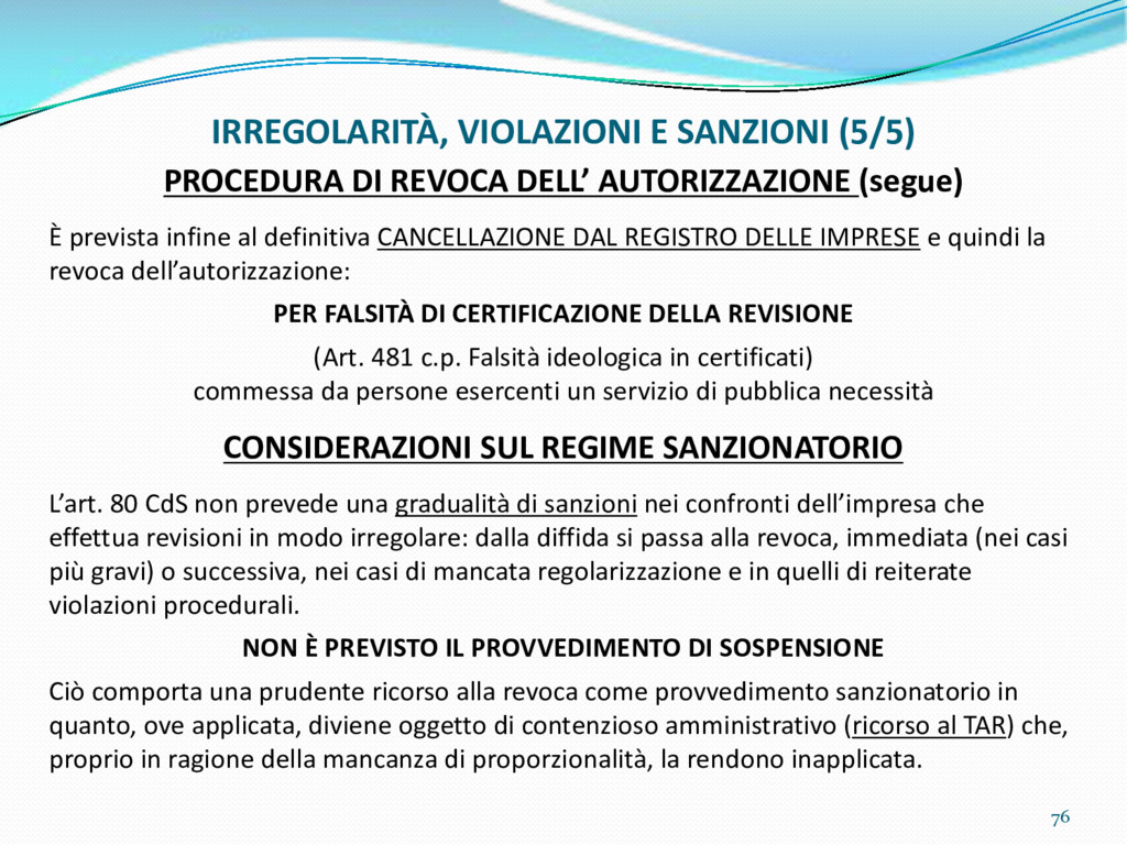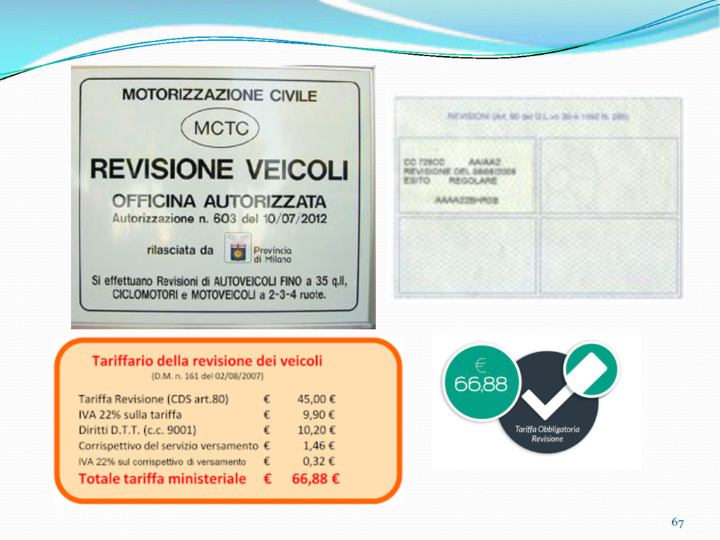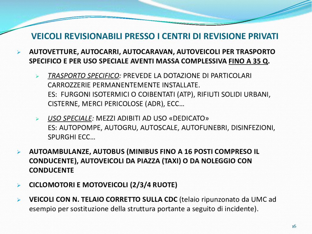di un sistema di controllo di processo per la qualità del servizio conforme ai requisiti della ISO 9001 riferiti all’attività di revisione: 1. Capacità organizzativa (organigramma, mansionario ecc.) 2. Definizione e controllo del processo di revisione (procedura per le operazioni di revisione, istruzioni operative, flussogrammi, gestione situazioni non conformi ecc.) 3. Qualificazione del personale (formazione e aggiornamento, conoscenza delle normative di legge, competenza professionale, conoscenza evoluzione tecnica dell’autoveicolo, capacità di giudizio ecc.) 4. Apparecchiature di prova (condizioni d’impiego, stato d’uso, conservazione in ambiente non idoneo, libretto d’uso e manutenzione ecc.). 5. Taratura e controllo (vidimazione libretti metrologici, manutenzioni programmate ecc.) 6. Gestione della documentazione e delle registrazioni (procedure e modulistica, registri, corretta conoscenza e gestione degli interessati, archiviazione, pronta reperibilità ecc.) 7. Gestione dei veicoli (procedura CED prenotazione, registro revisioni ecc.) 8. Rapporti con i clienti (esposizione tariffario, informazioni fornite, trasparenza del servizio) 9. Misurazioni-analisi-miglioramento (soddisfazione cliente, gestione delle NC, dei reclami, efficienza/operatività della linea, riduzione inefficienze ecc.) 10. Sicurezza del posto di lavoro (ai sensi del D. Lgs 81/2008: DVR, piano di evacuazione, dotazioni antinfortunistiche, prevenzione incendi, igiene ambiente lavoro ecc.) 71