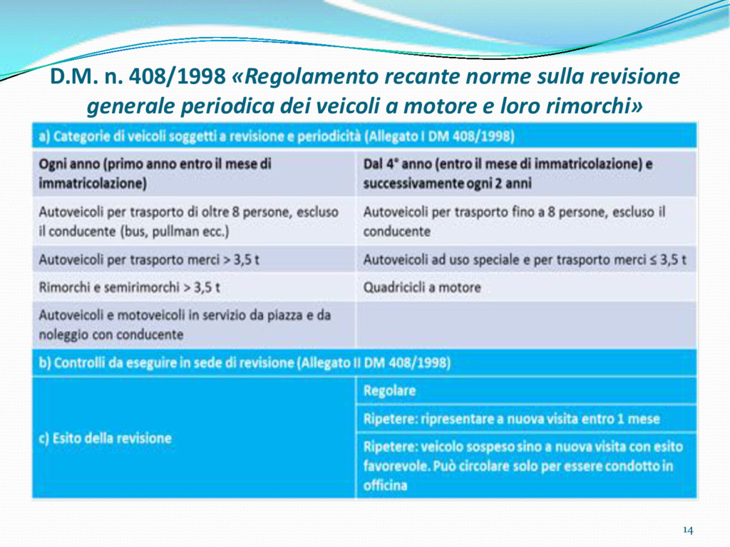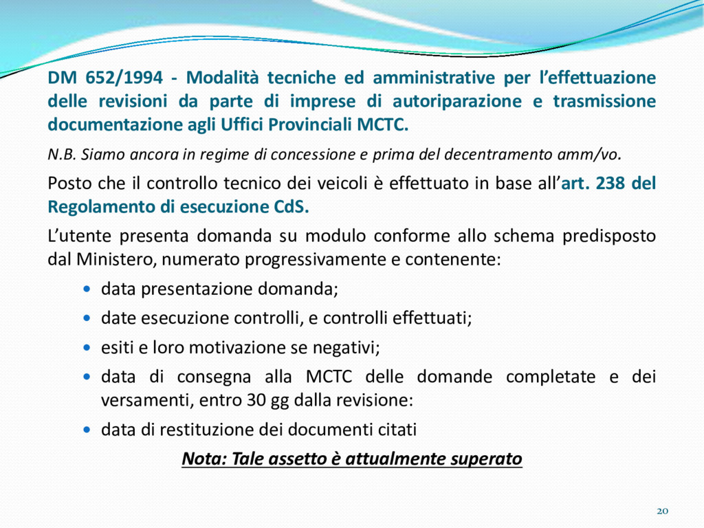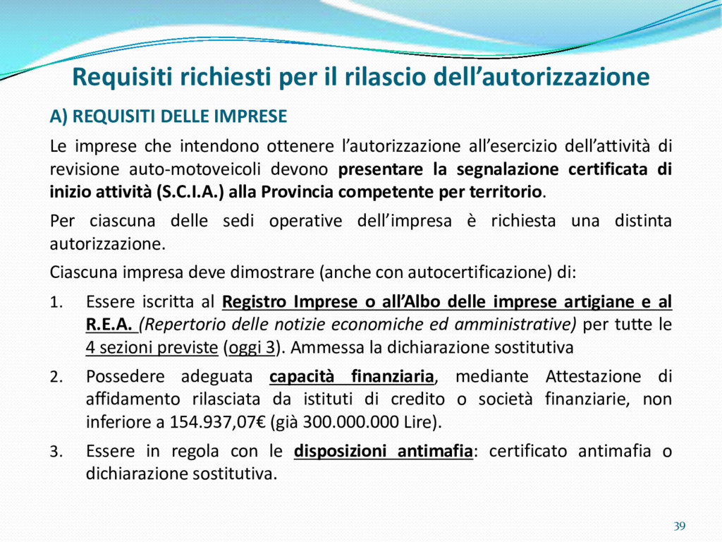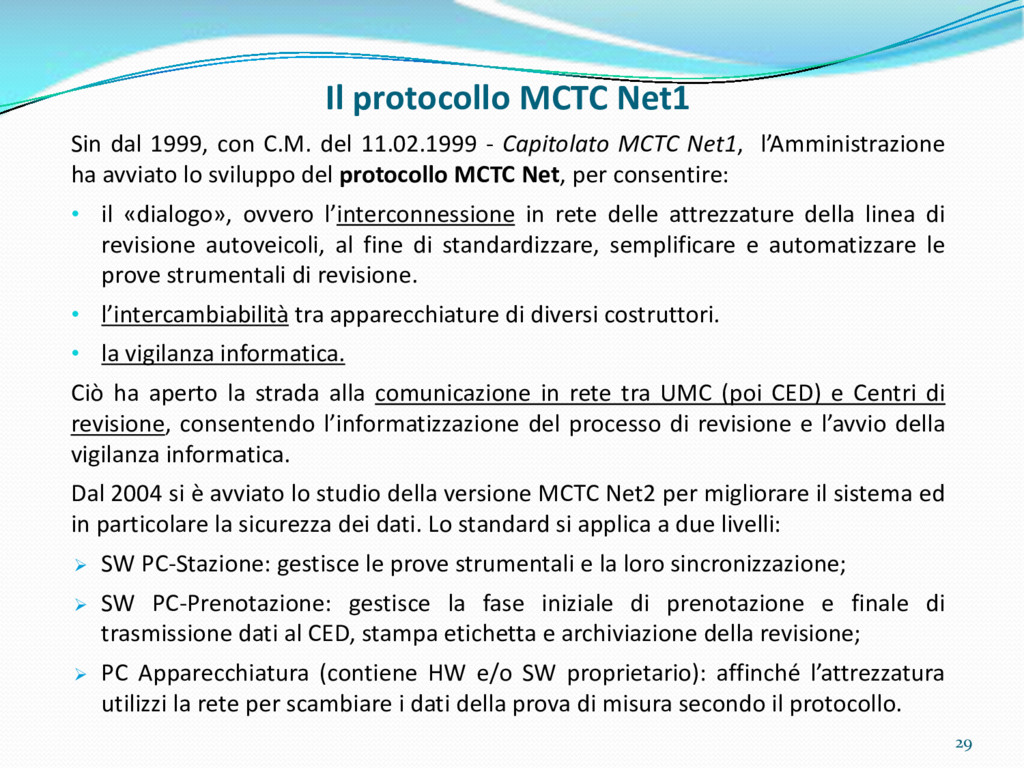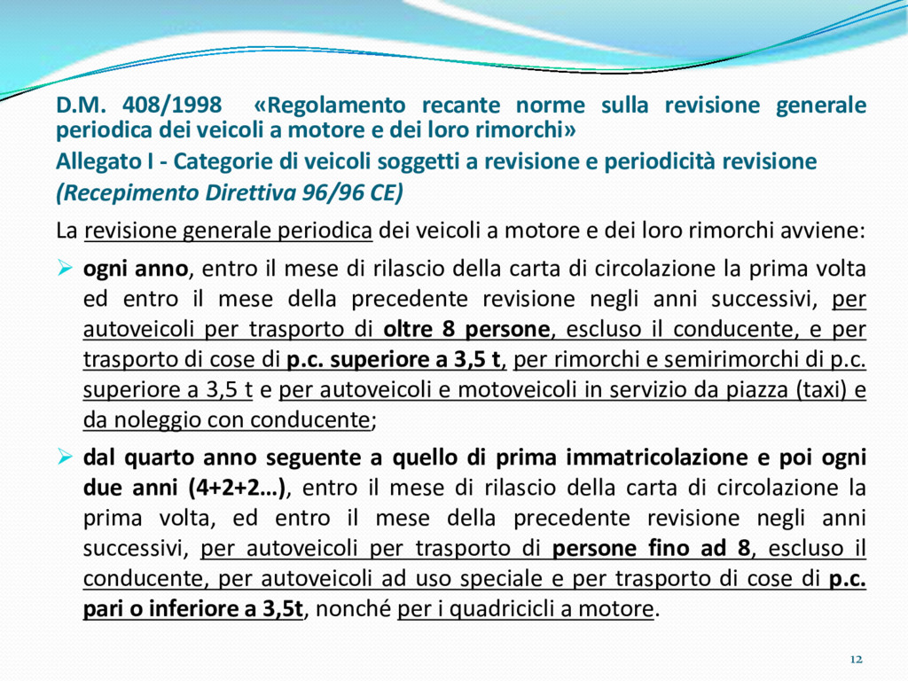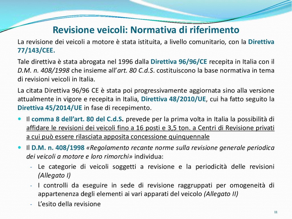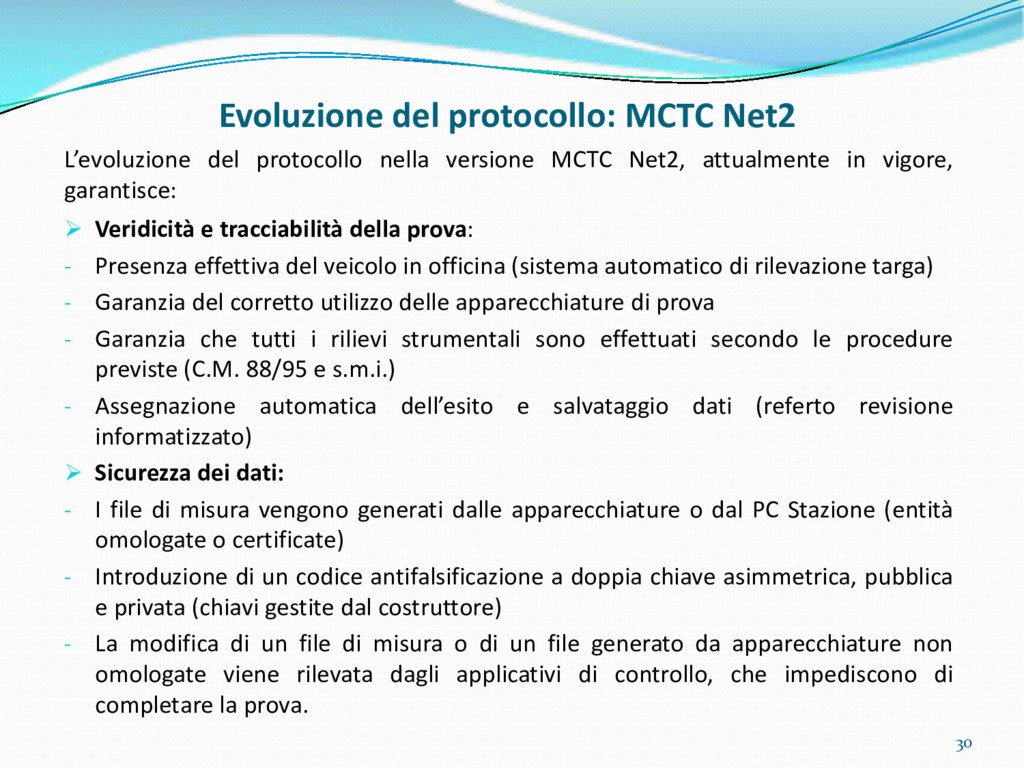 di un sistema di controllo di processo per la qualità del servizio conforme ai requisiti della ISO 9001 riferiti all’attività di revisione: 1. Capacità organizzativa (organigramma, mansionario ecc.) 2. Definizione e controllo del processo di revisione (procedura per le operazioni di revisione, istruzioni operative, flussogrammi, gestione situazioni non conformi ecc.) 3. Qualificazione del personale (formazione e aggiornamento, conoscenza delle normative di legge, competenza professionale, conoscenza evoluzione tecnica dell’autoveicolo, capacità di giudizio ecc.) 4. Apparecchiature di prova (condizioni d’impiego, stato d’uso, conservazione in ambiente non idoneo, libretto d’uso e manutenzione ecc.). 5. Taratura e controllo (vidimazione libretti metrologici, manutenzioni programmate ecc.) 6. Gestione della documentazione e delle registrazioni (procedure e modulistica, registri, corretta conoscenza e gestione degli interessati, archiviazione, pronta reperibilità ecc.) 7. Gestione dei veicoli (procedura CED prenotazione, registro revisioni ecc.) 8. Rapporti con i clienti (esposizione tariffario, informazioni fornite, trasparenza del servizio) 9. Misurazioni-analisi-miglioramento (soddisfazione cliente, gestione delle NC, dei reclami, efficienza/operatività della linea, riduzione inefficienze ecc.) 10. Sicurezza del posto di lavoro (ai sensi del D. Lgs 81/2008: DVR, piano di evacuazione, dotazioni antinfortunistiche, prevenzione incendi, igiene ambiente lavoro ecc.) 71