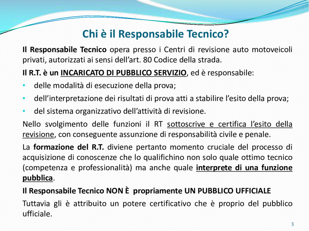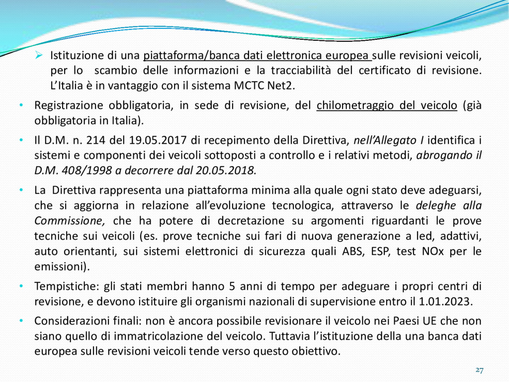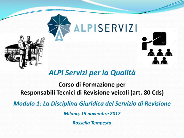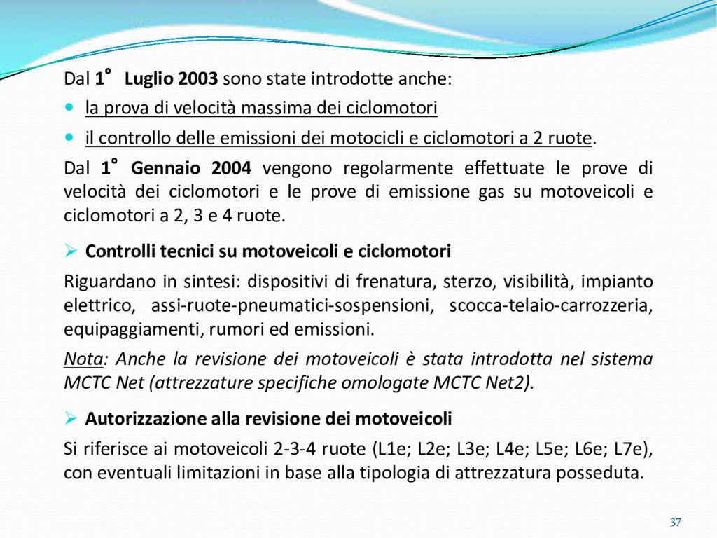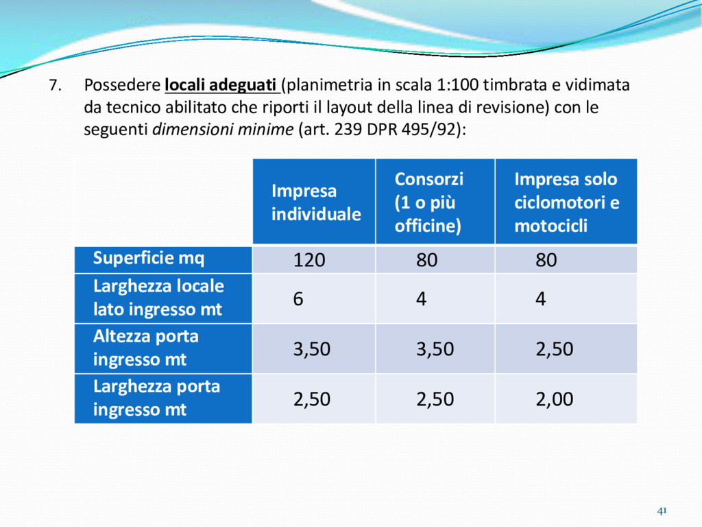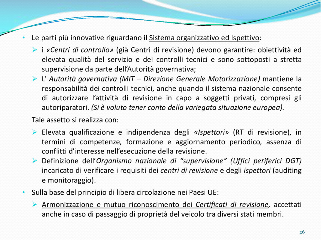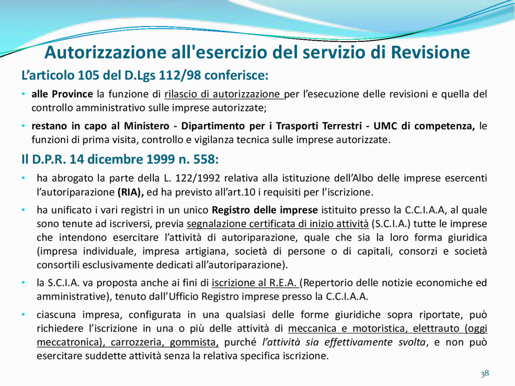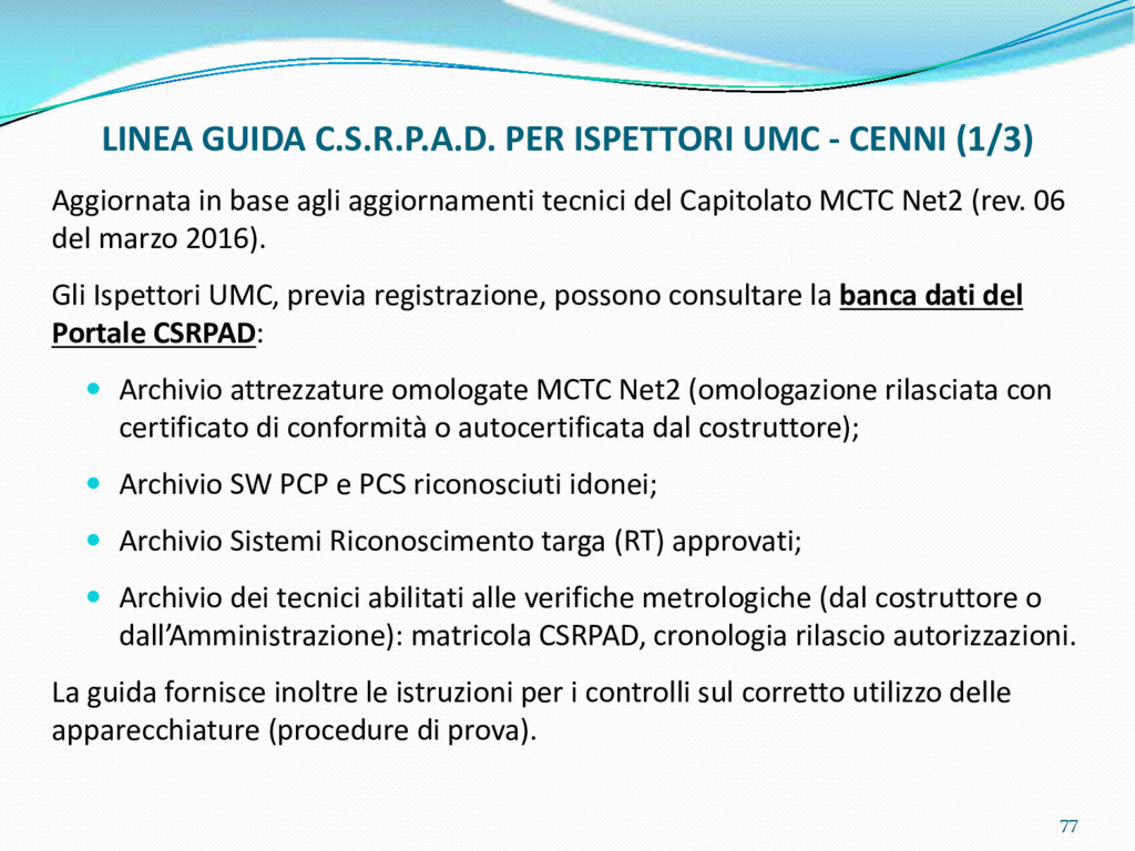 di un sistema di controllo di processo per la qualità del servizio conforme ai requisiti della ISO 9001 riferiti all’attività di revisione: 1. Capacità organizzativa (organigramma, mansionario ecc.) 2. Definizione e controllo del processo di revisione (procedura per le operazioni di revisione, istruzioni operative, flussogrammi, gestione situazioni non conformi ecc.) 3. Qualificazione del personale (formazione e aggiornamento, conoscenza delle normative di legge, competenza professionale, conoscenza evoluzione tecnica dell’autoveicolo, capacità di giudizio ecc.) 4. Apparecchiature di prova (condizioni d’impiego, stato d’uso, conservazione in ambiente non idoneo, libretto d’uso e manutenzione ecc.). 5. Taratura e controllo (vidimazione libretti metrologici, manutenzioni programmate ecc.) 6. Gestione della documentazione e delle registrazioni (procedure e modulistica, registri, corretta conoscenza e gestione degli interessati, archiviazione, pronta reperibilità ecc.) 7. Gestione dei veicoli (procedura CED prenotazione, registro revisioni ecc.) 8. Rapporti con i clienti (esposizione tariffario, informazioni fornite, trasparenza del servizio) 9. Misurazioni-analisi-miglioramento (soddisfazione cliente, gestione delle NC, dei reclami, efficienza/operatività della linea, riduzione inefficienze ecc.) 10. Sicurezza del posto di lavoro (ai sensi del D. Lgs 81/2008: DVR, piano di evacuazione, dotazioni antinfortunistiche, prevenzione incendi, igiene ambiente lavoro ecc.) 71