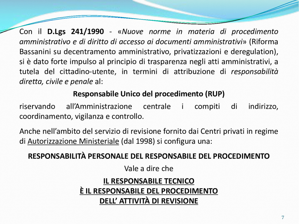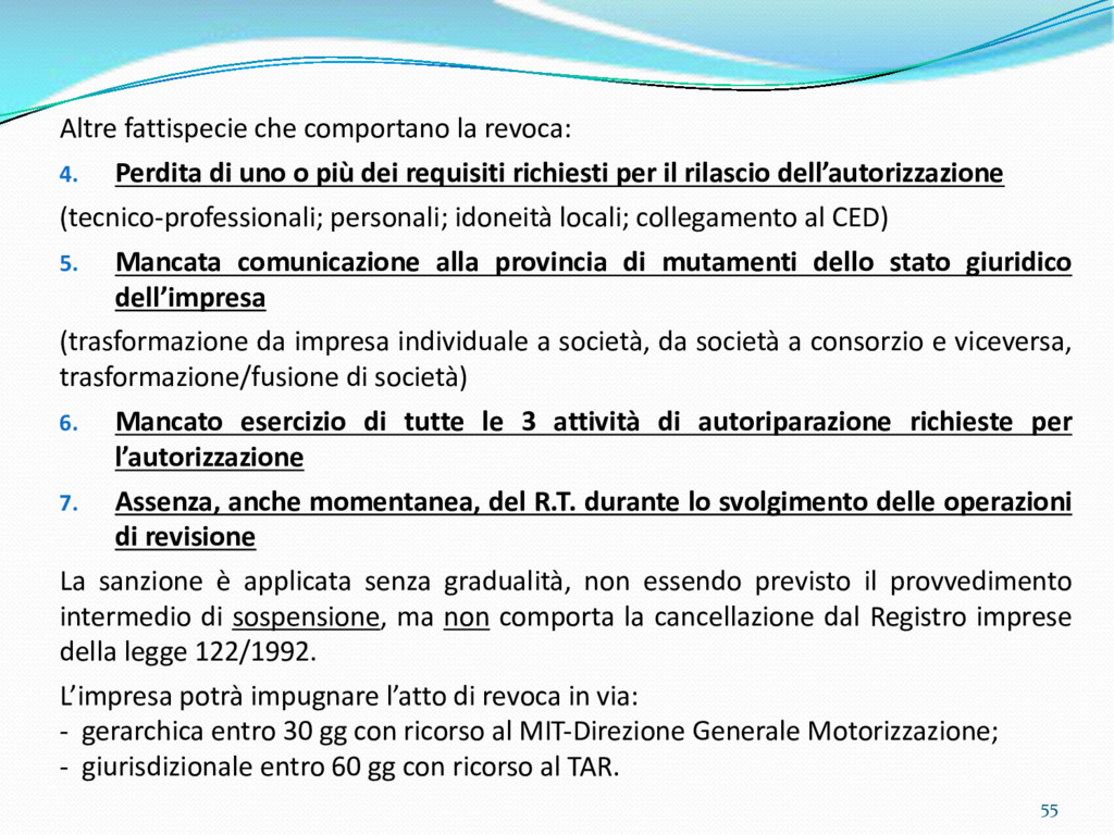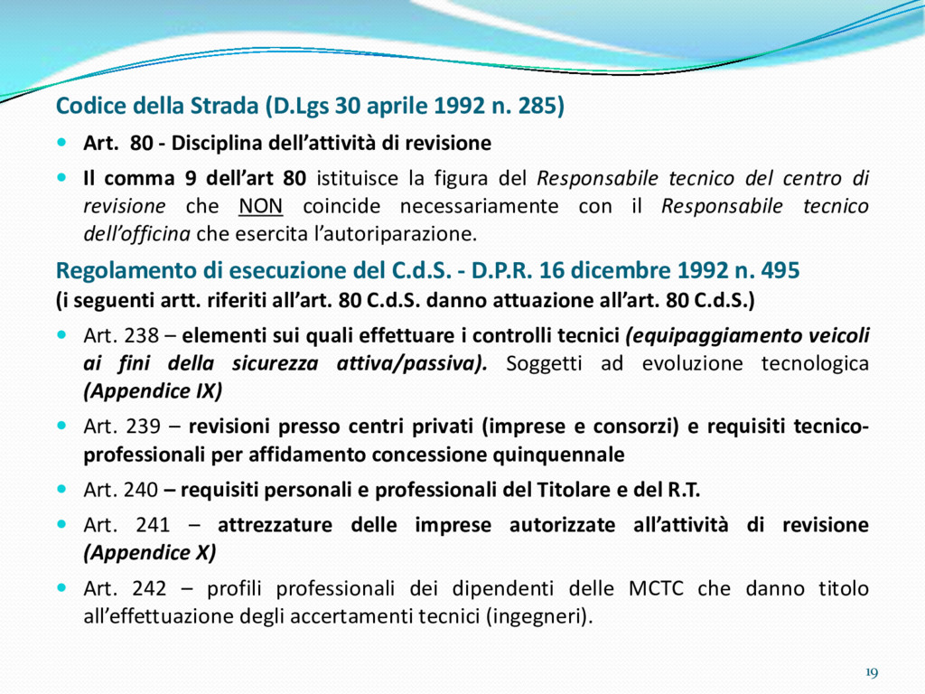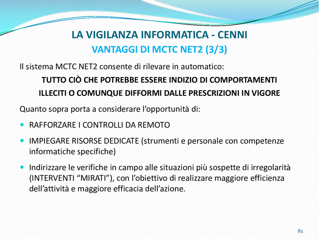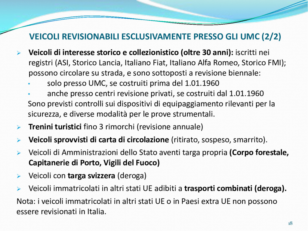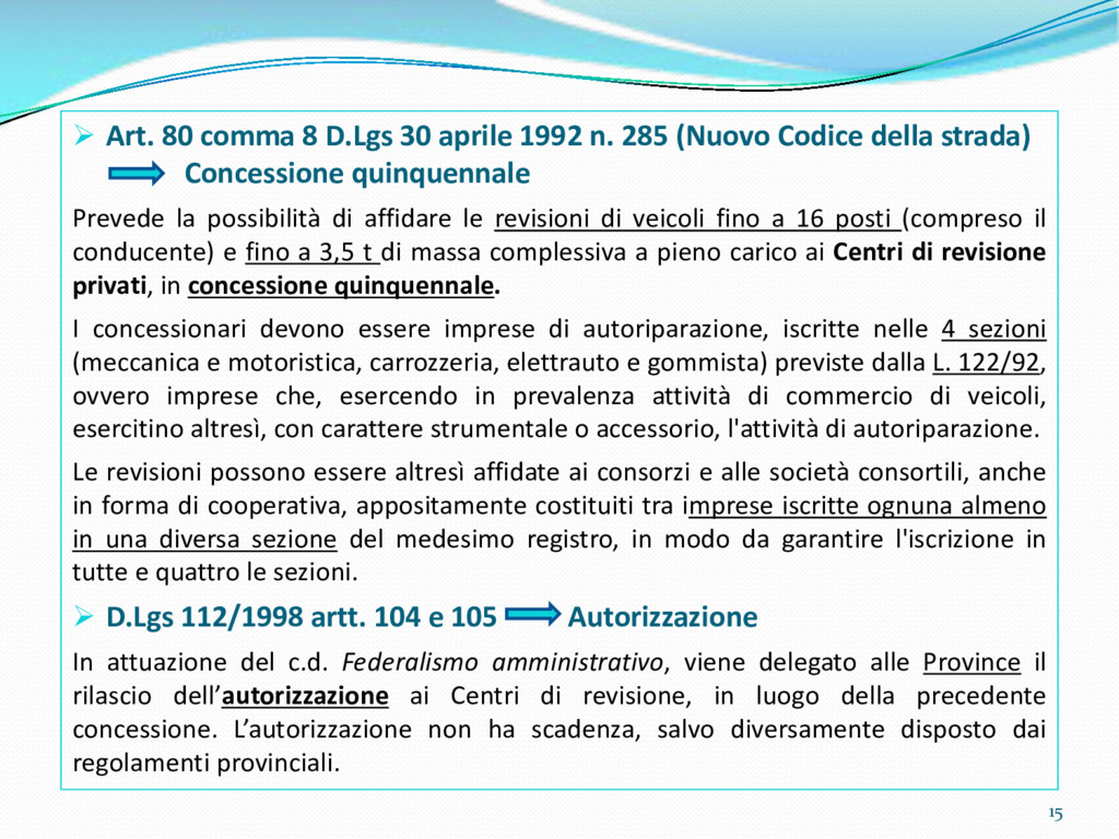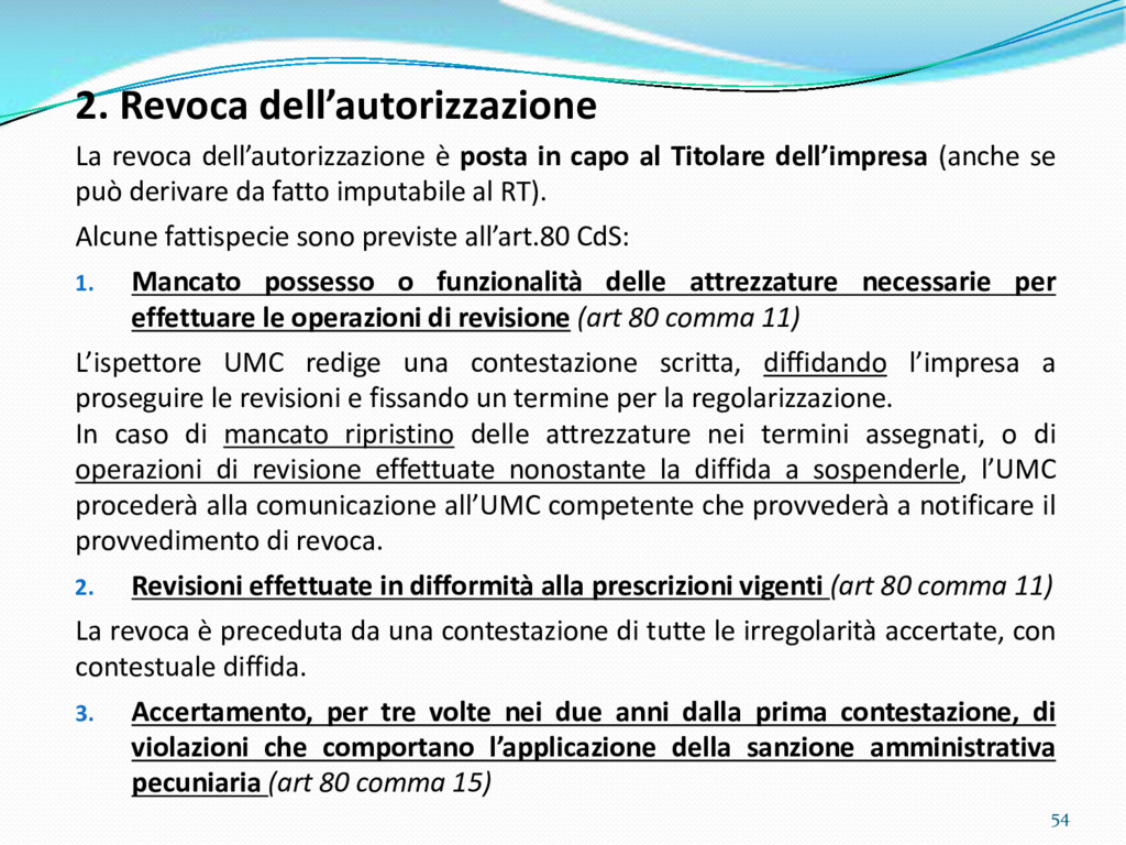 di un sistema di controllo di processo per la qualità del servizio conforme ai requisiti della ISO 9001 riferiti all’attività di revisione: 1. Capacità organizzativa (organigramma, mansionario ecc.) 2. Definizione e controllo del processo di revisione (procedura per le operazioni di revisione, istruzioni operative, flussogrammi, gestione situazioni non conformi ecc.) 3. Qualificazione del personale (formazione e aggiornamento, conoscenza delle normative di legge, competenza professionale, conoscenza evoluzione tecnica dell’autoveicolo, capacità di giudizio ecc.) 4. Apparecchiature di prova (condizioni d’impiego, stato d’uso, conservazione in ambiente non idoneo, libretto d’uso e manutenzione ecc.). 5. Taratura e controllo (vidimazione libretti metrologici, manutenzioni programmate ecc.) 6. Gestione della documentazione e delle registrazioni (procedure e modulistica, registri, corretta conoscenza e gestione degli interessati, archiviazione, pronta reperibilità ecc.) 7. Gestione dei veicoli (procedura CED prenotazione, registro revisioni ecc.) 8. Rapporti con i clienti (esposizione tariffario, informazioni fornite, trasparenza del servizio) 9. Misurazioni-analisi-miglioramento (soddisfazione cliente, gestione delle NC, dei reclami, efficienza/operatività della linea, riduzione inefficienze ecc.) 10. Sicurezza del posto di lavoro (ai sensi del D. Lgs 81/2008: DVR, piano di evacuazione, dotazioni antinfortunistiche, prevenzione incendi, igiene ambiente lavoro ecc.) 71