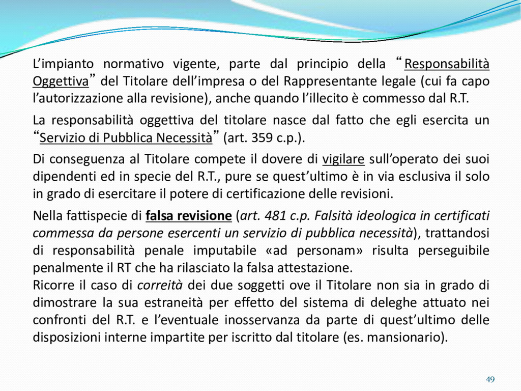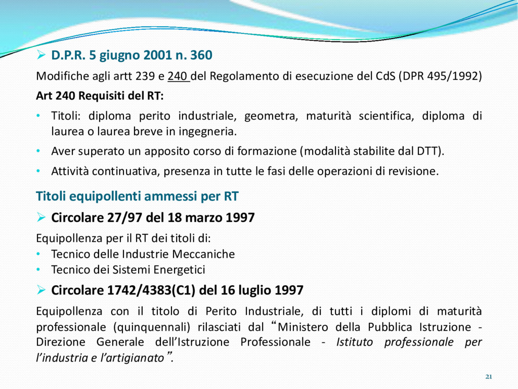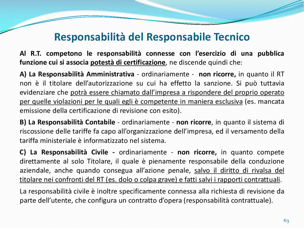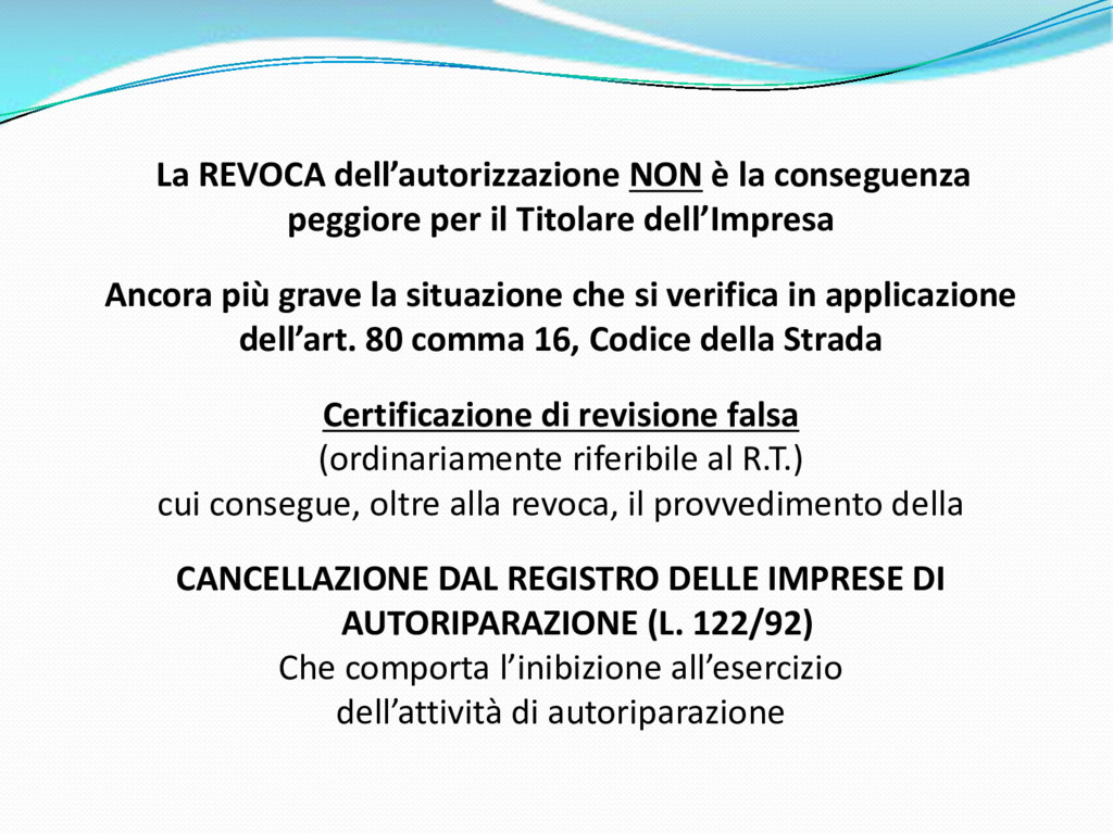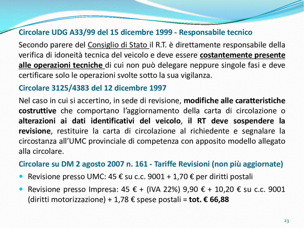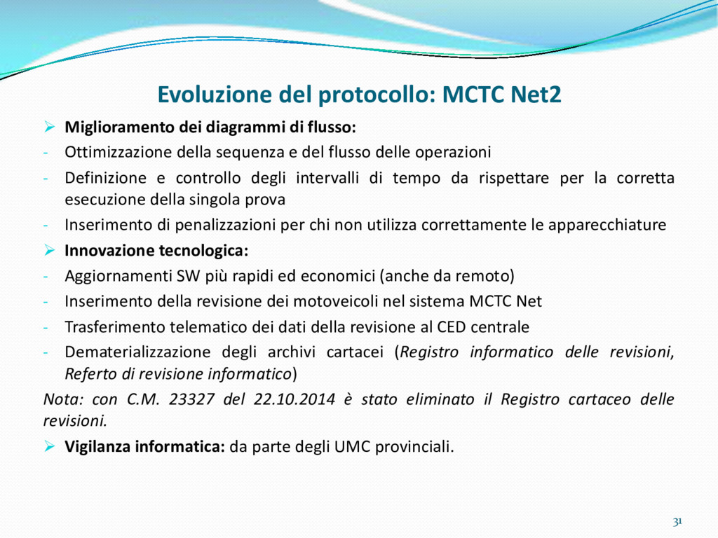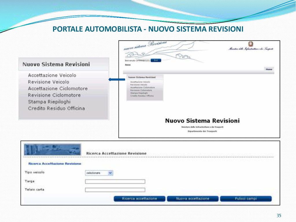 di un sistema di controllo di processo per la qualità del servizio conforme ai requisiti della ISO 9001 riferiti all’attività di revisione: 1. Capacità organizzativa (organigramma, mansionario ecc.) 2. Definizione e controllo del processo di revisione (procedura per le operazioni di revisione, istruzioni operative, flussogrammi, gestione situazioni non conformi ecc.) 3. Qualificazione del personale (formazione e aggiornamento, conoscenza delle normative di legge, competenza professionale, conoscenza evoluzione tecnica dell’autoveicolo, capacità di giudizio ecc.) 4. Apparecchiature di prova (condizioni d’impiego, stato d’uso, conservazione in ambiente non idoneo, libretto d’uso e manutenzione ecc.). 5. Taratura e controllo (vidimazione libretti metrologici, manutenzioni programmate ecc.) 6. Gestione della documentazione e delle registrazioni (procedure e modulistica, registri, corretta conoscenza e gestione degli interessati, archiviazione, pronta reperibilità ecc.) 7. Gestione dei veicoli (procedura CED prenotazione, registro revisioni ecc.) 8. Rapporti con i clienti (esposizione tariffario, informazioni fornite, trasparenza del servizio) 9. Misurazioni-analisi-miglioramento (soddisfazione cliente, gestione delle NC, dei reclami, efficienza/operatività della linea, riduzione inefficienze ecc.) 10. Sicurezza del posto di lavoro (ai sensi del D. Lgs 81/2008: DVR, piano di evacuazione, dotazioni antinfortunistiche, prevenzione incendi, igiene ambiente lavoro ecc.) 71