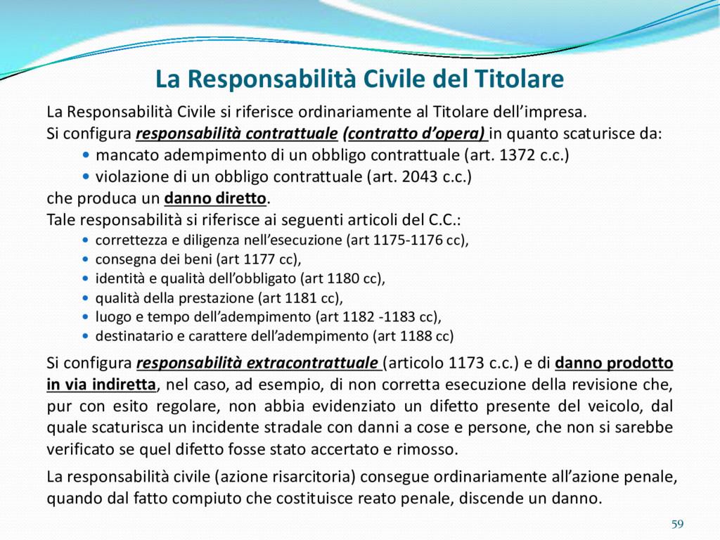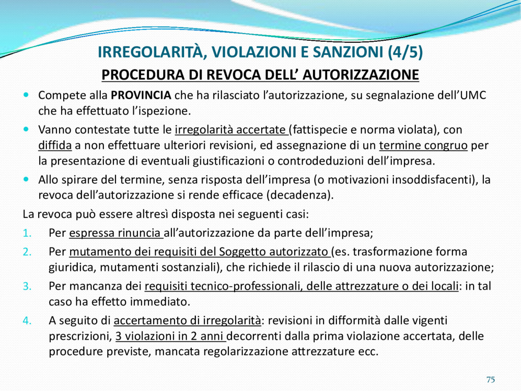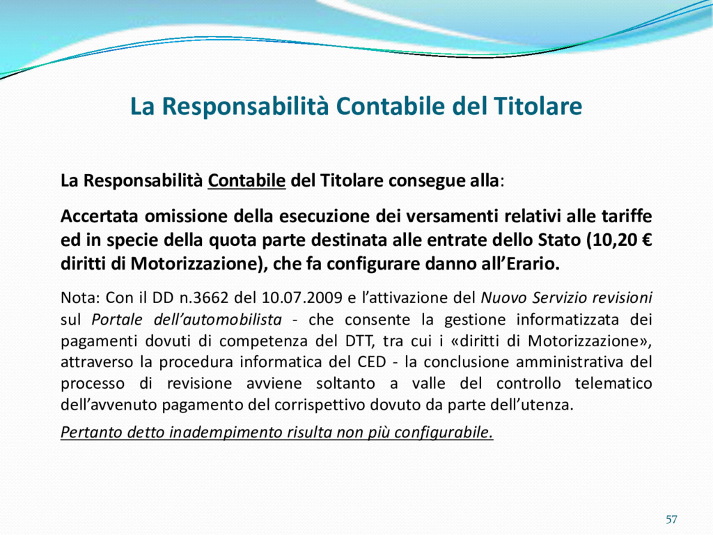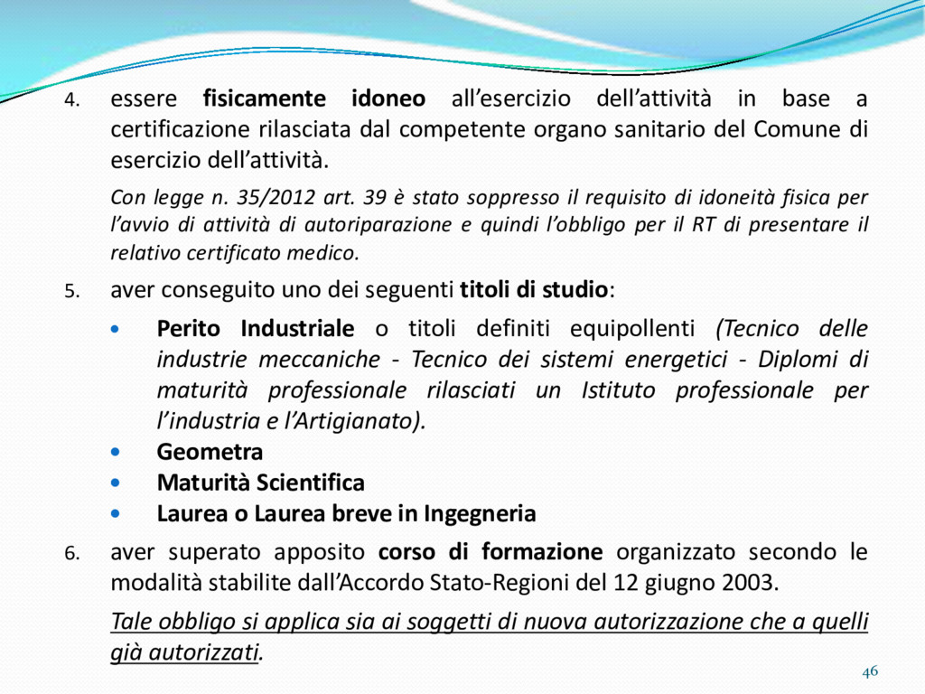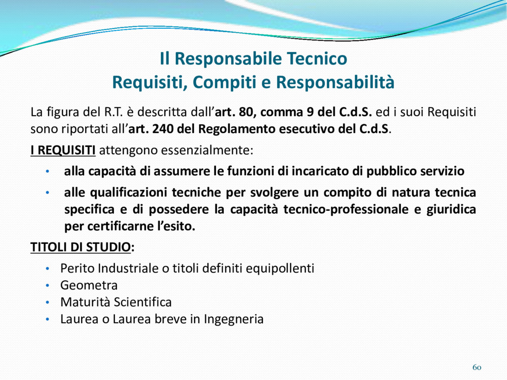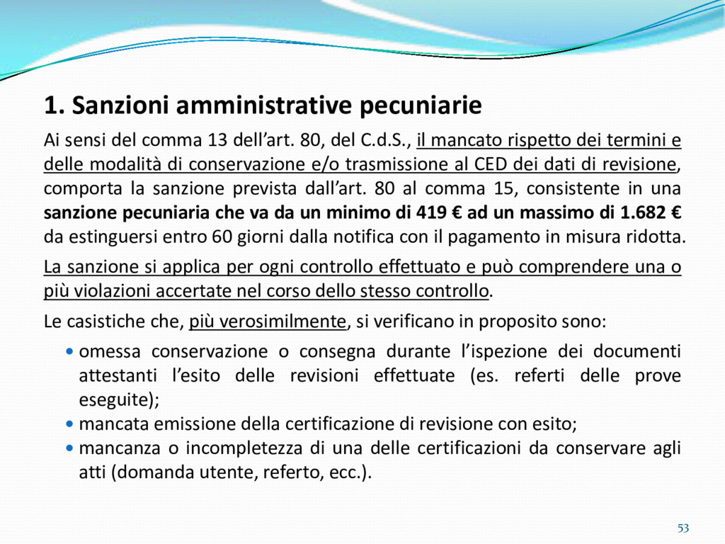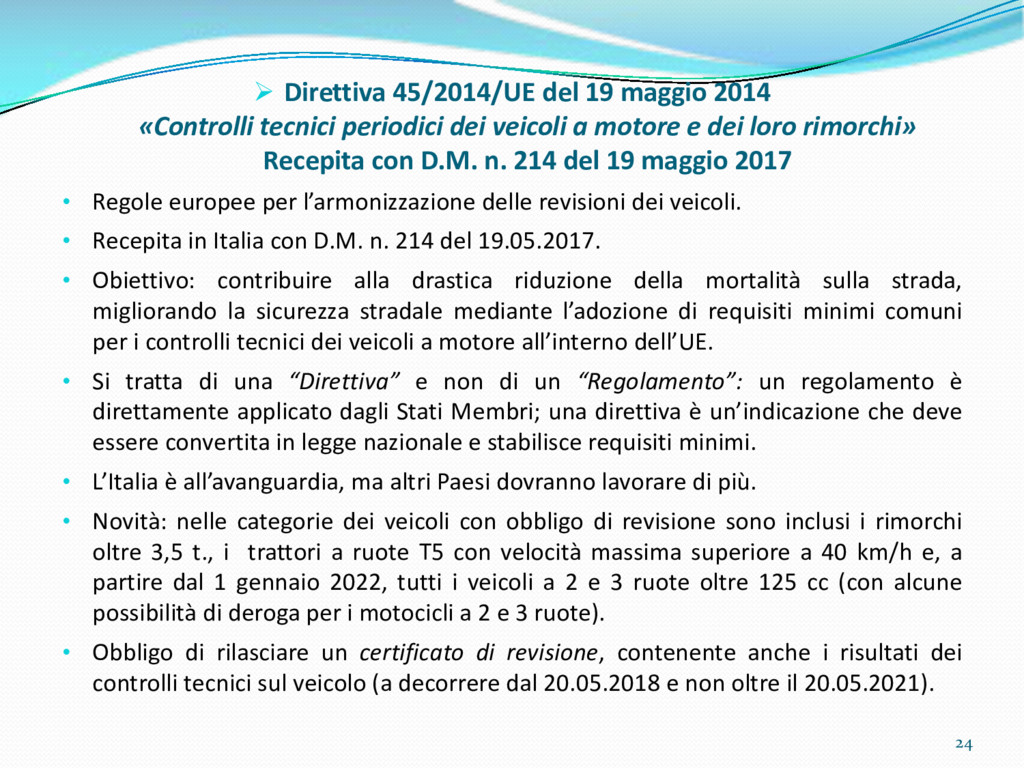 di un sistema di controllo di processo per la qualità del servizio conforme ai requisiti della ISO 9001 riferiti all’attività di revisione: 1. Capacità organizzativa (organigramma, mansionario ecc.) 2. Definizione e controllo del processo di revisione (procedura per le operazioni di revisione, istruzioni operative, flussogrammi, gestione situazioni non conformi ecc.) 3. Qualificazione del personale (formazione e aggiornamento, conoscenza delle normative di legge, competenza professionale, conoscenza evoluzione tecnica dell’autoveicolo, capacità di giudizio ecc.) 4. Apparecchiature di prova (condizioni d’impiego, stato d’uso, conservazione in ambiente non idoneo, libretto d’uso e manutenzione ecc.). 5. Taratura e controllo (vidimazione libretti metrologici, manutenzioni programmate ecc.) 6. Gestione della documentazione e delle registrazioni (procedure e modulistica, registri, corretta conoscenza e gestione degli interessati, archiviazione, pronta reperibilità ecc.) 7. Gestione dei veicoli (procedura CED prenotazione, registro revisioni ecc.) 8. Rapporti con i clienti (esposizione tariffario, informazioni fornite, trasparenza del servizio) 9. Misurazioni-analisi-miglioramento (soddisfazione cliente, gestione delle NC, dei reclami, efficienza/operatività della linea, riduzione inefficienze ecc.) 10. Sicurezza del posto di lavoro (ai sensi del D. Lgs 81/2008: DVR, piano di evacuazione, dotazioni antinfortunistiche, prevenzione incendi, igiene ambiente lavoro ecc.) 71