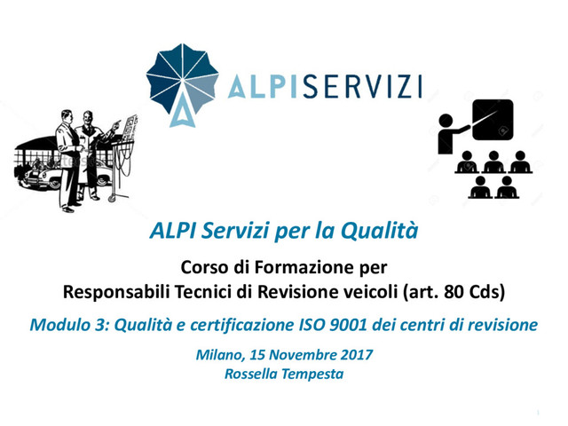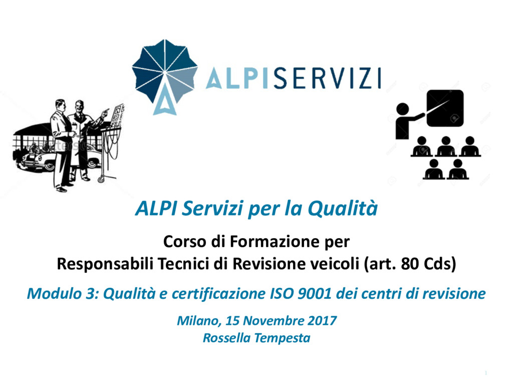 per Responsabili Tecnici di Revisione veicoli (art. 80 Cds) Modulo 3: Qualità e certificazione ISO 9001 dei centri di revisione Milano, 15 Novembre 2017 Rossella Tempesta