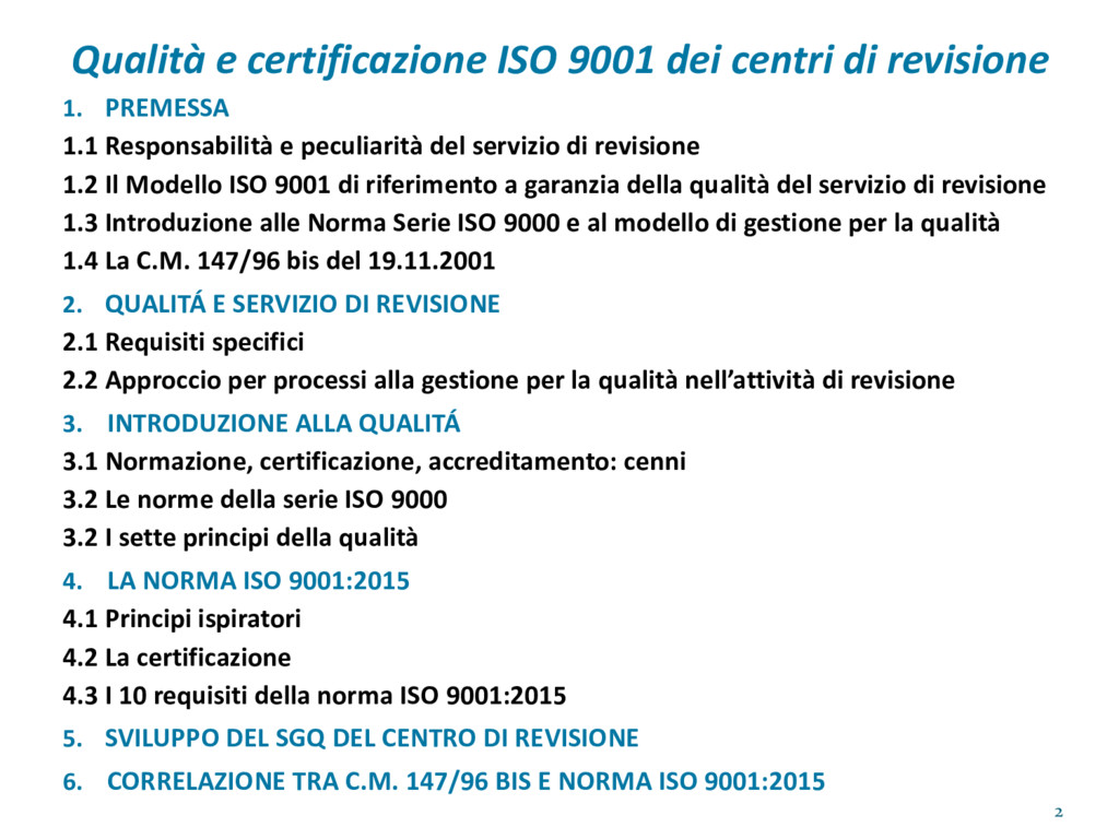 PREMESSA 1.1 Responsabilità e peculiarità del servizio di revisione 1.2 Il Modello ISO 9001 di riferimento a garanzia della qualità del servizio di revisione 1.3 Introduzione alle Norma Serie ISO 9000 e al modello di gestione per la qualità 1.4 La C.M. 147/96 bis del 19.11.2001 2. QUALITÁ E SERVIZIO DI REVISIONE 2.1 Requisiti specifici 2.2 Approccio per processi alla gestione per la qualità nell’attività di revisione 3. INTRODUZIONE ALLA QUALITÁ 3.1 Normazione, certificazione, accreditamento: cenni 3.2 Le norme della serie ISO 9000 3.2 I sette principi della qualità 4. LA NORMA ISO 9001:2015 4.1 Principi ispiratori 4.2 La certificazione 4.3 I 10 requisiti della norma ISO 9001:2015 5. SVILUPPO DEL SGQ DEL CENTRO DI REVISIONE 6. CORRELAZIONE TRA C.M. 147/96 BIS E NORMA ISO 9001:2015 2
