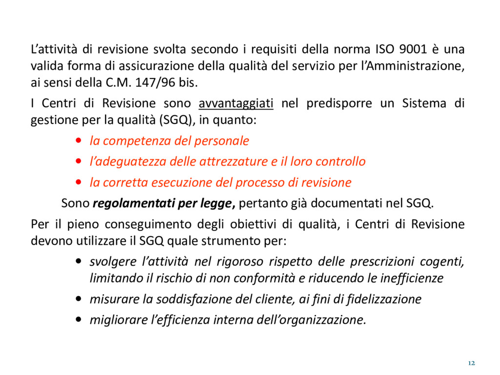 all’effettuazione della verifica ispettiva per l’accertamento della adeguatezza dell’attività di revisione» Introduce la metodologia della Qualità nei Centri di revisione, a garanzia della qualità del servizio, laddove il processo operativo (processo di revisione): Ø È svolto sotto controllo Ø Risulta adeguatamente documentato Ø Lista di riscontro-Parte II «Verifica dell’esistenza di una organizzazione aziendale e di un sistema di controllo di processo per la qualità del servizio conforme ai requisiti della ISO 9001 riferiti all’attività di revisione» Introduce i requisiti della ISO 9001 in termini di: Ø Capacità organizzativa Ø Definizione e controllo del processo di revisione Ø Qualificazione del personale Ø Apparecchiature di prova, taratura e controllo Ø Gestione dei documenti e delle registrazioni Ø Gestione dei veicoli Ø Rapporti con i clienti 11