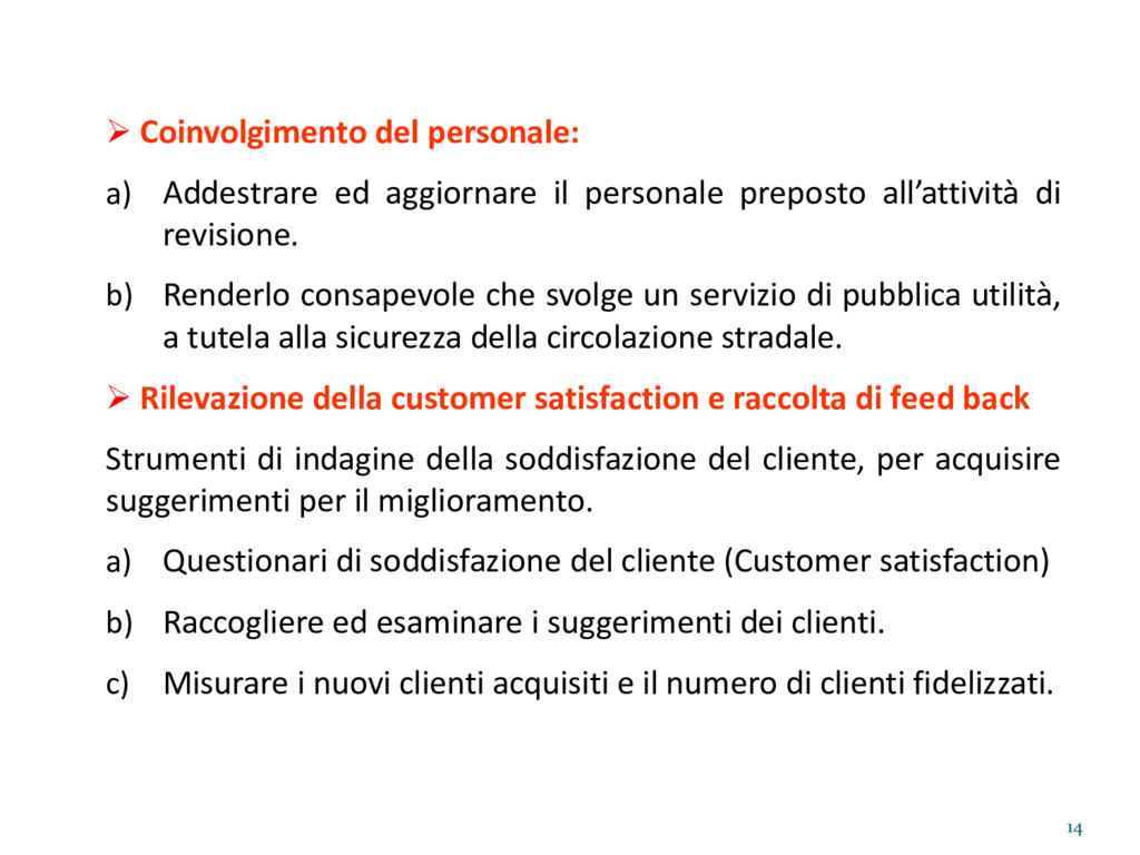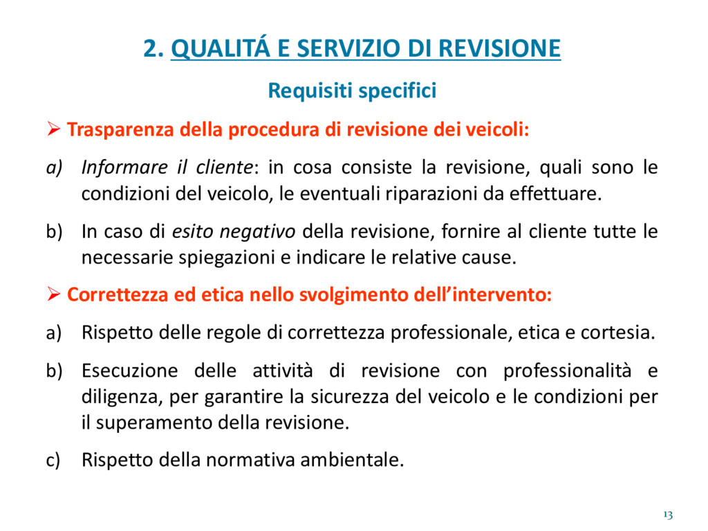 della procedura di revisione dei veicoli: a) Informare il cliente: in cosa consiste la revisione, quali sono le condizioni del veicolo, le eventuali riparazioni da effettuare. b) In caso di esito negativo della revisione, fornire al cliente tutte le necessarie spiegazioni e indicare le relative cause. Ø Correttezza ed etica nello svolgimento dell’intervento: a) Rispetto delle regole di correttezza professionale, etica e cortesia. b) Esecuzione delle attività di revisione con professionalità e diligenza, per garantire la sicurezza del veicolo e le condizioni per il superamento della revisione. c) Rispetto della normativa ambientale. 13