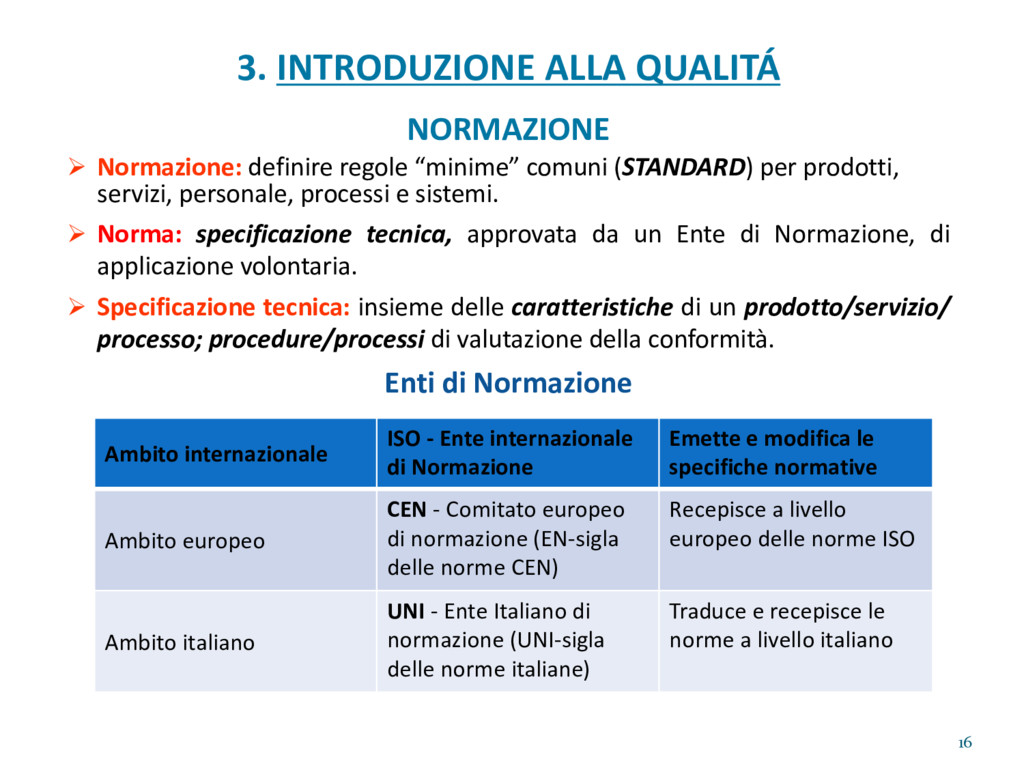 comuni (STANDARD) per prodotti, servizi, personale, processi e sistemi. Ø Norma: specificazione tecnica, approvata da un Ente di Normazione, di applicazione volontaria. Ø Specificazione tecnica: insieme delle caratteristiche di un prodotto/servizio/ processo; procedure/processi di valutazione della conformità. Enti di Normazione 16 Ambito internazionale ISO - Ente internazionale di Normazione Emette e modifica le specifiche normative Ambito europeo CEN - Comitato europeo di normazione (EN-sigla delle norme CEN) Recepisce a livello europeo delle norme ISO Ambito italiano UNI - Ente Italiano di normazione (UNI-sigla delle norme italiane) Traduce e recepisce le norme a livello italiano